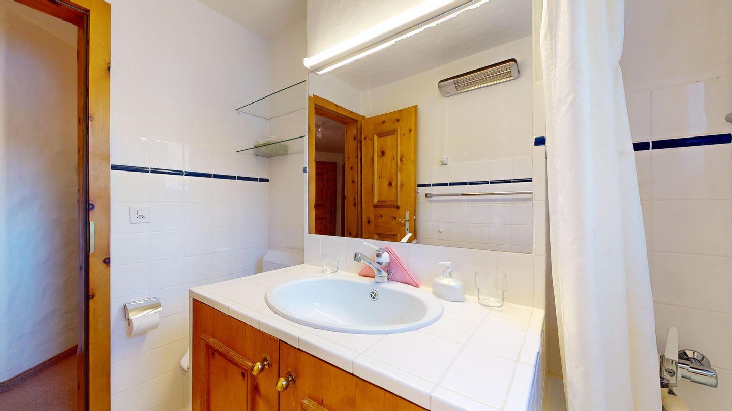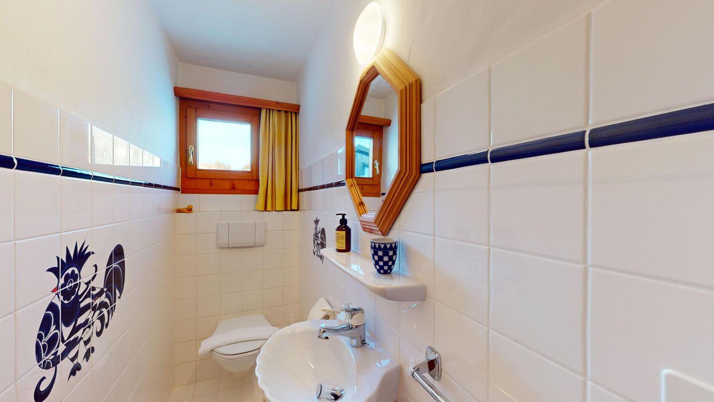 3-Zimmerwohnung im Erdgeschoss, Eingang mit Garderobe, Wohnzimmer mit Essecke, Cheminée und Ausgang auf den Sitzplatz. Geschlossene Küche mit Chicco d'Oro Kaffeemaschine. Zwei Doppelzimmer. Badezimmer mit Badewanne, Waschbecken, WC. Gäste-WC. Gemeinschaftliche Waschküche. Garagenplatz (Höhe 1.95 m, Breite 2.35 m)