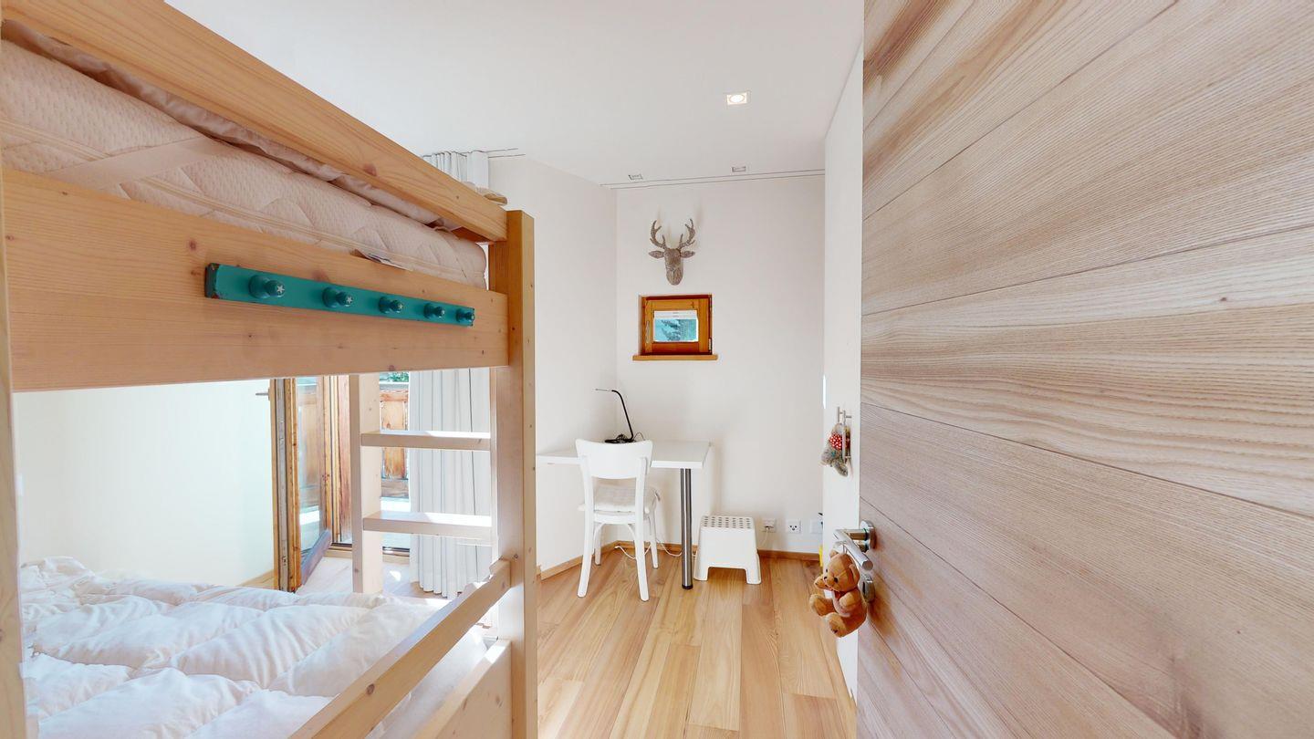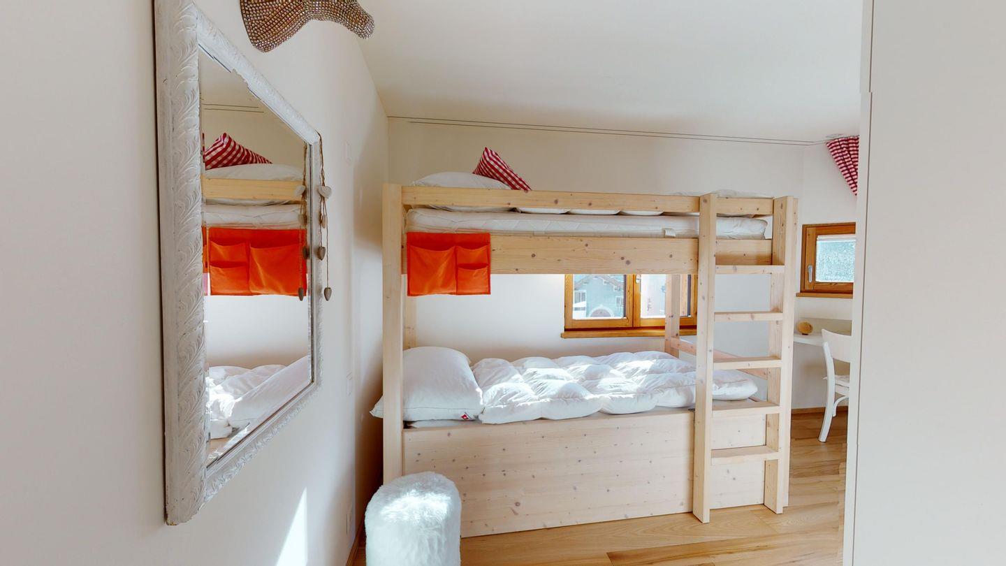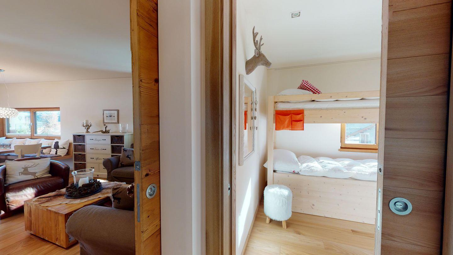 Im Wohnraum befinden sich ein grosszügiger Esstisch sowie eine gemütliche Sofa-Sitzecke mit TV (Swisscom-TV). Offenen, modern ausgestattete Küche und Zugangstür zur Terrasse mit Blick auf den Champfèrsee.