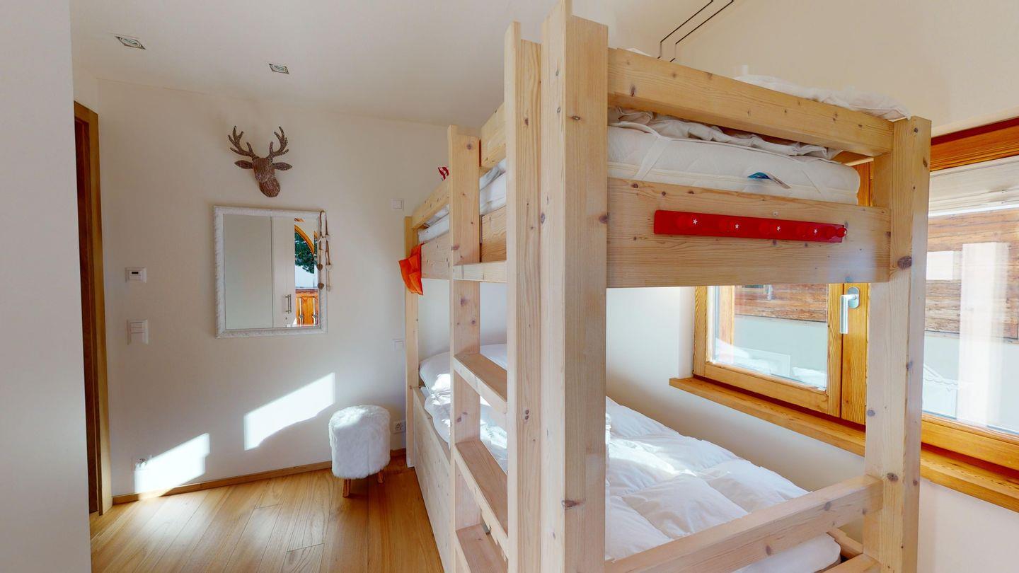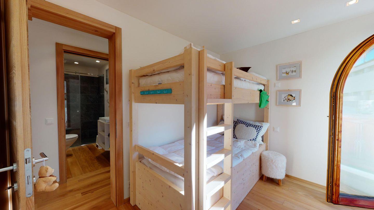 Zwei Schlafzimmer mit je einem Stockbett (jeweils 90cm x 200cm) und kleinem Balkon. Gegenüber befindet sich eines der Badezimmer mit Dusche, WC und Waschbecken.