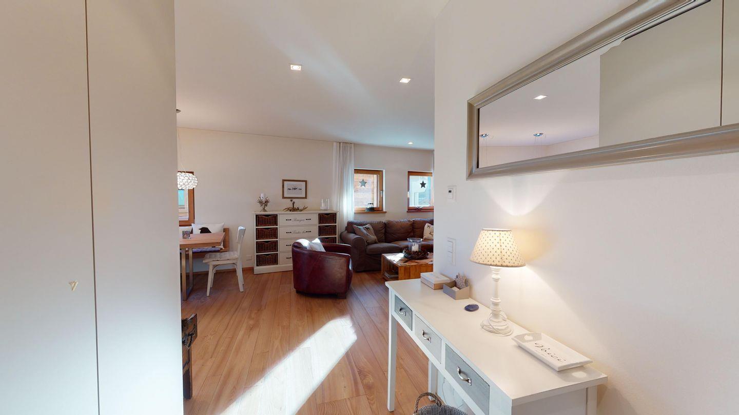 Im Wohnraum befinden sich ein grosszügiger Esstisch sowie eine gemütliche Sofa-Sitzecke mit TV (Swisscom-TV). Offenen, modern ausgestattete Küche und Zugangstür zur Terrasse mit Blick auf den Champférsee.