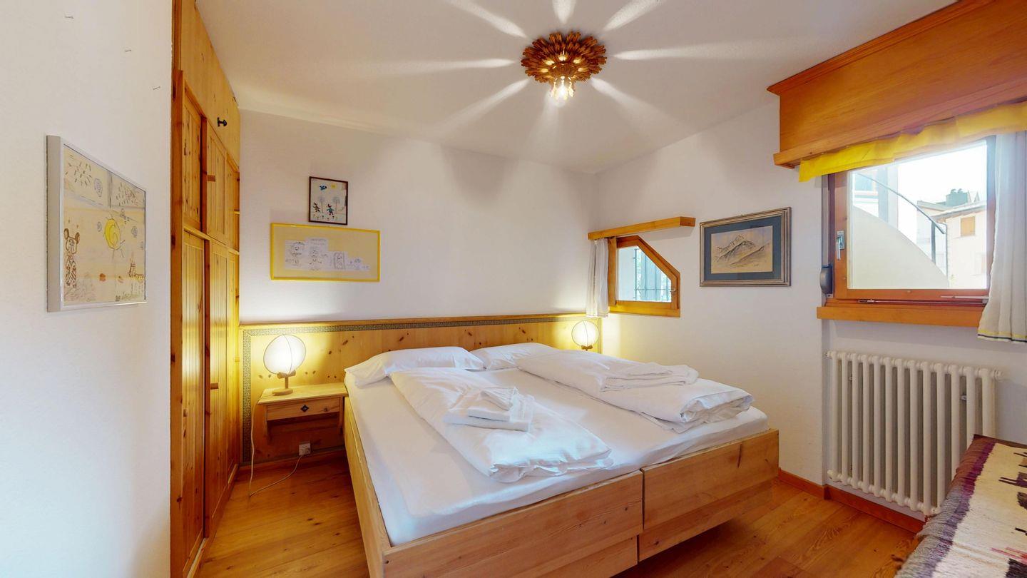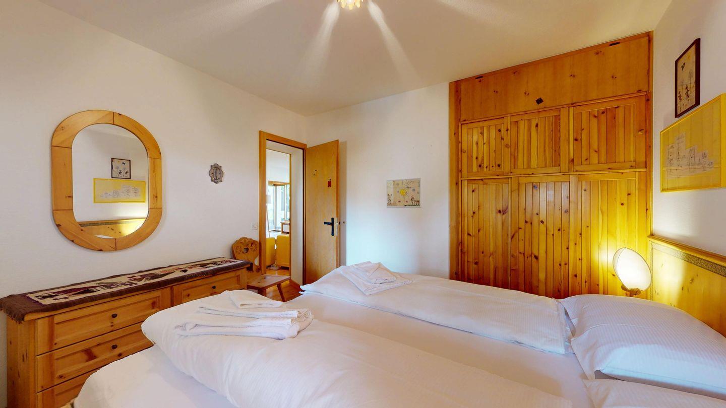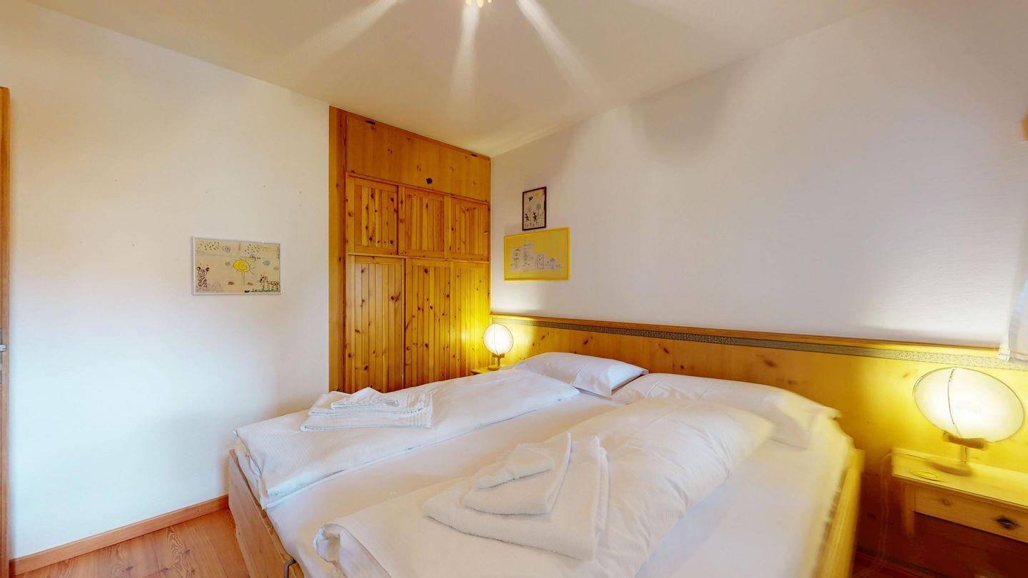 2-Zimmer-Wohnung im Erdgeschoss, ca. 85 m2, Vorraum mit Garderobe, Bad mit Badewanne/Waschbecken und WC. Schlafzimmer mit Doppelbett (zwei Einzelmatratzen). Abgeschlossene Küche mit kleinem Backofen und Geschirrspüler. Chicco d'oro Kaffeemaschine. Grosses Wohn-/Esszimmer mit zwei einzelnen Schrankbetten, die Tür zwischen Wohn- und Esszimmer kann geschlossen werden, um zwei getrennte Räume zu schaffen. Das zweite Bad mit Dusche befindet sich in diesem Teil der Wohnung. Balkon/Garten mit Blick auf die Berge, Balkonmöbel sind vorhanden. Rustikale und gemütliche Einrichtung. Gemeinsame Waschküche. 2 Stellplätze in der Garage.