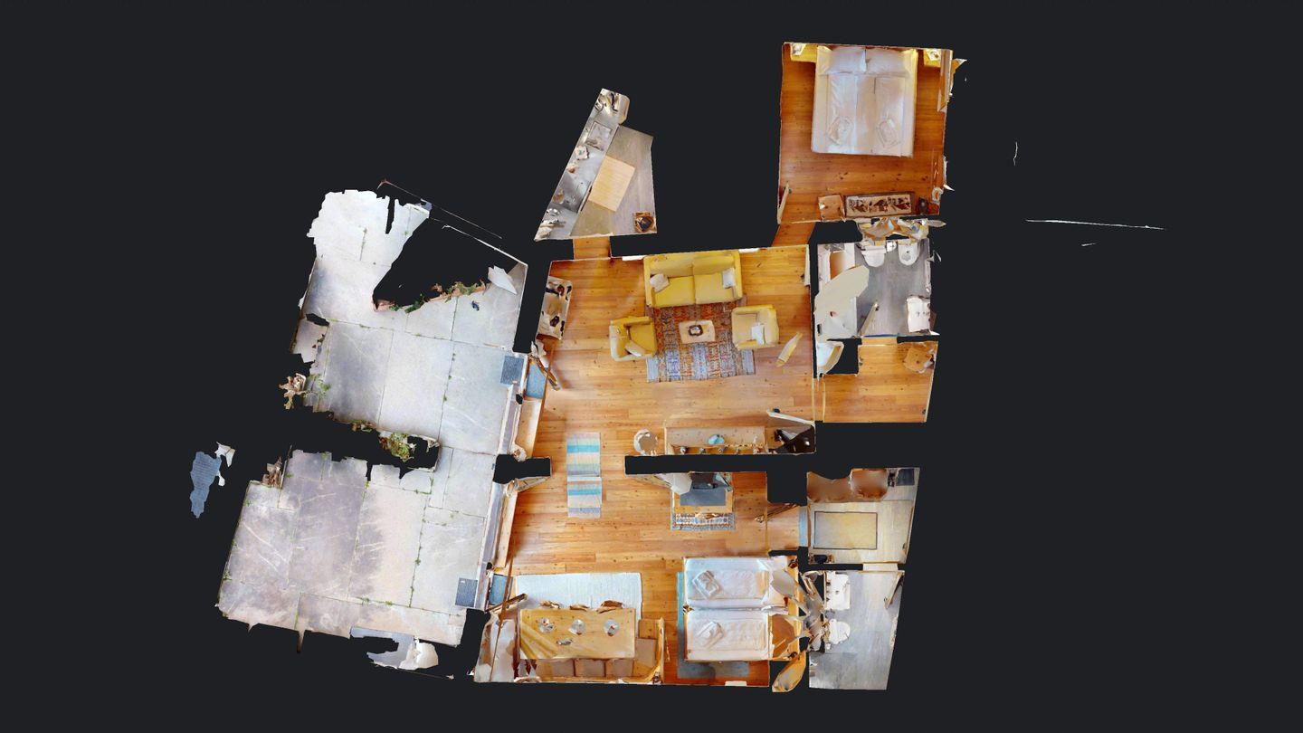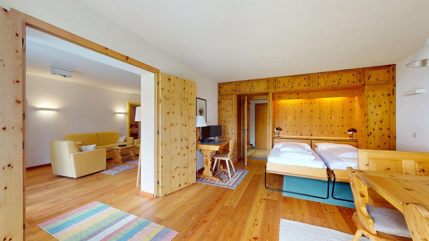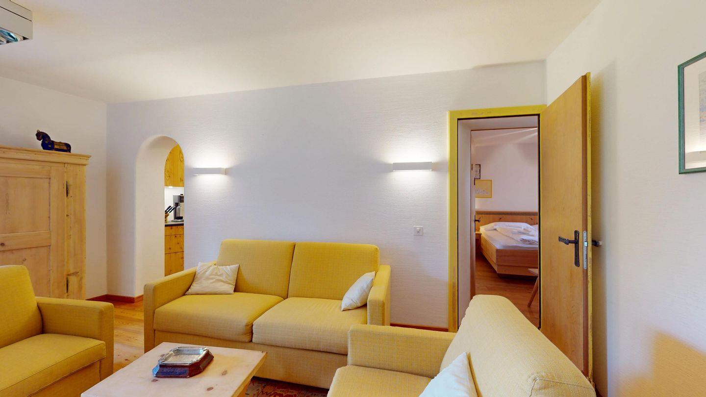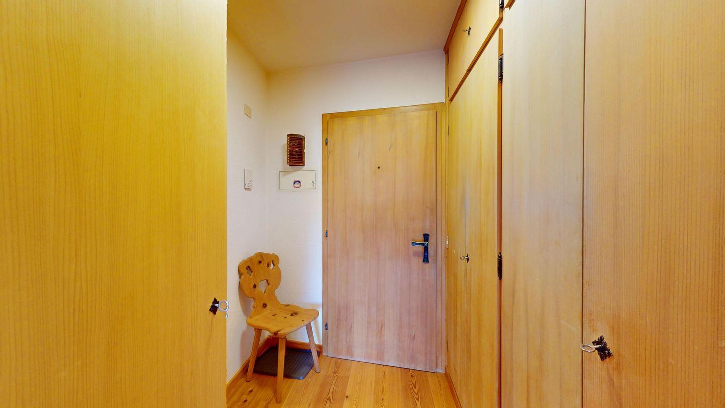2-Zimmer-Wohnung im Erdgeschoss, ca. 85 m2, Vorraum mit Garderobe, Bad mit Badewanne/Waschbecken und WC. Schlafzimmer mit Doppelbett (zwei Einzelmatratzen). Abgeschlossene Küche mit kleinem Backofen und Geschirrspüler. Chicco d'oro Kaffeemaschine. Grosses Wohn-/Esszimmer mit zwei einzelnen Schrankbetten, die Tür zwischen Wohn- und Esszimmer kann geschlossen werden, um zwei getrennte Räume zu schaffen. Das zweite Bad mit Dusche befindet sich in diesem Teil der Wohnung. Balkon/Garten mit Blick auf die Berge, Balkonmöbel sind vorhanden. Rustikale und gemütliche Einrichtung. Gemeinsame Waschküche. 2 Stellplätze in der Garage.