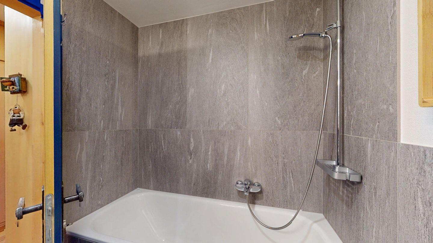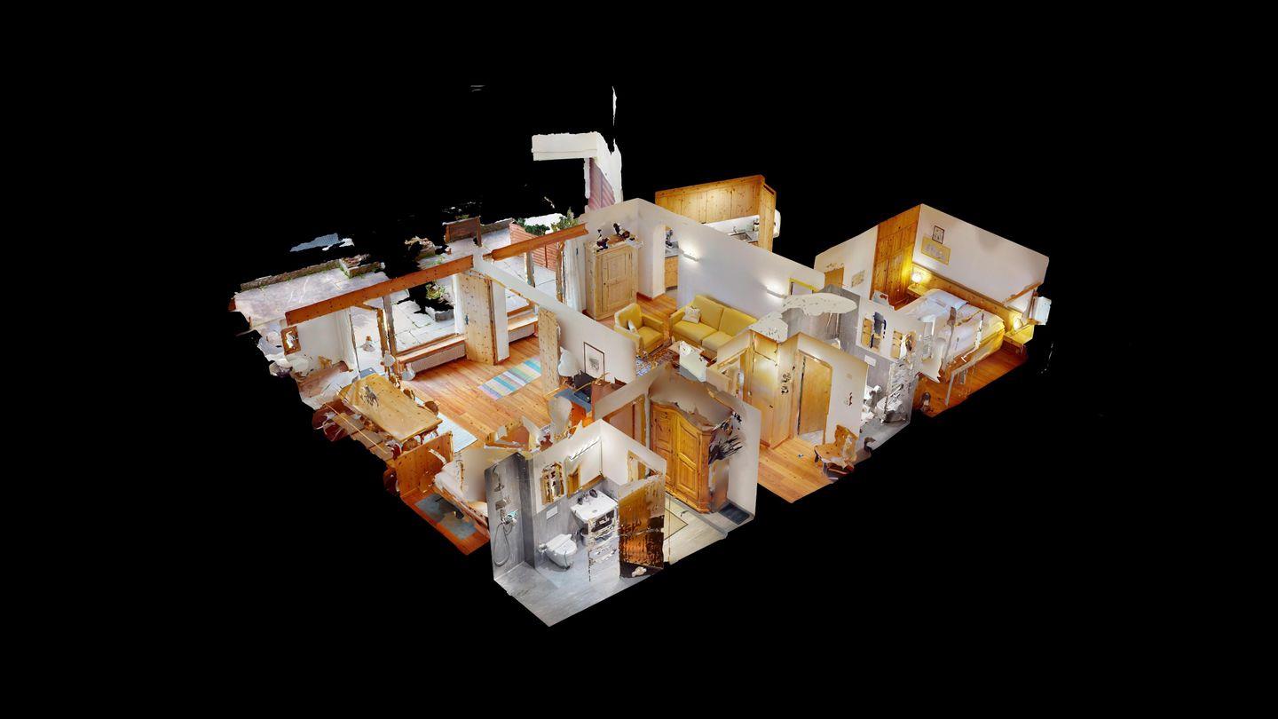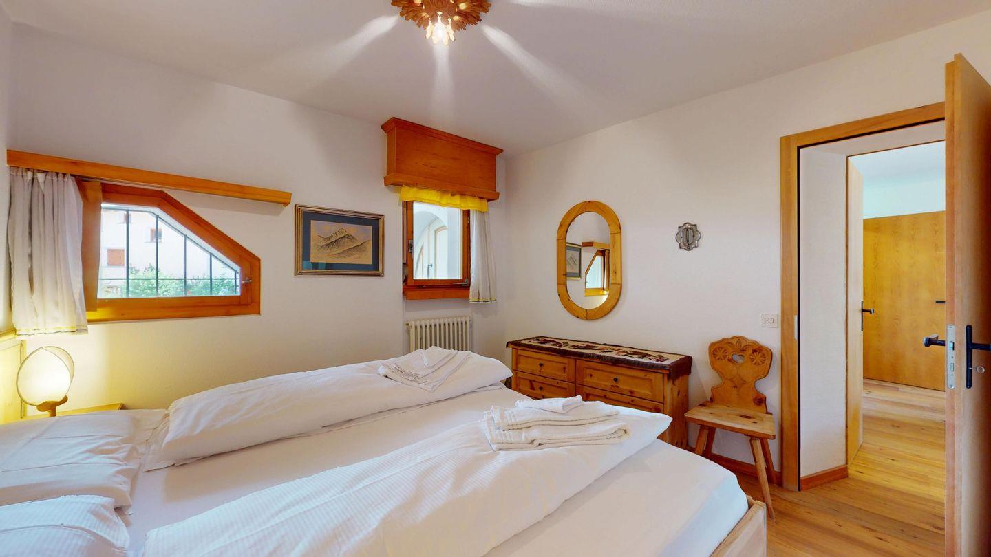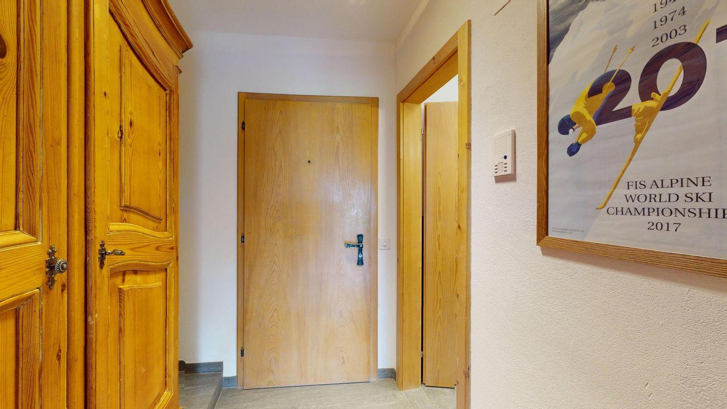 3-Zimmer-Wohnung im Erdgeschoss, Vorraum mit Garderobe, Bad mit Badewanne/Waschbecken und WC. Schlafzimmer mit Doppelbett (zwei Einzelmatratzen). Abgeschlossene Küche mit kleinem Backofen und Geschirrspüler. Chicco d'oro Kaffeemaschine. Grosses Wohn-/Esszimmer mit zwei einzelnen Schrankbetten, die Tür zwischen Wohn- und Esszimmer kann geschlossen werden, um zwei getrennte Räume zu schaffen. Das zweite Bad mit Dusche befindet sich in diesem Teil der Wohnung. Balkon/Garten mit Blick auf die Berge, Balkonmöbel sind vorhanden. Rustikale und gemütliche Einrichtung. Gemeinsame Waschküche. 2 Stellplätze in der Garage.