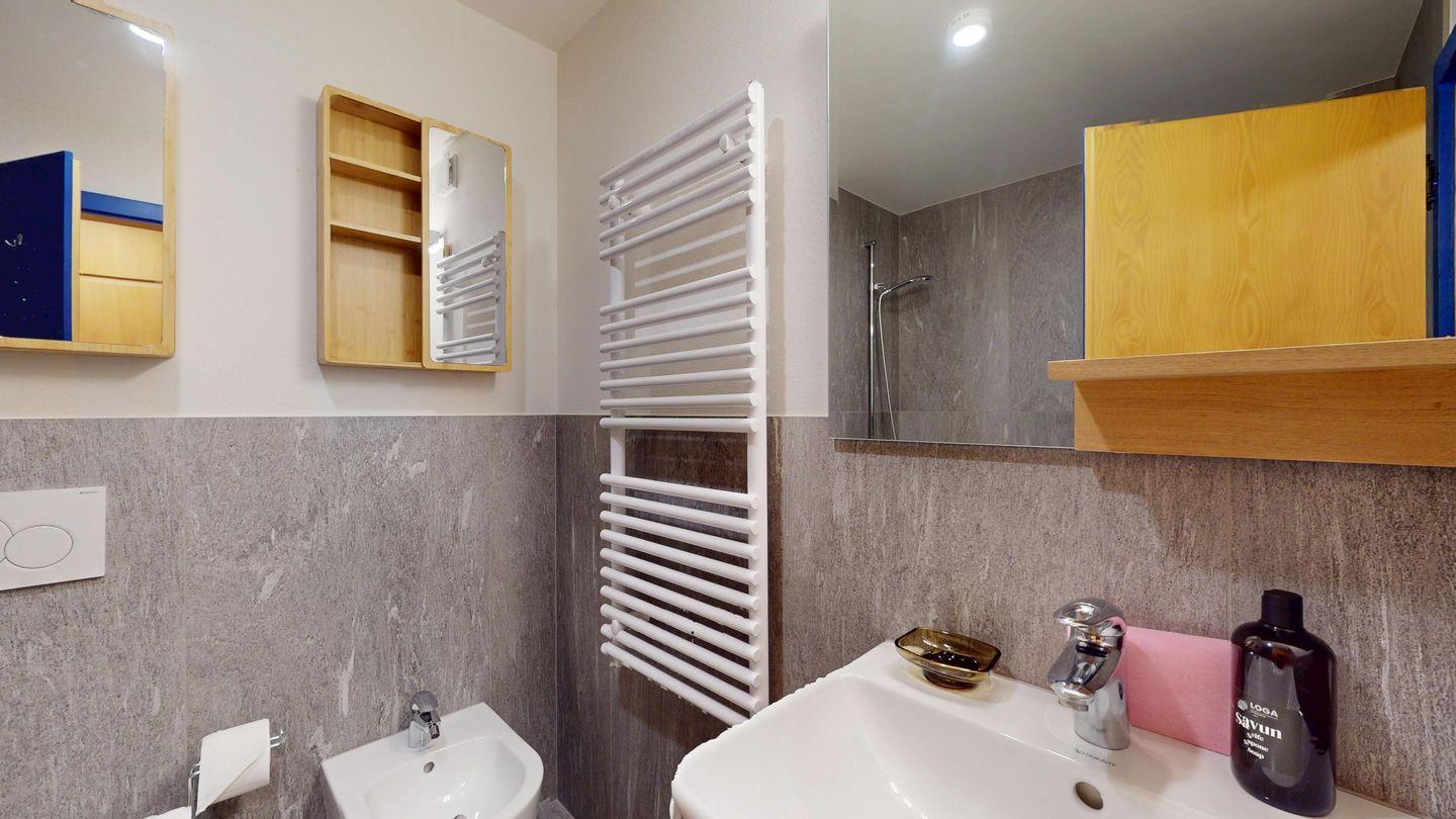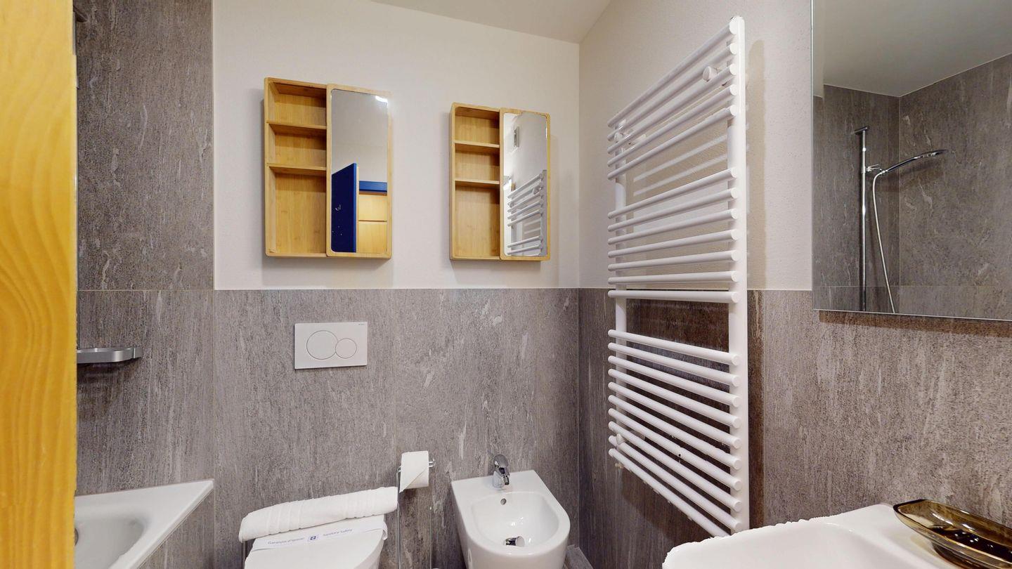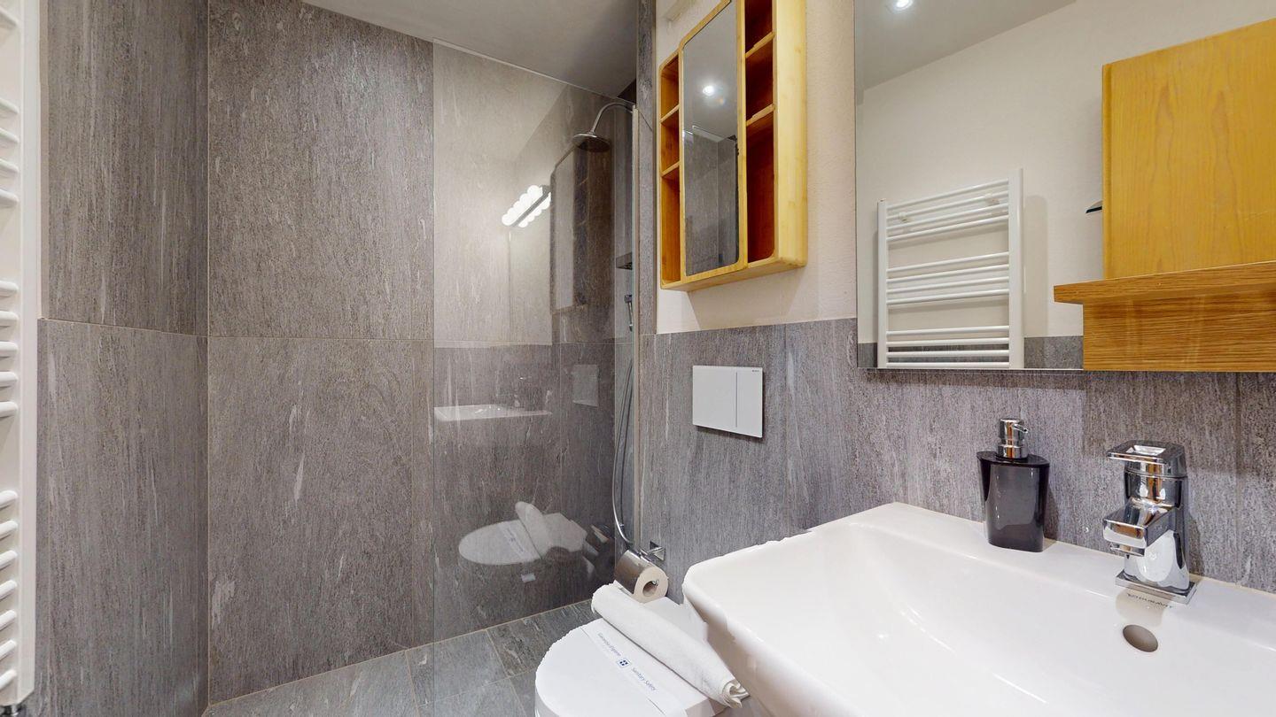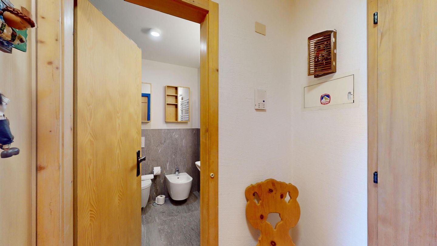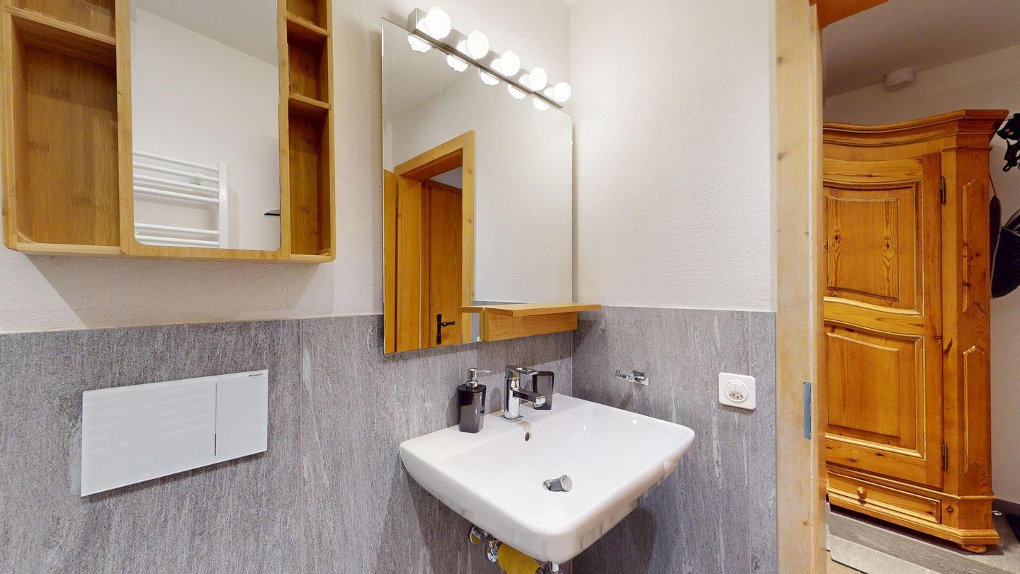 3-Zimmer-Wohnung im Erdgeschoss, Vorraum mit Garderobe, Bad mit Badewanne/Waschbecken und WC. Schlafzimmer mit Doppelbett (zwei Einzelmatratzen). Abgeschlossene Küche mit kleinem Backofen und Geschirrspüler. Chicco d'oro Kaffeemaschine. Grosses Wohn-/Esszimmer mit zwei einzelnen Schrankbetten, die Tür zwischen Wohn- und Esszimmer kann geschlossen werden, um zwei getrennte Räume zu schaffen. Das zweite Bad mit Dusche befindet sich in diesem Teil der Wohnung. Balkon/Garten mit Blick auf die Berge, Balkonmöbel sind vorhanden. Rustikale und gemütliche Einrichtung. Gemeinsame Waschküche. 2 Stellplätze in der Garage.
