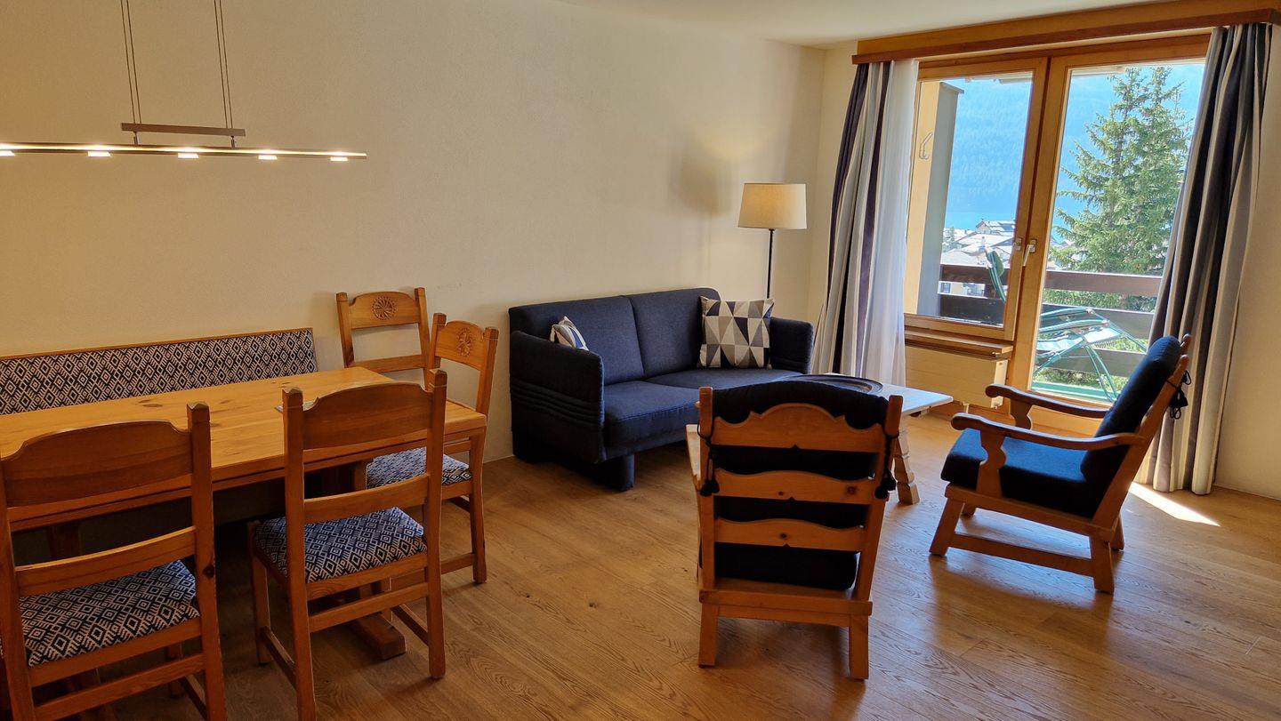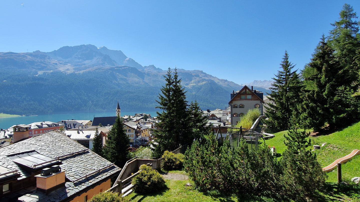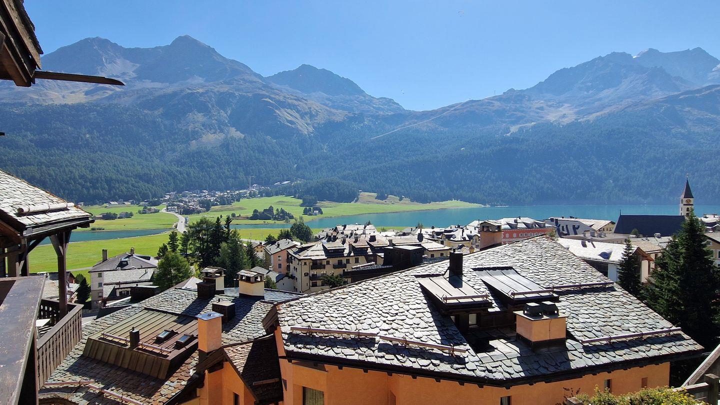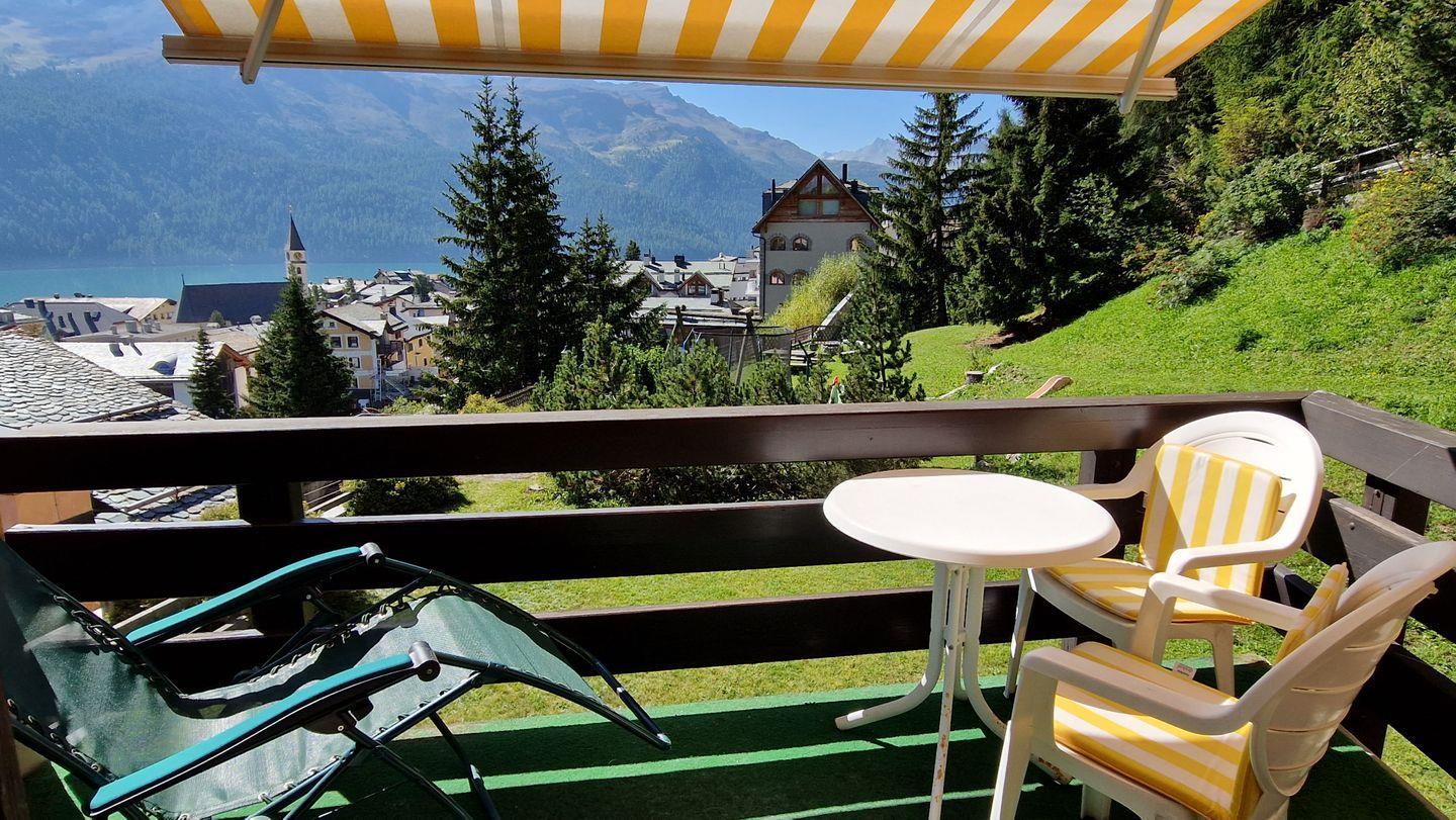 2-Zimmerwohnung im Haus Chamuotsch, 1. Stock, 70 m2. Die helle nach Süden ausgerichtete Wohnung mit sonnigem Balkon bietet eine prächtige Berg- und Seesicht, ein gemütliches Wohn-/Esszimmer mit Fernseher, ein helles Schlafzimmer mit Doppelbett, ein Bad mit Regendusche/WC und eine offene, gut ausgestattete Küche mit Backofen, Geschirrspüler, Nespresso-Kaffeemaschine und Wasserkocher.
