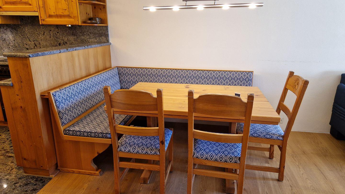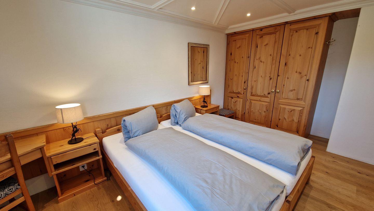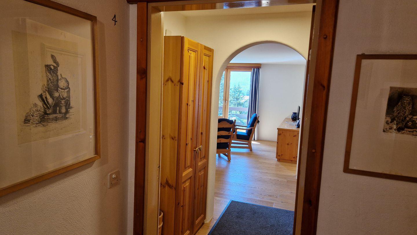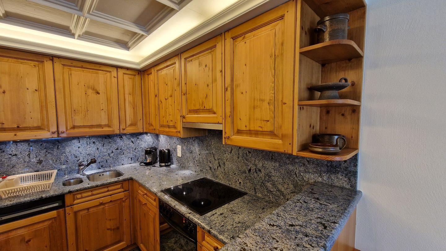 2-Zimmerwohnung im Haus Chamuotsch, 1. Stock, 70 m2. Die helle nach Süden ausgerichtete Wohnung mit sonnigem Balkon bietet eine prächtige Berg- und Seesicht, ein gemütliches Wohn-/Esszimmer mit Fernseher, ein helles Schlafzimmer mit Doppelbett, ein Bad mit Regendusche/WC und eine offene, gut ausgestattete Küche mit Backofen, Geschirrspüler, Nespresso-Kaffeemaschine und Wasserkocher.