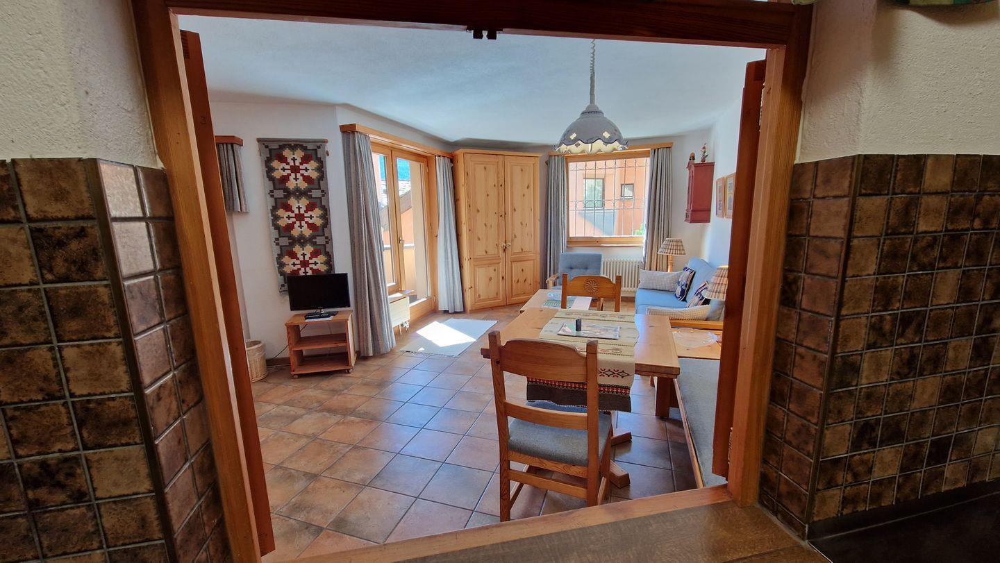 1 1/2-Zimmerwohnung im Haus Rizza, 2. Stock, 45 m2. Das ruhige Studio bietet ein helles, gemütliches Wohn-/Esszimmer mit zwei Schrankbetten (95 x 200) und ein Bad/WC. Die kleine Küche hat eine Durchreiche und ist mit Backofen, Geschirrspüler, Nesspresso-Kapselmaschine und Wasserkocher ausgerüstet. Der nach Süden ausgerichtete Balkon ist windgeschützt und offenbart eine schöne Bergsicht.