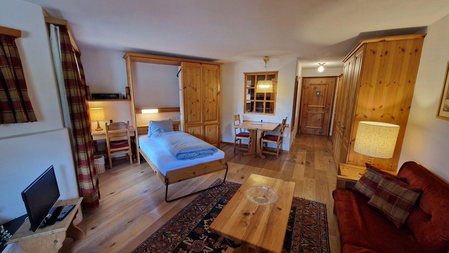 1 1/2-Zimmerwohnung im Haus Rizza, 3. Stock, 50 m2. Das nach Süden ausgerichtete Studio befindet sich auf der gleichen Höhe wie die Tiefgarage. Es besteht aus einem Wohn-/Esszimmer mit zwei Schrankbetten (95x200) und einem kleinen Fernseher, einem Bad/WC und einer Küche mit Durchreiche, Backofen, Geschirrspüler, Nesspresso-Kapselmaschine und Wasserkocher. Der geschützte Balkon bietet eine schöne Bergsicht. Nichtraucherwohnung.