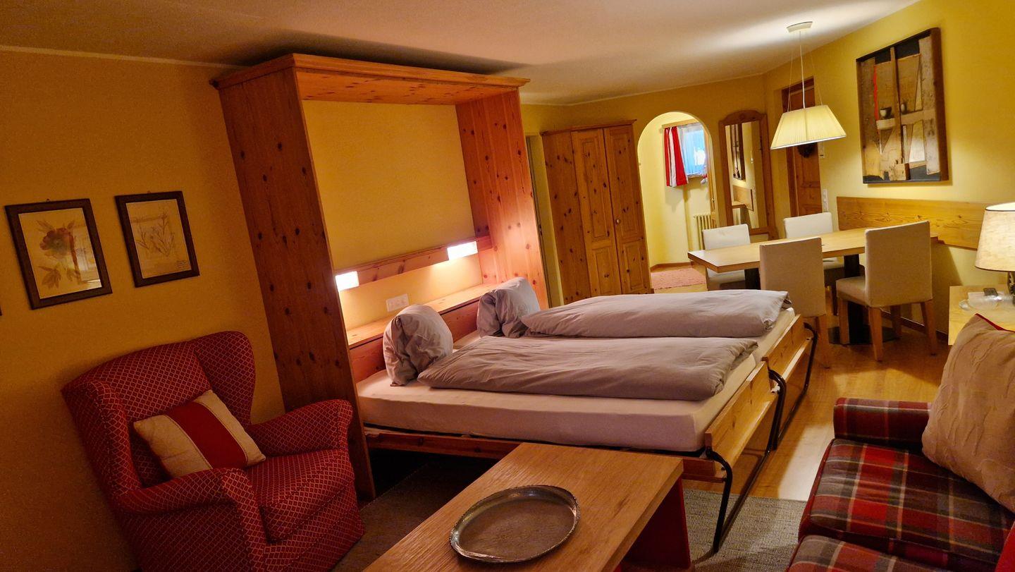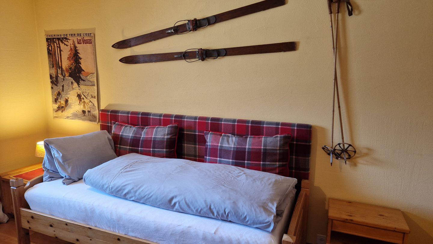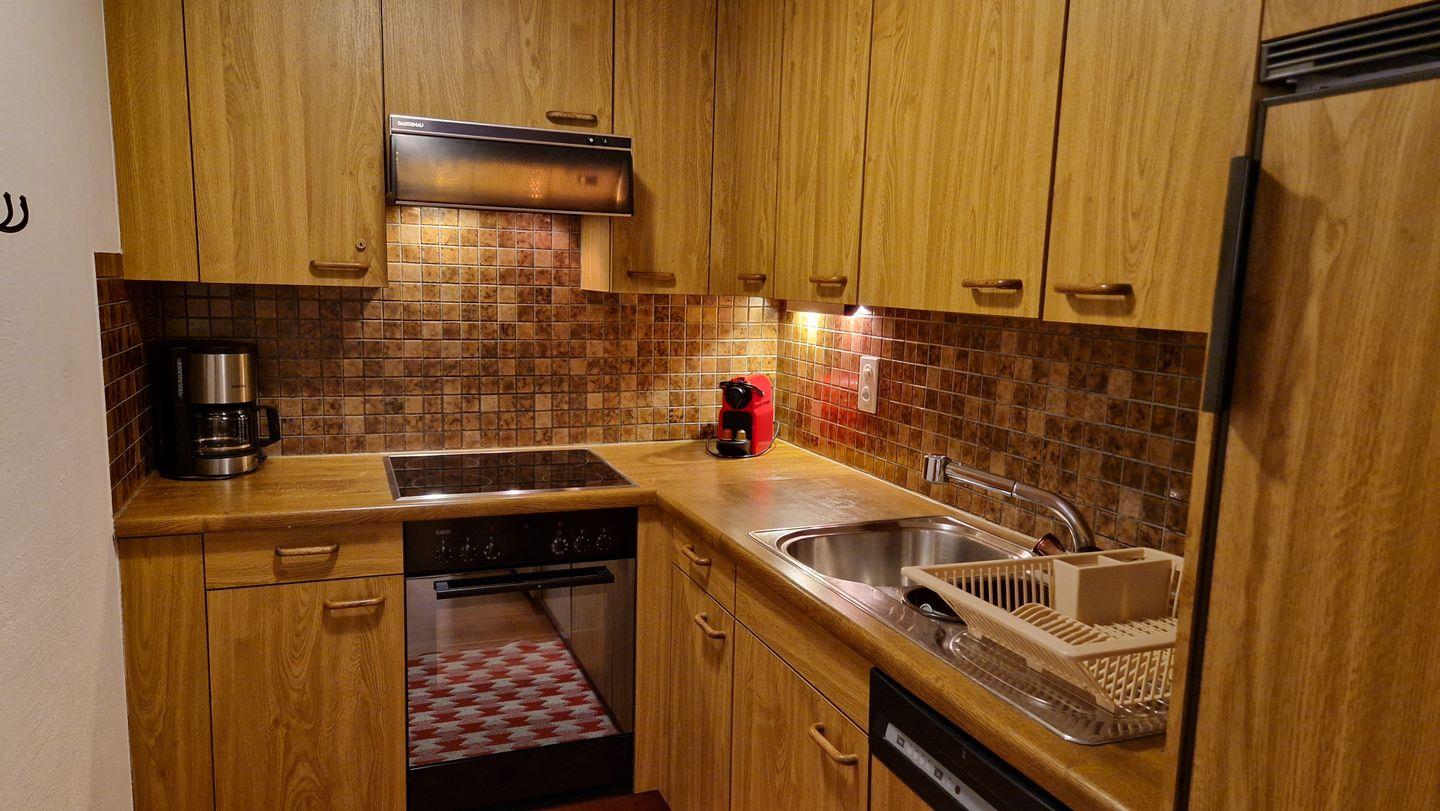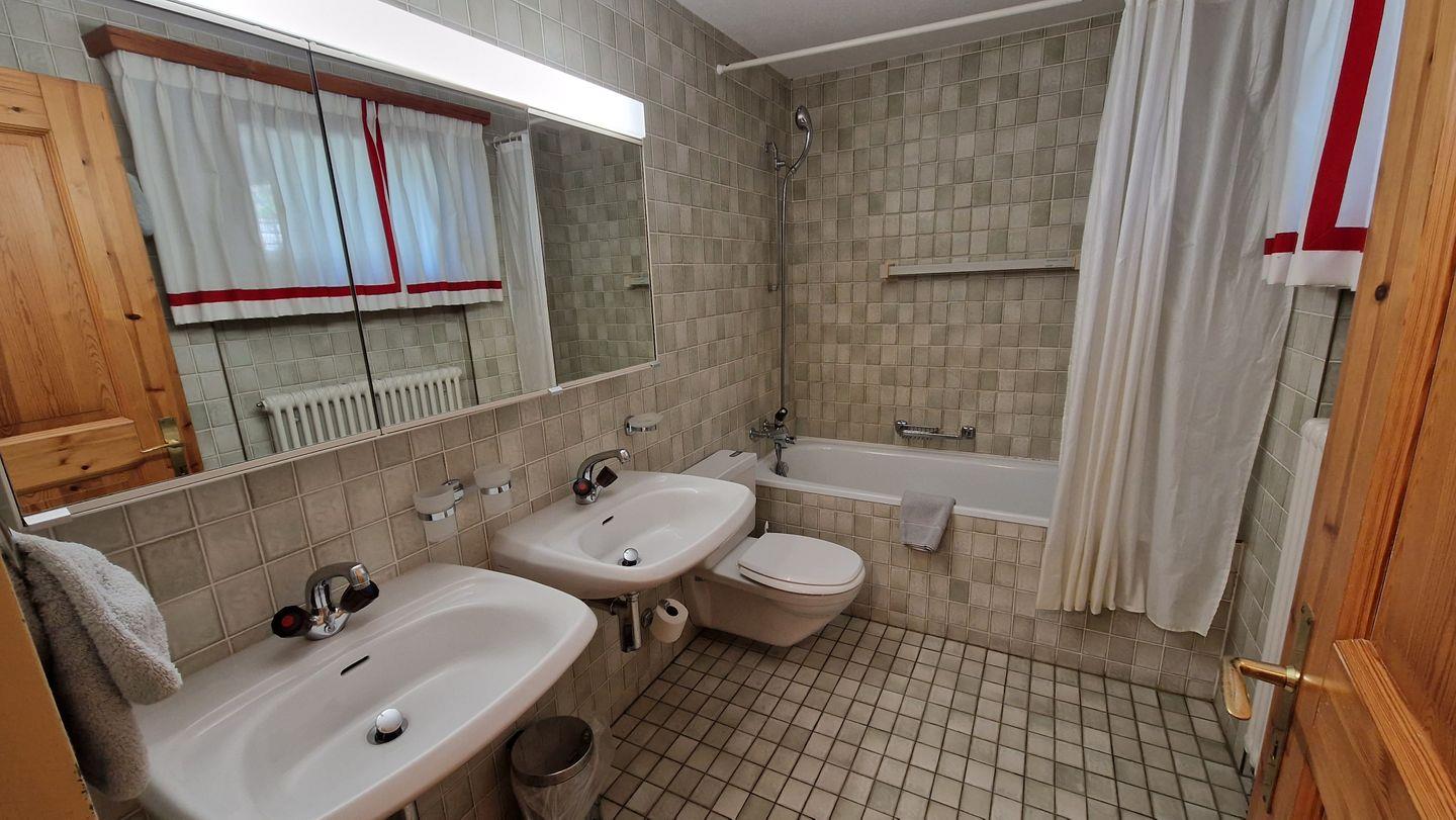 2 1/2-Zimmerwohnung im Haus Rizza, 4. Stock, 85 m2. Die Wohnung bietet ein gemütliches Wohn-/Esszimmer mit zwei Schrankbetten (95x200) und einem Fernseher, ein hübsches Schlafzimmer mit Kajüten-Bett und einem Einzelbett, ein Bad/WC mit Doppellavabo, eine Küche mit Backofen, Geschirrspüler, Nesspresso-Kapselmaschine und Wasserkocher. Der nach Süden ausgerichtete Balkon ist geschützt und offenbart eine prächtige Berg- und Seesicht. Nichtraucherwohnung.