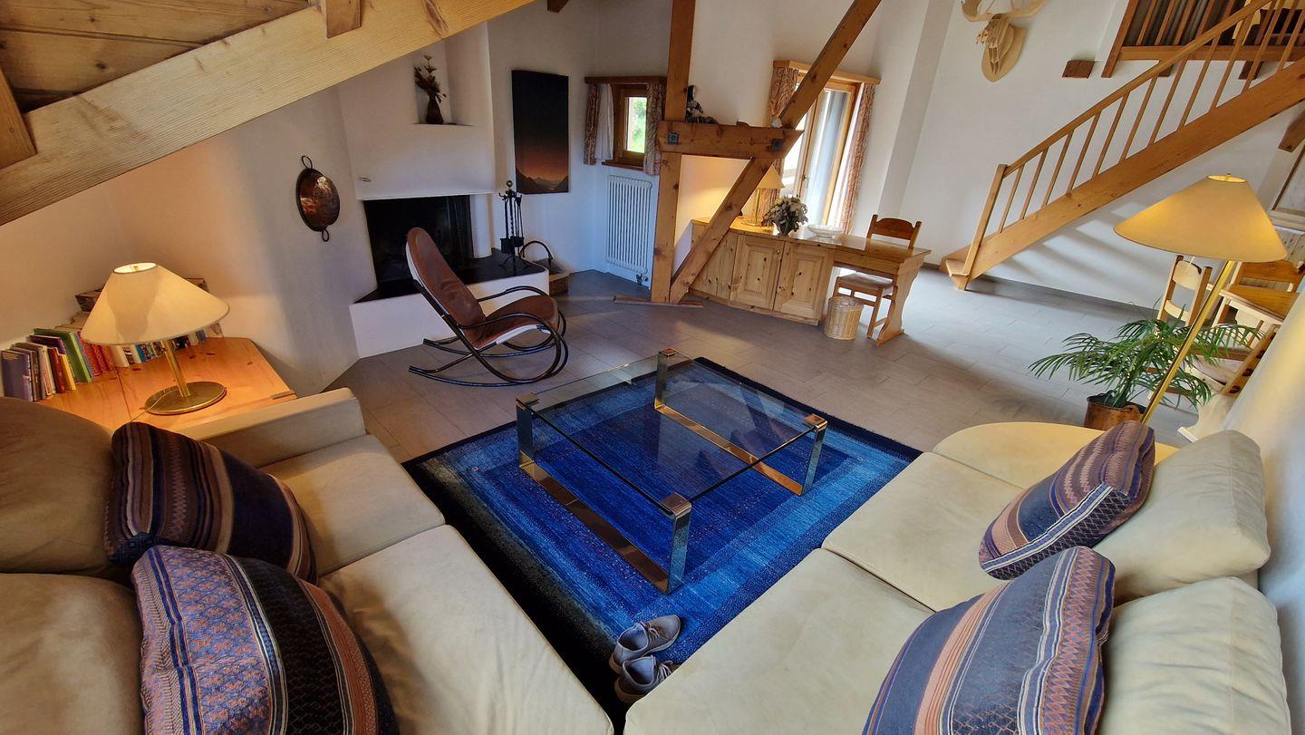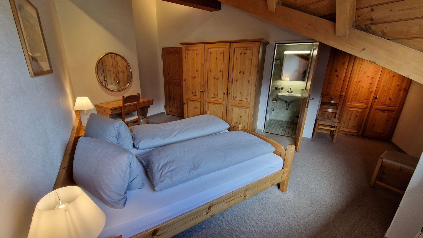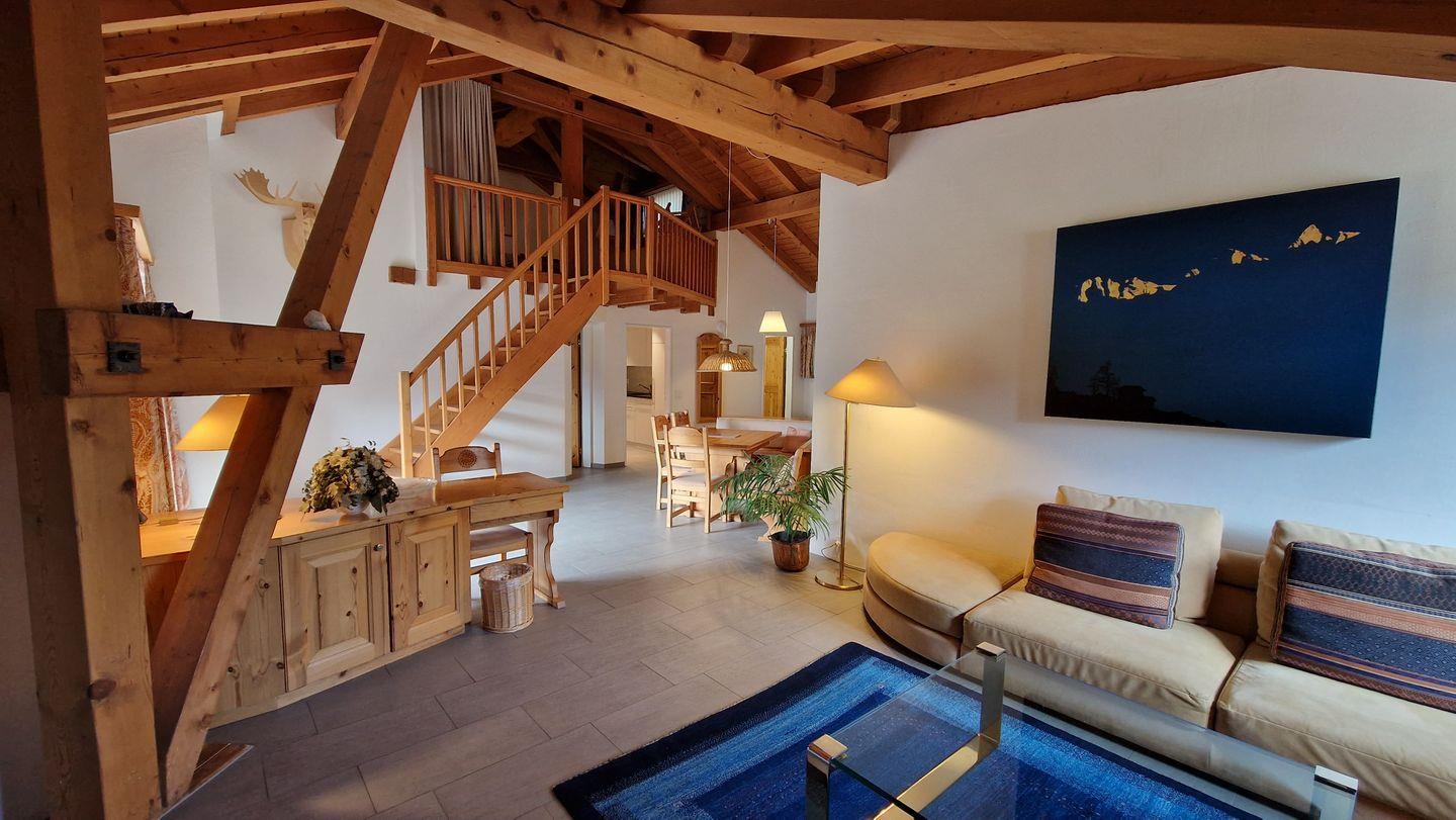 3 1/2-Zimmer-Dachwohnung im Haus Rizza, 140 m2. Zur geräumigen Wohnung gehört ein grosses Wohn-/Esszimmer mit Cheminée, ein Schlafzimmer mit Doppelbett und eigener Dusche/WC, ein Schlafzimmer mit zwei Einzelbetten, eine Galerie mit grossem, konfortabelm Schlafsofa (180x200), ein Bad/WC mit Doppellavabo, eine Küche mit Backofen, Geschirrspüler, Nesspresso-Kapselmaschine und Wasserkocher. Der nach Süden ausgerichtete sonnige Balkon bietet eine prächtige Berg- und Seesicht. Nichtraucherwohnung.