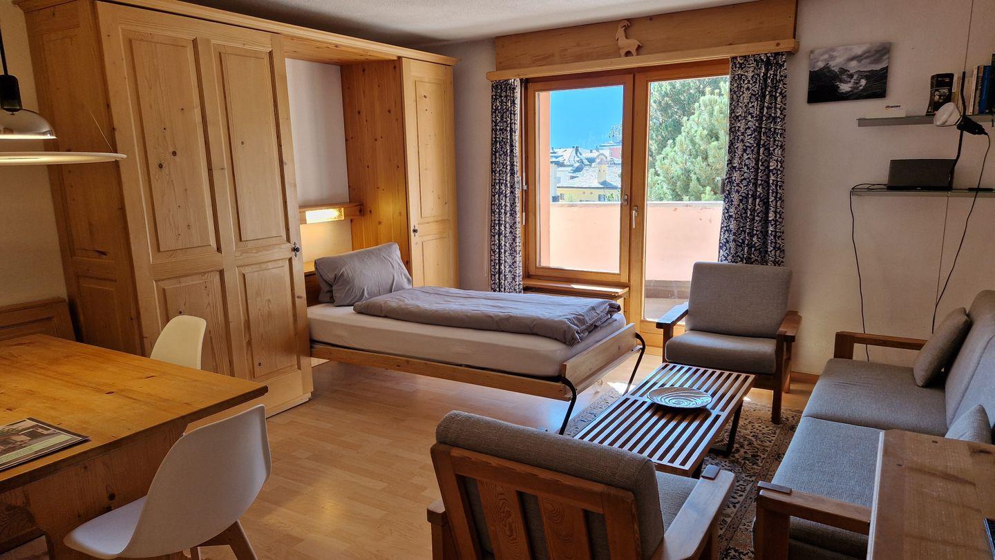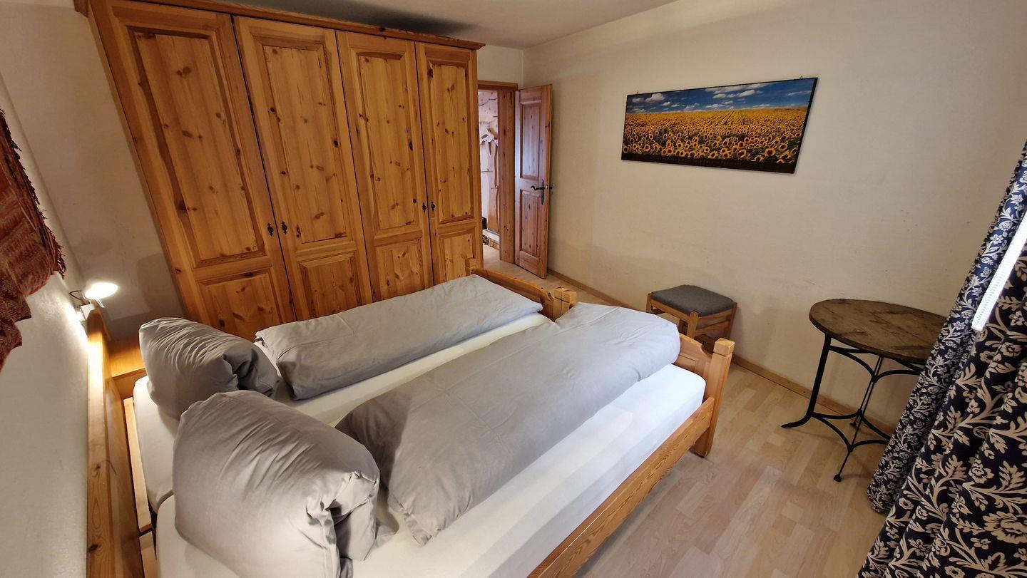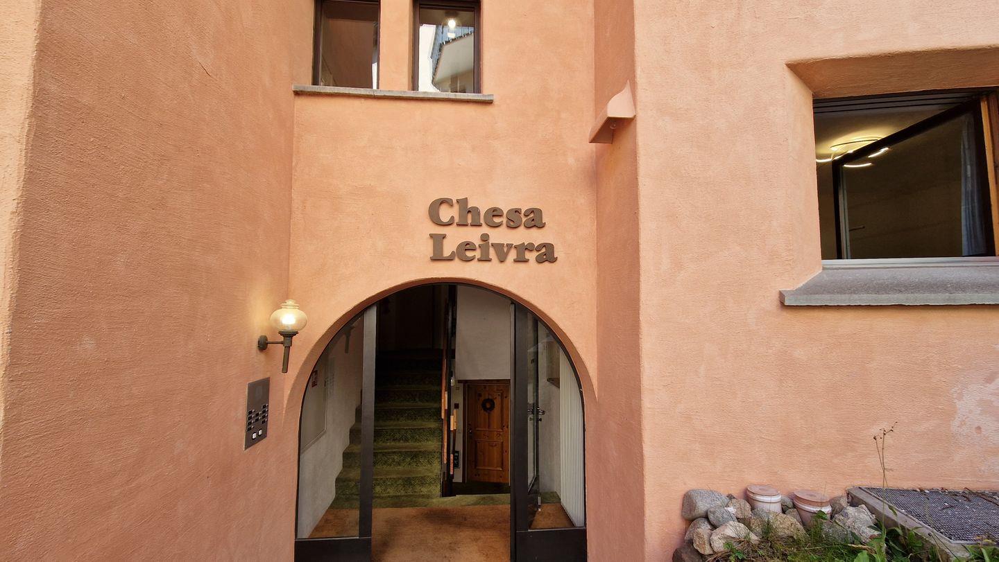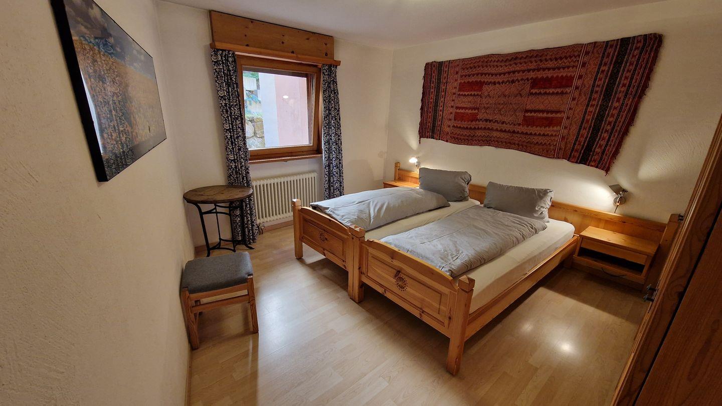 2 1/2-Zimmerwohnung im Haus Leivra, 1. Stock, 70 m2. Die Wohnung verfügt über ein Wohn-/Esszimmer mit zwei Schrankbetten (90x200) und Fernseher, ein Schlafzimmer mit Doppelbett, ein Bad/WC mit Bidon und eine Küche mit Backofen, Geschirrspüler, Nesspresso-Kapselmaschine und Wasserkocher. Der sonnige Balkon ist nach Süden ausgerichtet und bietet eine schöne Aussicht in die Berge.