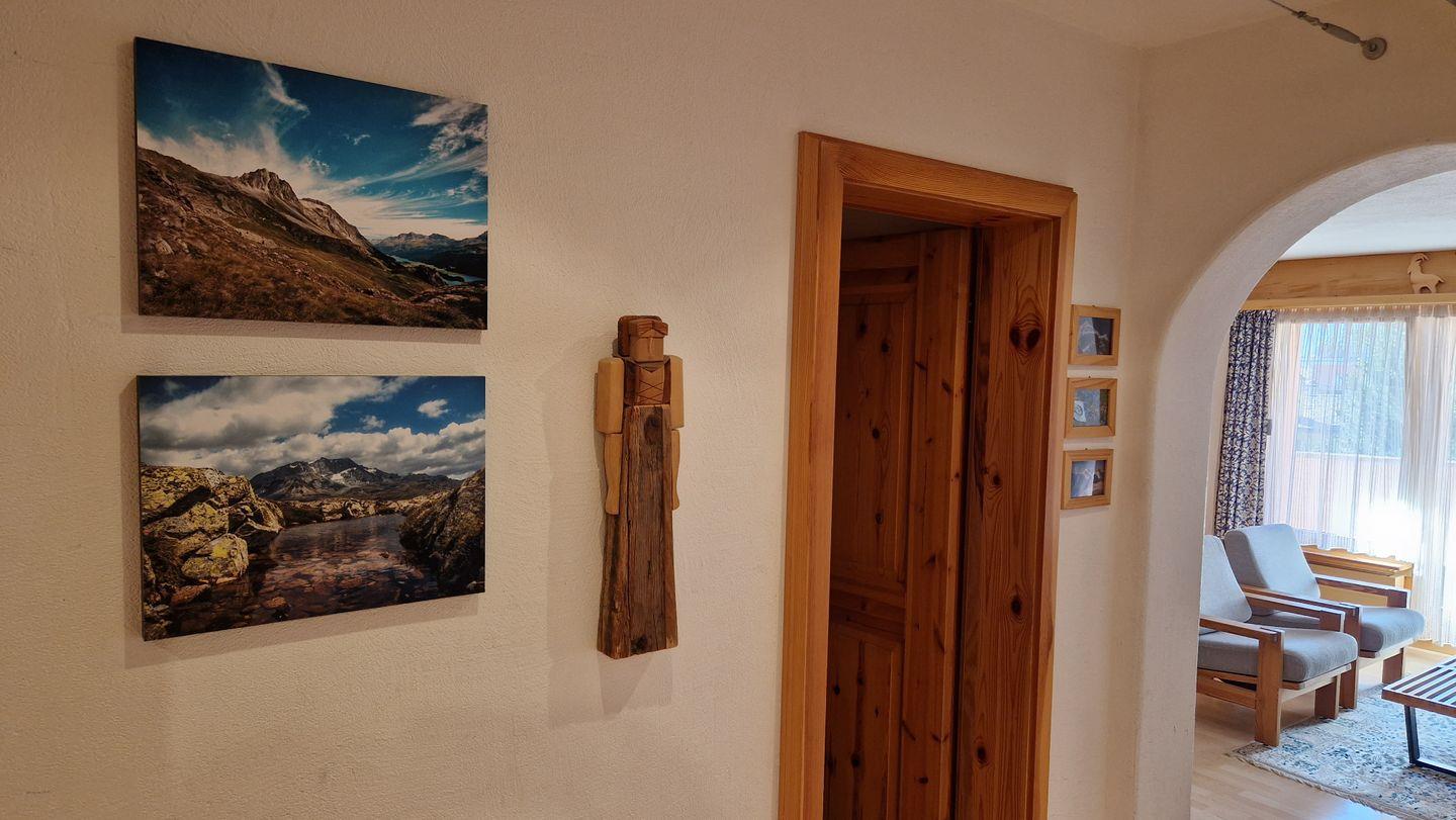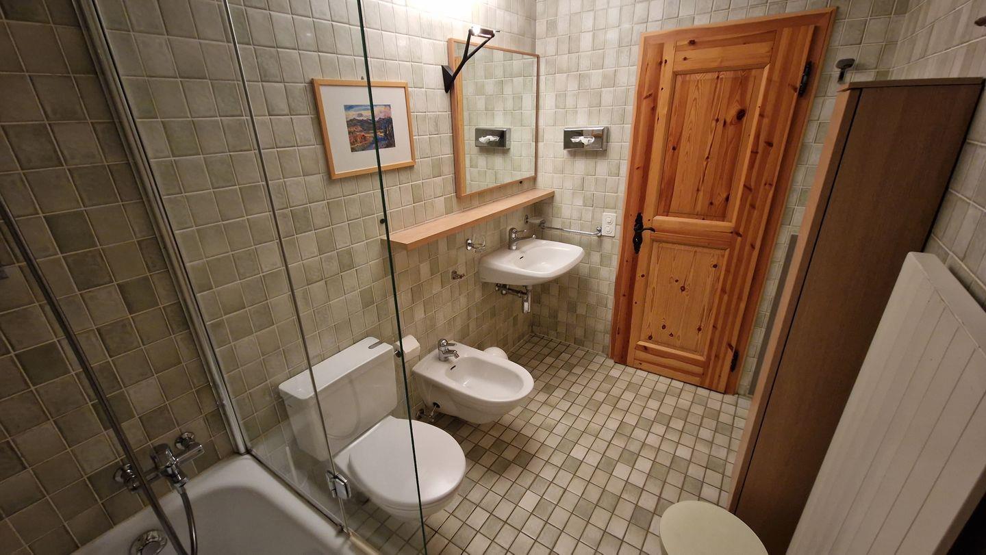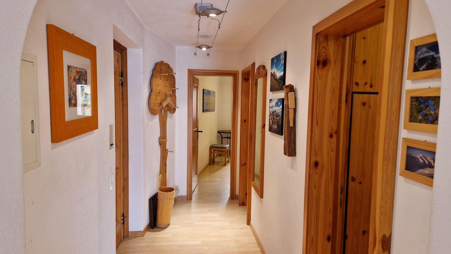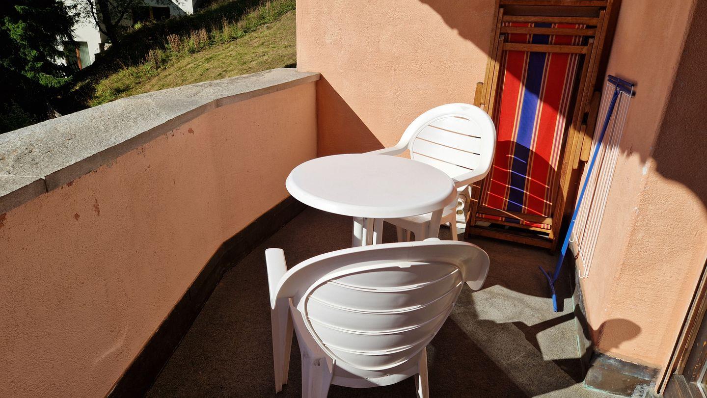 2 1/2-Zimmerwohnung im Haus Leivra, 1. Stock, 70 m2. Die Wohnung verfügt über ein Wohn-/Esszimmer mit zwei Schrankbetten (90x200) und Fernseher, ein Schlafzimmer mit Doppelbett, ein Bad/WC mit Bidon und eine Küche mit Backofen, Geschirrspüler, Nesspresso-Kapselmaschine und Wasserkocher. Der sonnige Balkon ist nach Süden ausgerichtet und bietet eine schöne Aussicht in die Berge.