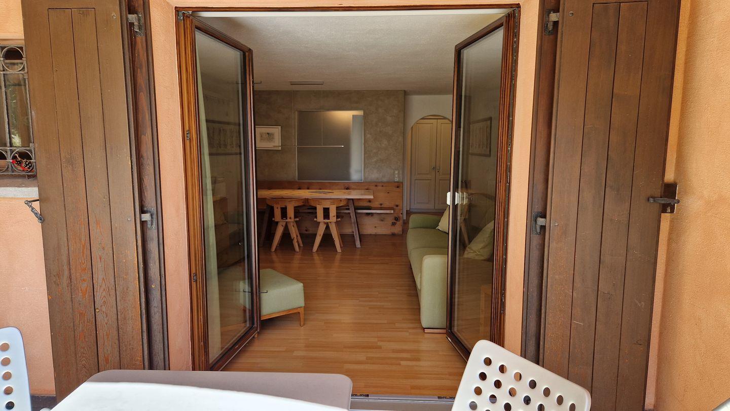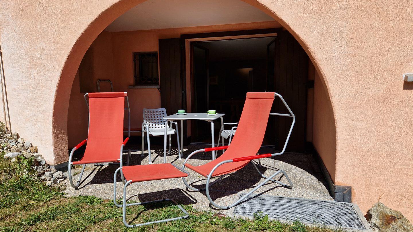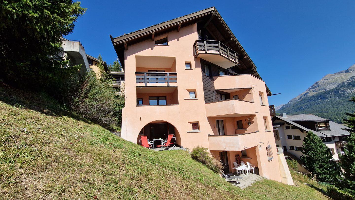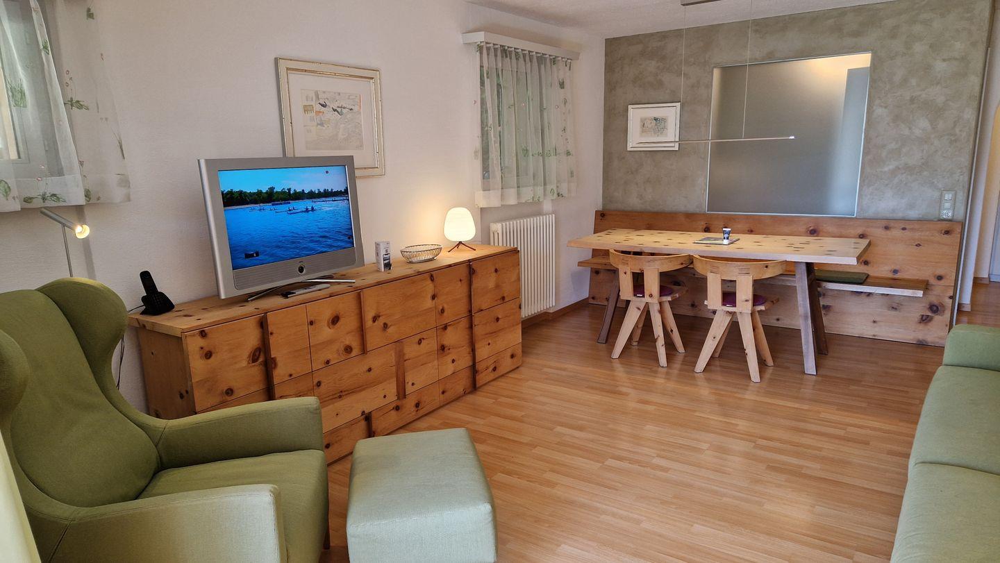 2-Zimmerwohnung im Haus Leivra, Parterre, 75 m2. Die Wohnung ist mit Arvenmöbeln ausgestattet und verfügt über ein grosszügiges Wohn-/Esszimmer mit Fernseher, ein Schlafzimmer mit Doppelbett, ein Bad/WC mit Dusche und eine grosse Küche mit Backofen, Geschirrspüler, Kühlschrank und kleinem Gefrierschrank sowie Nesspresso-Kapselmaschine. Die gedeckte Terrasse ist nach Süden ausgerichtet und bietet eine schöne Aussicht in die Berge. Nichtraucherwohnung.
