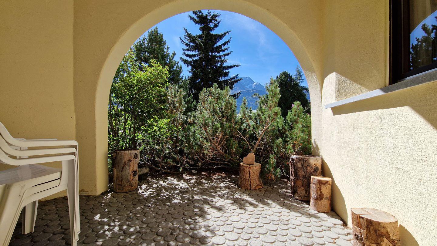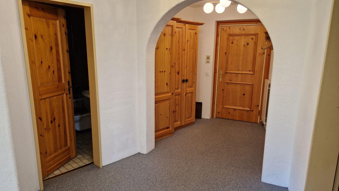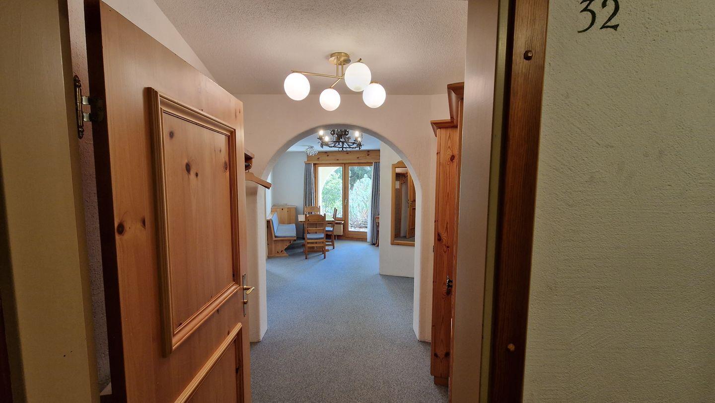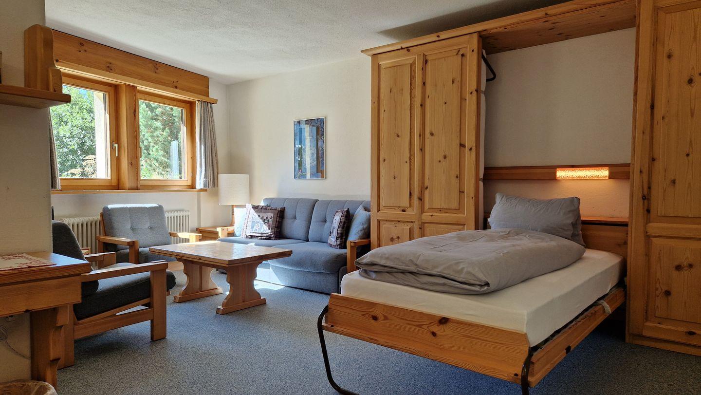 2 1/2-Zimmerwohnung im Haus la Vuolp, Parterre, 75 m2. Die nach Süden ausgerichtete Wohnung verfügt über ein grosszügiges Wohn-/Esszimmer mit zwei Schrankbetten (90x200) und Fernseher, ein helles Schlafzimmer mit Doppelbett, ein Bad/WC und eine Küche mit Backofen, Geschirrspüler, Nesspresso-Kapselmaschine und Wasserkocher. Die kleine, gedeckte Terrasse ist von einer grünen Hecke umgeben. Nichtraucherwohnung.