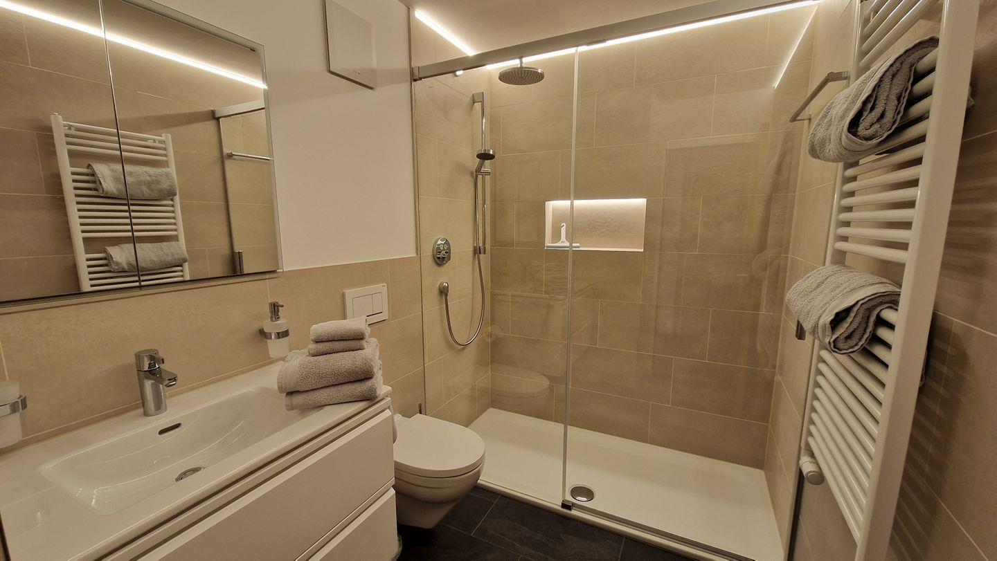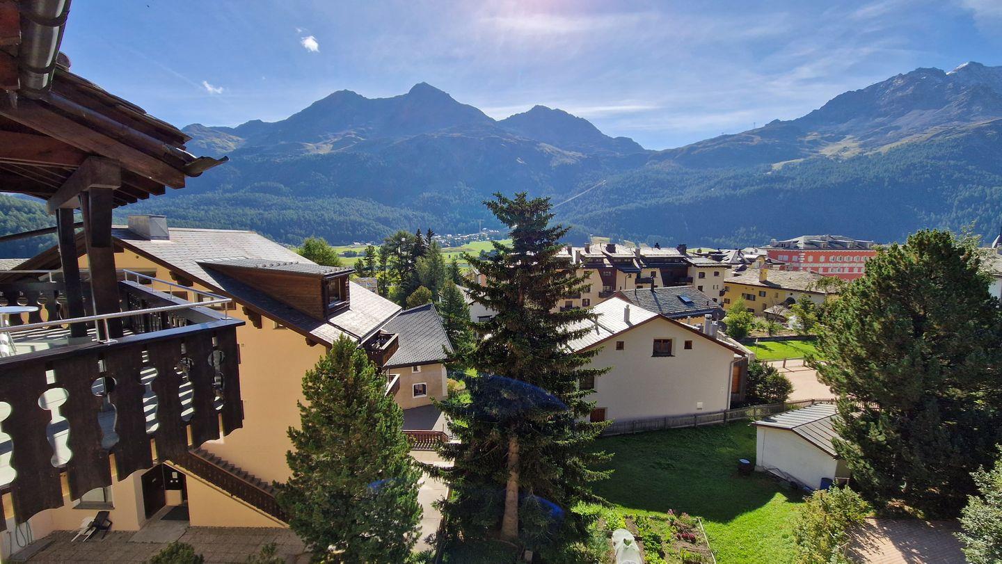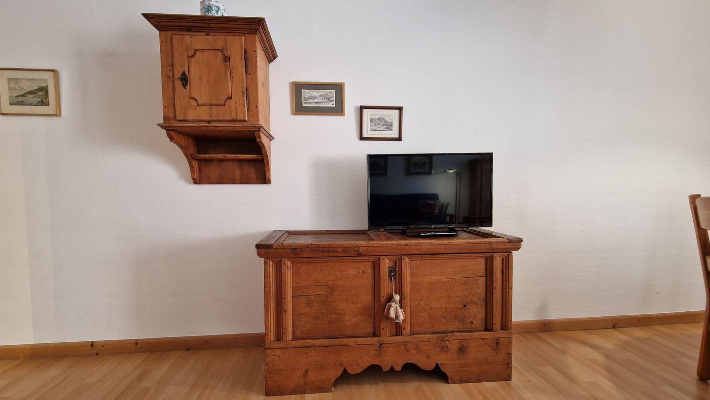 2-Zimmerwohnung, Haus la Vuolp, 3. Stock, 66 m2. Die Wohnung verfügt über ein gemütliches Wohn-/Esszimmer mit Cheminée und Fernseher, ein Schlafzimmer mit einem Doppelbett, ein Bad mit Regendusche und WC, eine moderne Küche mit Backofen, Geschirrspüler, Nesspresso-Kapselmaschine, Toaster und Wasserkocher. Der windgeschützte Balkon bietet einen prächtigen Ausblick in die Berge.