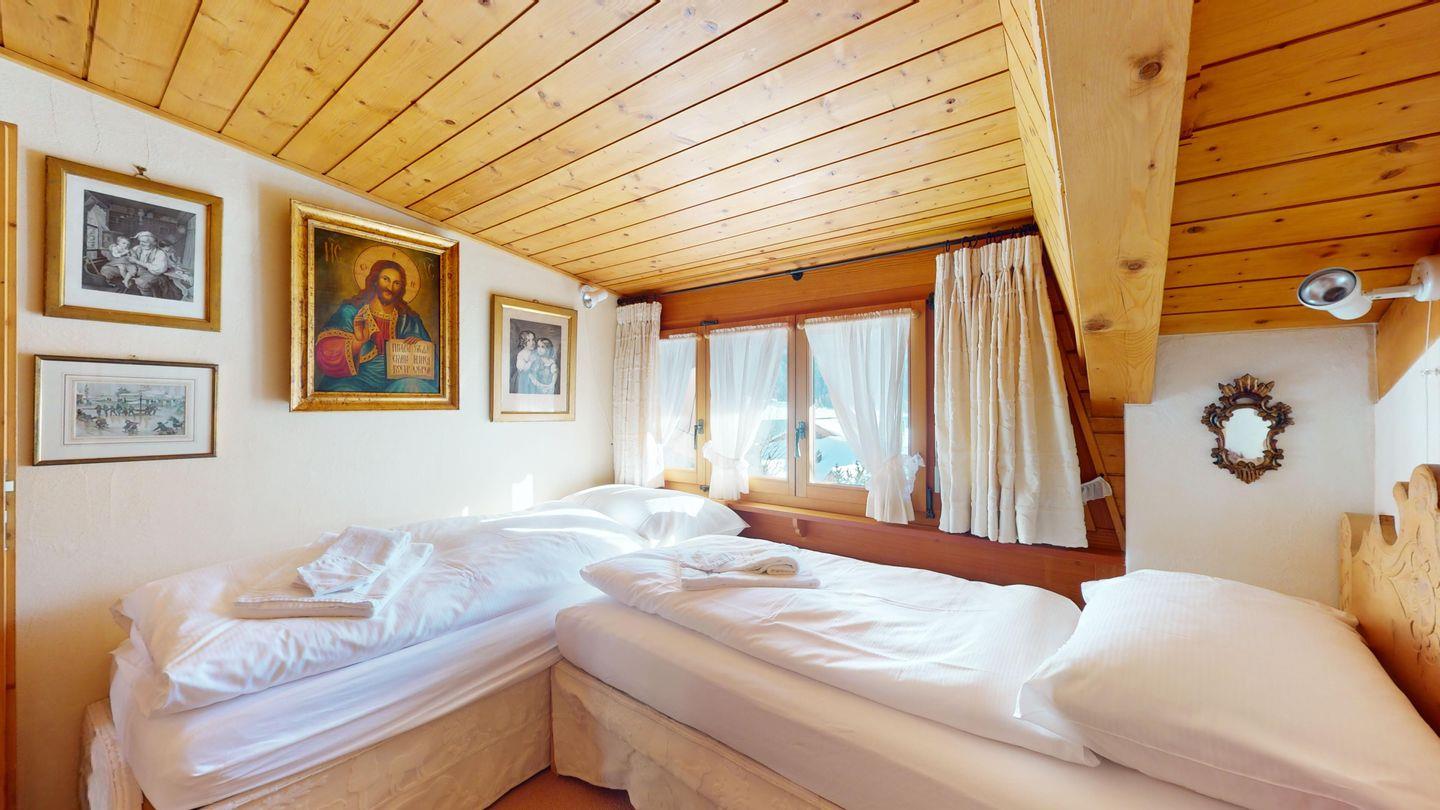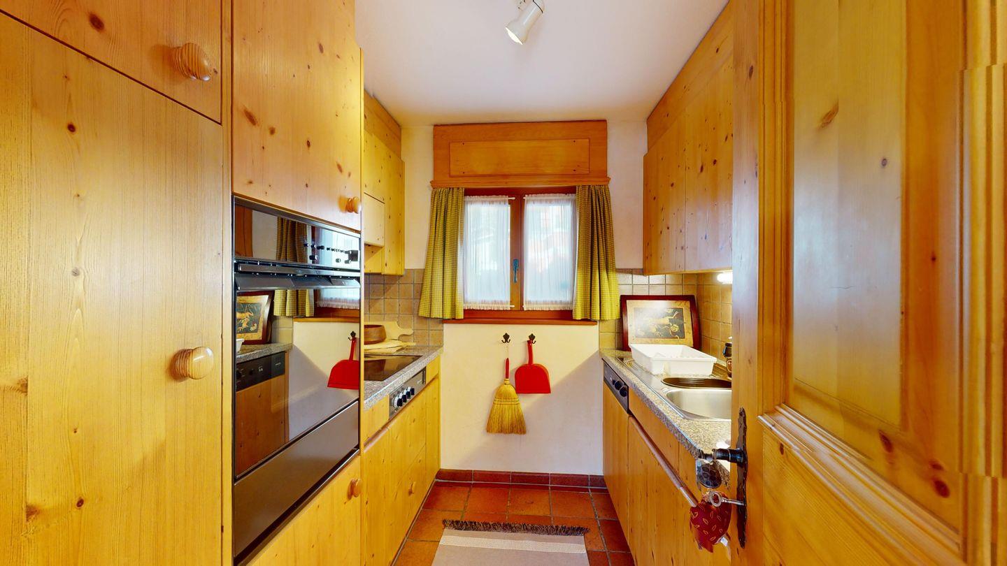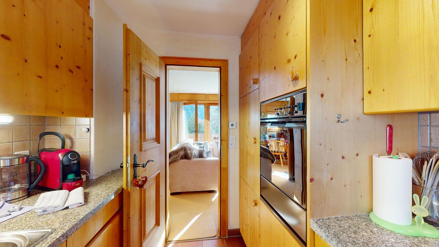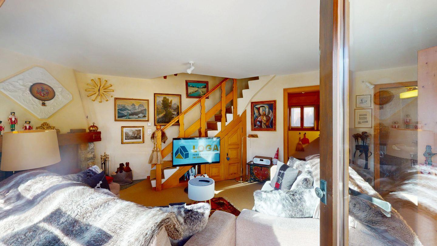 3½-Zimmerwohnung im Dachgeschoss, ca. 90 m², mit separatem Eingang. Wohn-/ Esszimmer mit Kamin und Balkon. Radio und TV. Ruhige Lage mit See- und Bergsicht. Kleine Küche mit Geschirrspüler und Backofen. Chicco d'Oro Kaffeemaschine. Doppelzimmer (2x90x195). Kinderzimmer mit 2x Einzelbetten (2x85x190). Bad/WC/Badewanne. Garagenplatz Nr. 15B. Waschküche und Skiraum zur Mitbenützung. Haustiere sind nicht erlaubt.