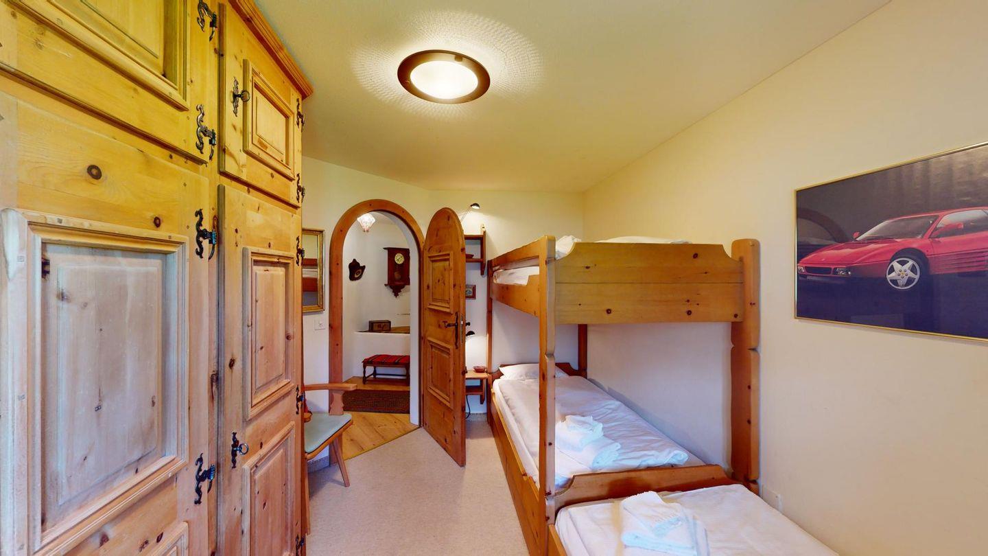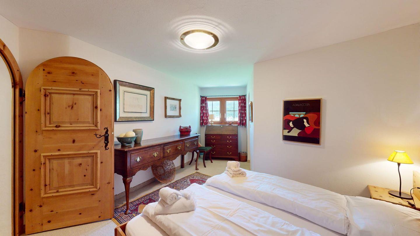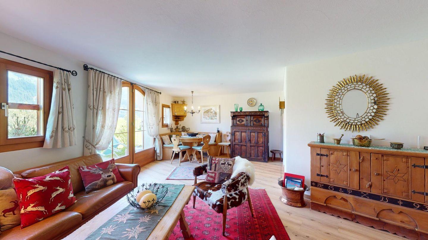 3 1/2-Zimmerwohnung auf zwei Stockwerken, EG/1. Stock, mit 107 m2. Wohn/ Esszimmer mit Kamin und einem Schlafsofa. Sitzplatz Südseite. See- und Bergsicht. Halboffene Küche. Kaffeemaschine CHICCO D'ORO. Mikrowelle. Radio Fernseher (SAT). Doppelzimmer (Kingsize-Doppelbett 180x200) mit Bad/WC/Doppellavabo/Bidet. Zimmer mit Etagenbett und 1 Einzelbett (total 3 Schlafmöglichkeiten, Matratzen 80x190). Dusche/ WC/Doppellavabo. Neue, komfortable Einrichtung. Garagenplatz. Waschküche & Skiraum zur Mitbenützung. Gartenmöbel sind vorhanden. Haustiere sind nicht erlaubt.