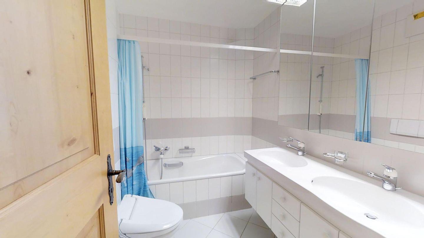 Sonnige 2½-Zimmerwohnung im 1. Obergeschoss, 55 m2, an ruhiger Lage. Wohn-/ Esszimmer mit Ausgang auf den Balkon und einem Sofabett (170x200), Berg- und Seesicht, Radio und TV, geschlossene Küche mit Geschirrspüler und Backofen. Badezimmer mit WC-Closomat/Doppellavabo/Badewanne, Doppelzimmer (2x90x195) mit Ausgang auf den Balkon. Neue, komfortable Einrichtung. Garagenplatz. Waschküche und Skiraum zur Mitbenutzung. Nichtraucherwohnung.