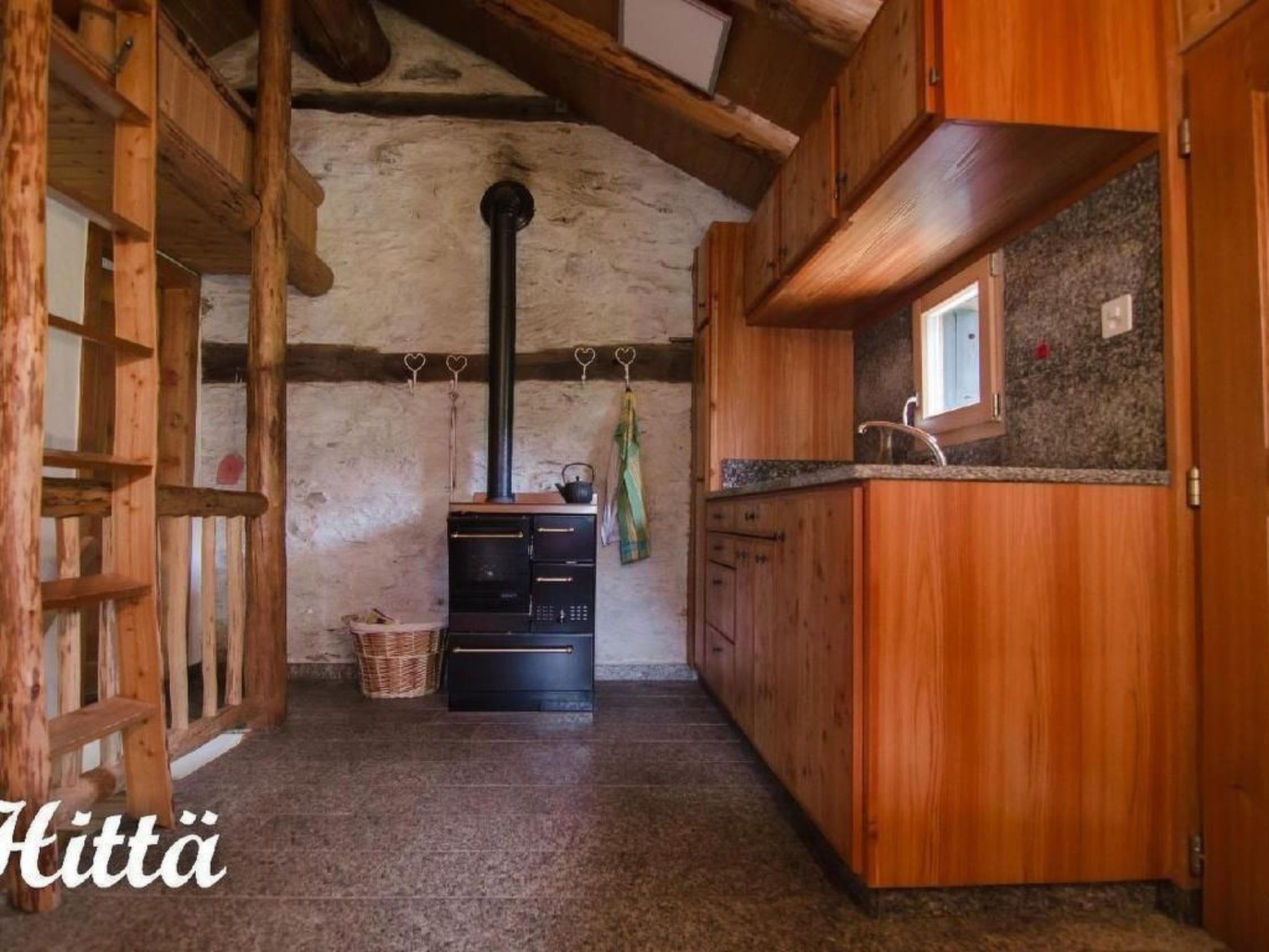 Kitchen-living room, wood-burning stove, dining table, bedroom, toilet with shower