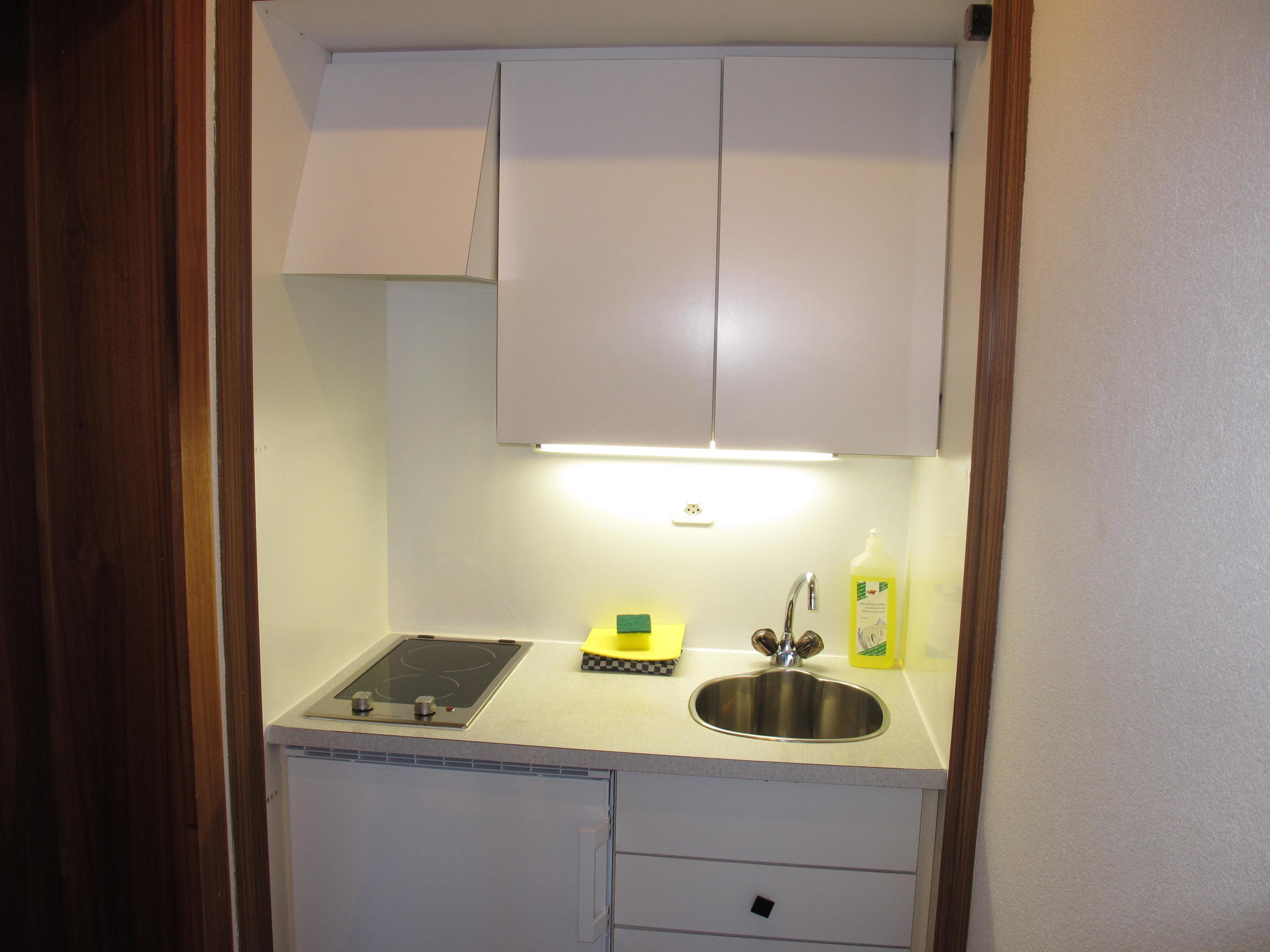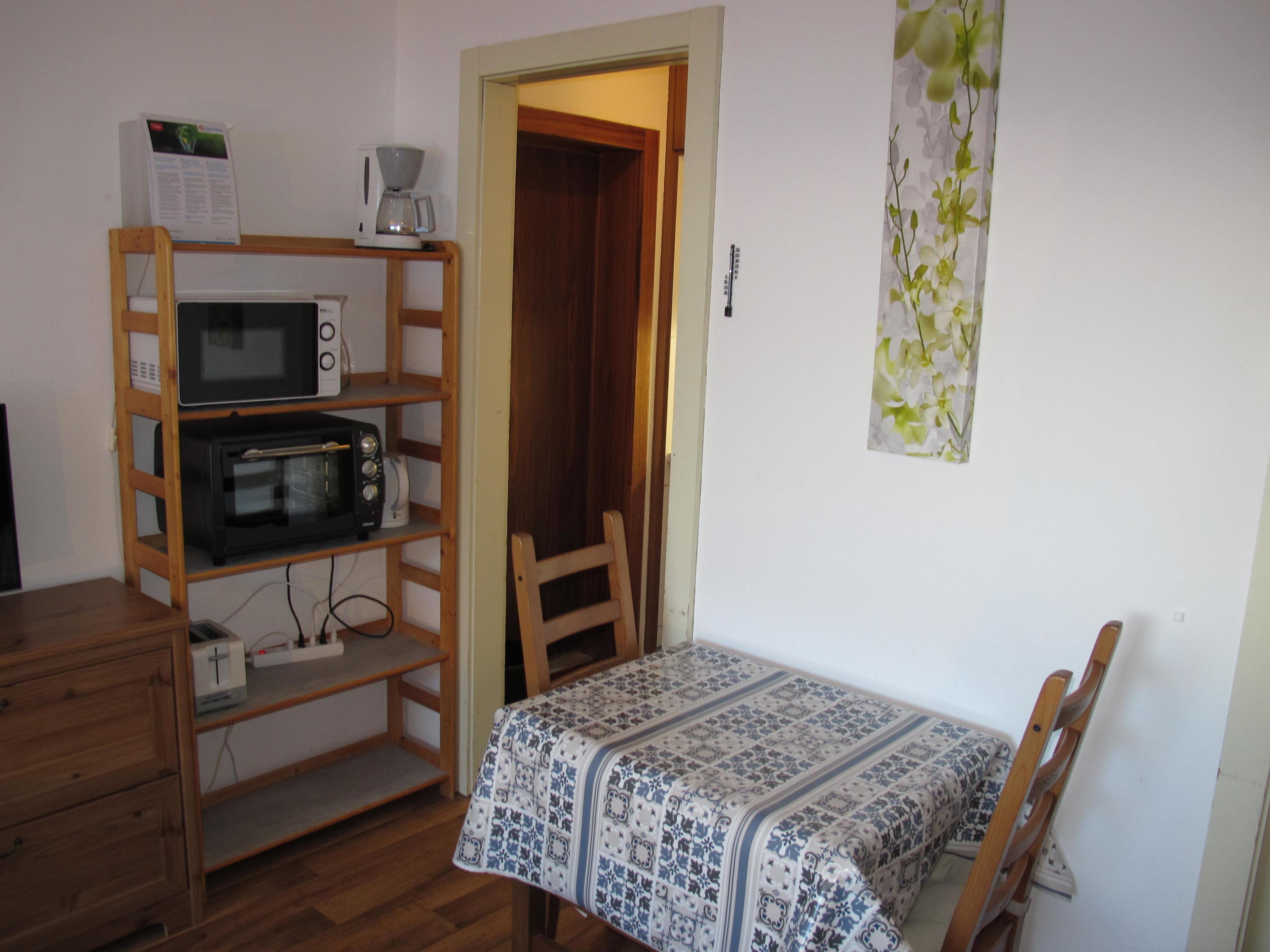 Kleine, gemütliche und gut ausgestattete 1-Zimmer-Wohnung, 2. Etage (Aufzug), ca. 21 m². Wohn-/Schlafraum mit 2 Einzelbetten (je 0,9 x 2m) und Eßplatz. Kleine offene Küche mit 2 Platten, Mikrowelle, Minibackofen, Kühlschrank mit Gerfierfach, Toaster, Kaffeemaschine, Wasserkocher, Fondue-Rechaud und Raclette-Gerät. Dusche/WC.