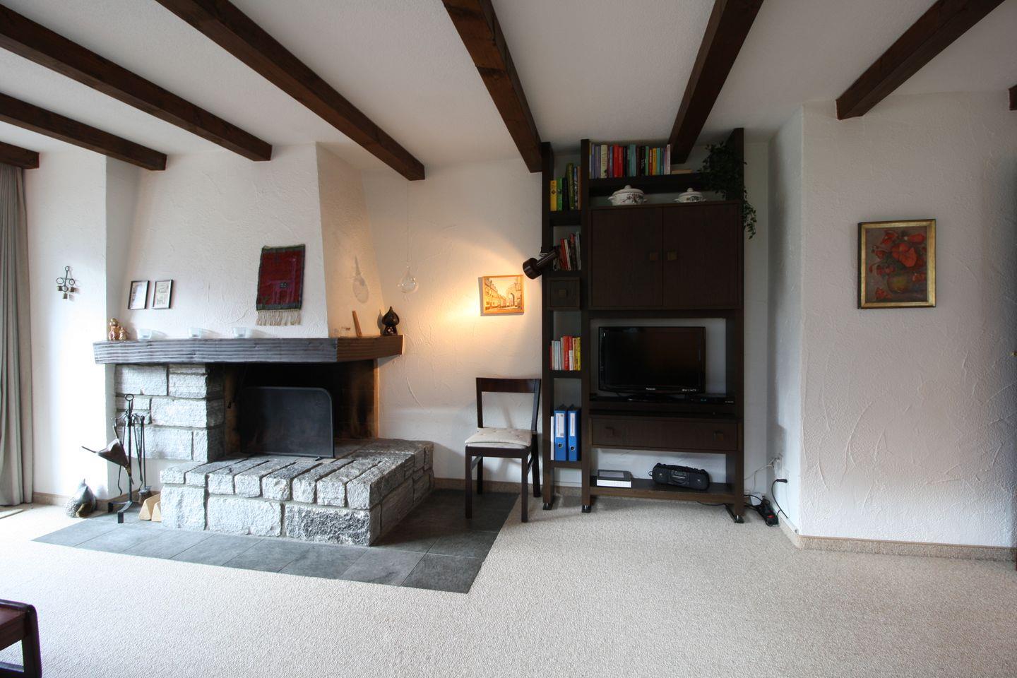 Wohn-/Esszimmer mit Cheminée, TV, Sitzgruppe und Esstisch