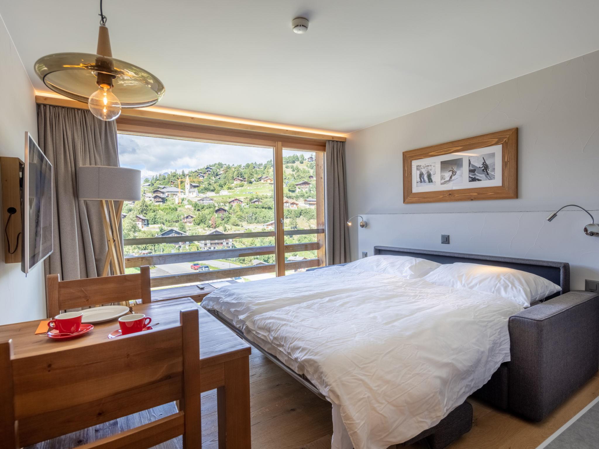 Child friendly, modern, beautiful resort "SWISSPEAK Resorts Vercorin", 1'330 m a.s.l., 6 storeys, built in 2017. 90 apartments in the residence. In the centre of Vercorin, in a quiet position on a slope, 11 km from the lake, 80 m from the skiing area. For shared use: boccia. In the complex: reception, bar, lounge, bistro, WiFi, sauna, steam room, hot tub, playroom, lift, storage room for bicycles, storage room for skis, central heating system, washing machine (extra), tumble dryer (extra). Linen change (suppl. charge extra). Storeroom available. Motor access to the house. In Winter: please take snow chains. Parking, communal covered parking (extra). Dimension: height 225 cm. E-charging station. Grocery 150 m, restaurant 180 m, bar 10 m, bicycle rental 550 m, bus stop "Vercorin, Poste" 400 m, outdoor swimming pool 11 km, indoor swimming pool 13 km, bathing lake "Lac de Géronde, Sierre" 11 km. Golf course (18 hole) 11 km, tennis 650 m, minigolf 700 m, walking paths from the house 100 m, cable car 750 m, gondola lift 80 m, skisport facilities 10 m, slopes 80 m, ski rental, ski bus stop, ski school, children's ski school 20 m, sled run 650 m, ice rink 550 m, children's playground 650 m. Nearby attractions: Fôret aventures Vercorin 1.5 km, Les moulines de St-Luc 17 km, Trottinette tout terrain St-Luc 17 km, Observatoire François-Xavier Bagnoud 20 km, Château de Tourbillon 20 km, Barrage de Moiry 24 km. Well-known ski regions can easily be reached: Grimentz Zinal 15 km, St-Luc Chandolin 17 km, Crans Montana 27 km. Hiking paths: Vallon de Réchy 500 m, Grimentz 14 km, Zinal 19 km. Please note: car recommended. Suitable for families. Groups of teenagers on request only. Ski bus (free of charge). In case of good snow conditions, the house is accessible on skis. Loading and unloading of baggage is possible at the holiday house. The photo is just an example. Additional equipment available: ATM, Gaming Room, après-ski bar: 20m. SPA for guests 16 years and over, towels can be rented for CHF 2.- each.
