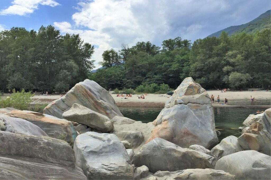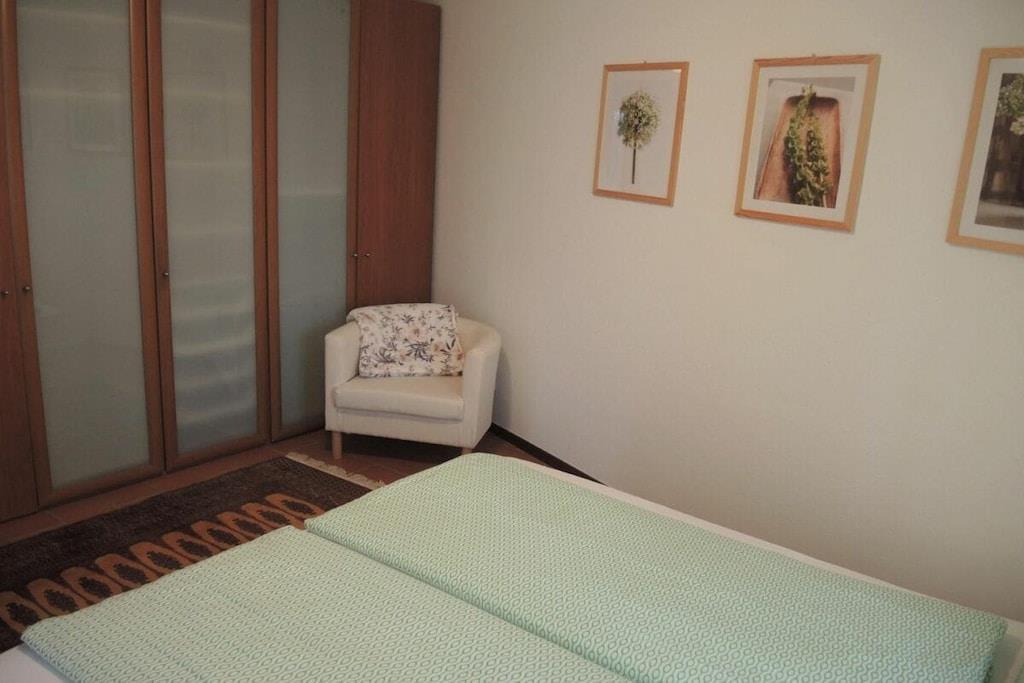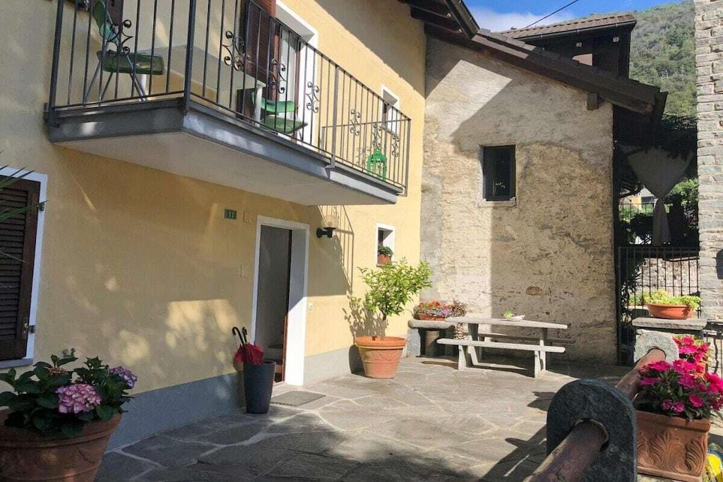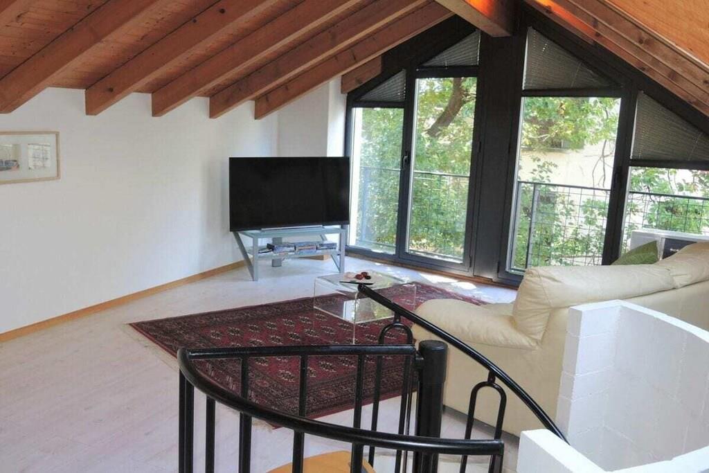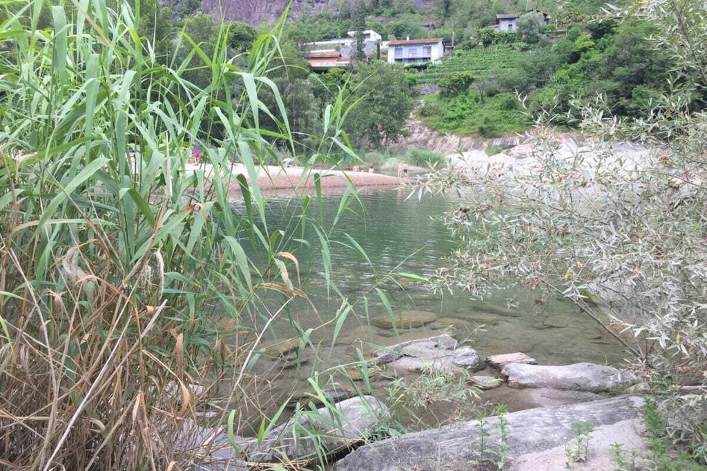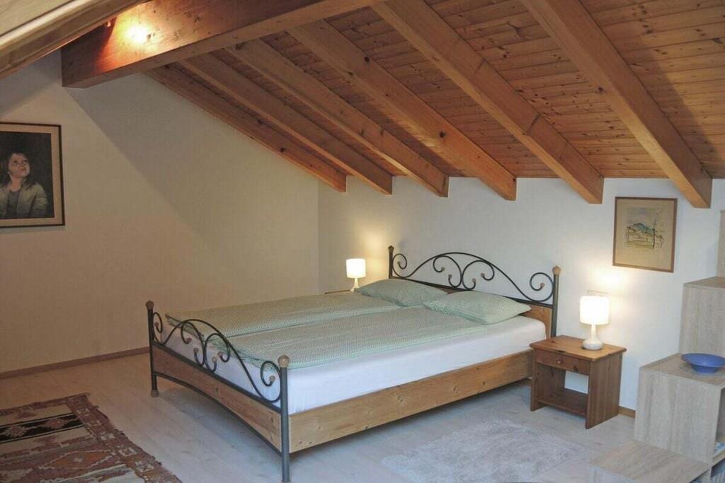 Experience the unique atmosphere following in the footsteps of the world-famous clown Dimitri. This charming holiday home with a special flair is just steps away from the Teatro Dimitri. In addition to excellent cultural activities, the surrounding area offers a variety of activities such as climbing, llama trekking, wild beaches along the river, and more. The region is also a paradise for hikers and nature lovers. • 5-room house on 3 floors • Central location in the village center of Verscio • Restaurants and shops within walking distance . Ground floor (entrance area) • Wardrobe, wall mirror • Bathroom with bathtub, sink, toilet, hairdryer • 1 double bedroom, queen-size bed (160 cm) • Large wardrobe, armchair • 1 bedroom with single bed (140 cm), chest of drawers • Storage room with washing machine and tumble dryer • Private garden seating area with stone table . 1st Floor (Living Area) • Living room with sofa, armchair, coffee table, and fireplace • Fireplace (not available for use) • Exit to balcony with table and 2 chairs • Open, well-equipped modern kitchen with dining table • Ceramic hob, oven, microwave • Refrigerator, freezer • Dishwasher • Kettle, toaster (sandwich toaster) • Nespresso coffee machine (please bring your own capsules) • Bathroom with shower, sink, toilet . 2nd Floor (Attic) • Spiral staircase to the open-plan living/sleeping area • Living room with sofa and TV • 1 double bed, 160 cm • Air conditioning • Public parking approximately 150 m away • Two deck chairs • Pets on request • No smoking, please smoke only outdoors • Heating costs mandatory from the beginning of November to the end of March: CHF 85 per week • Deposit CHF 800 upon credit card payment
