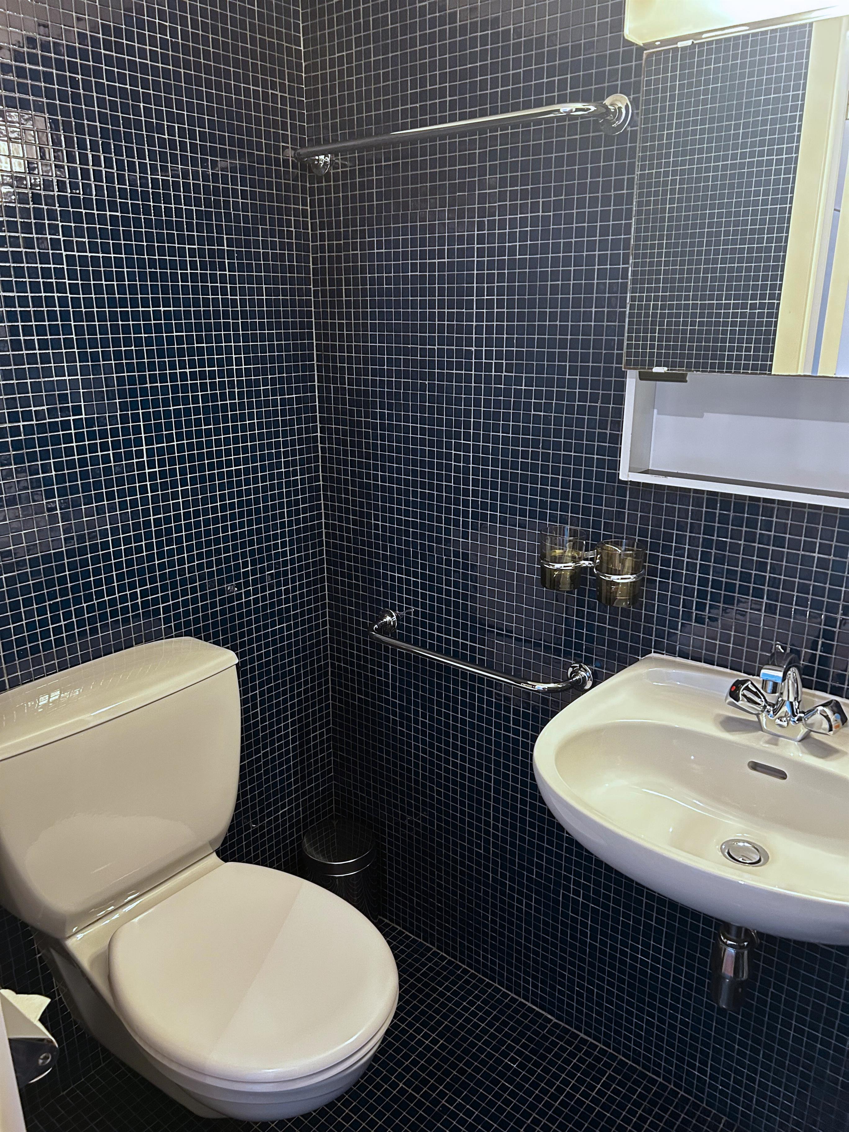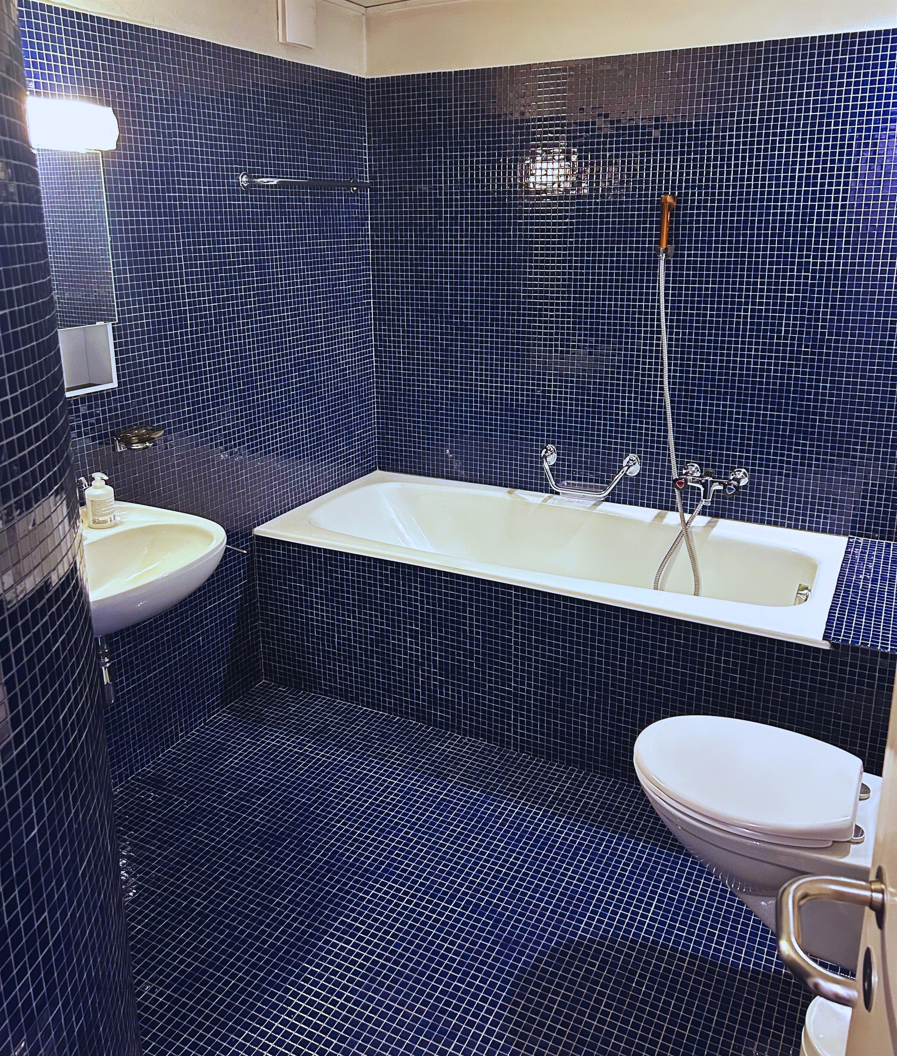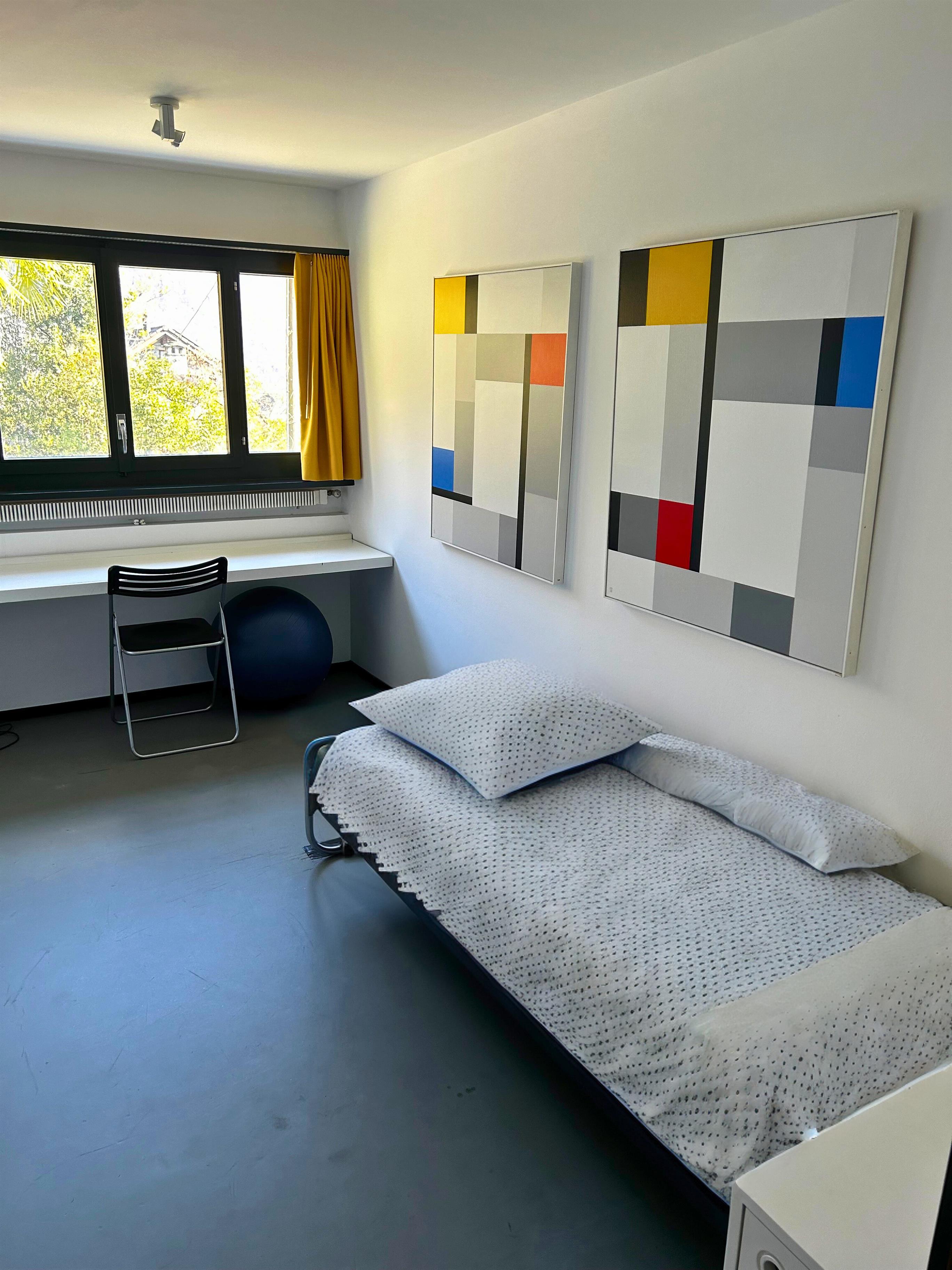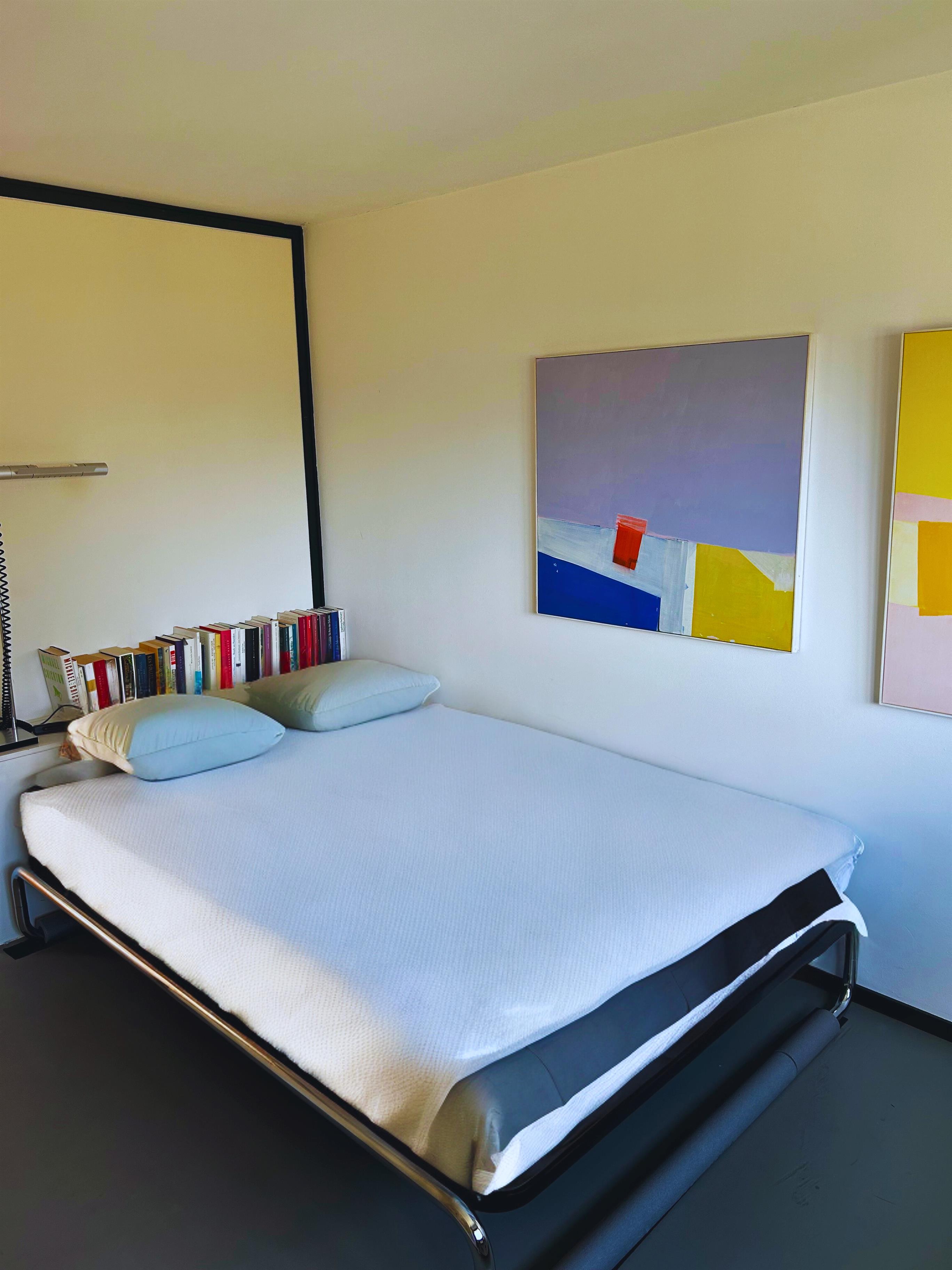 Alle im Haus verwendeten Farben entsprechen dem originalen Farbkonzept. So präsentieren sich die Trennwände der Schlafzimmer sowie die Einbauschränke in einem satten, glänzenden Gelb. Das großzügige Badezimmer leuchtet strahlend blau.