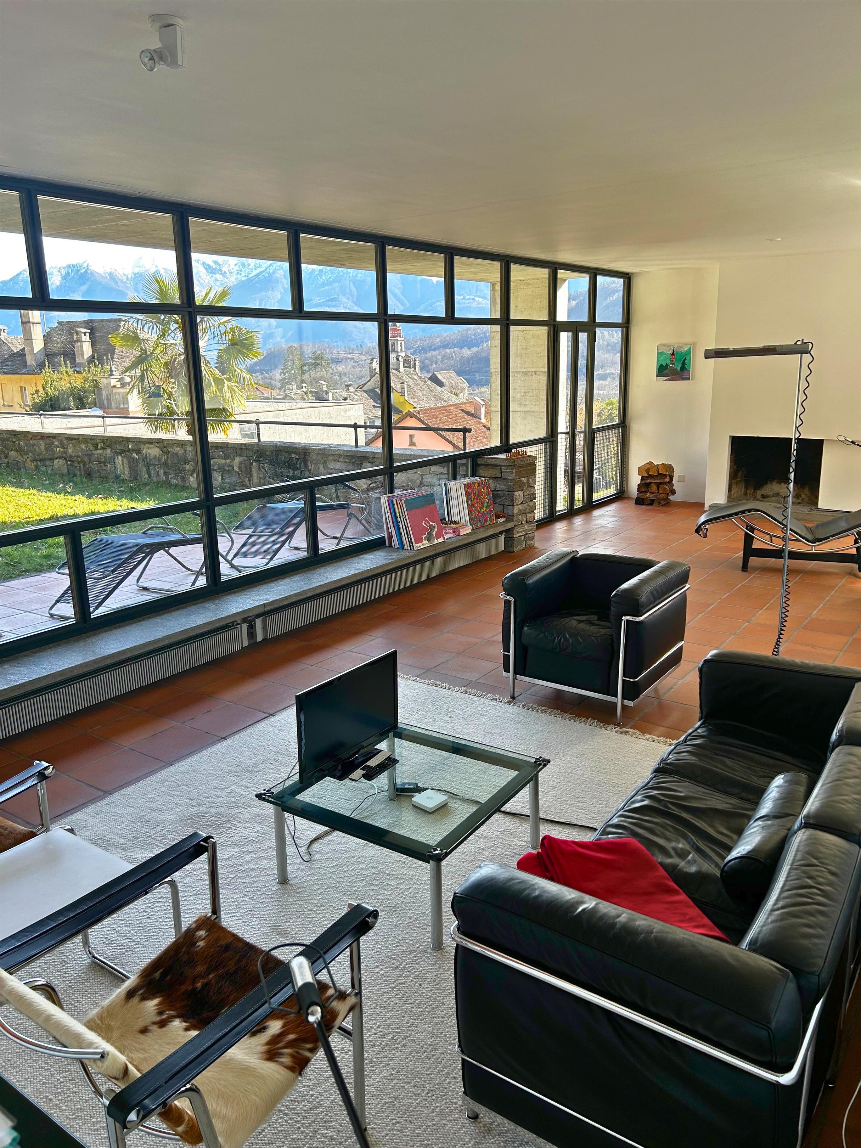 In der ersten Ebene angekommen, weitet sich der Blick. Das lichtdurchflutete, mit Möbeln und Drucken bekannter Design-Ikonen ausgestattete Wohnzimmer öffnet sich über eine wandfüllende Fensterfront zum Garten hin. Die Bruchsteinmauer der Terrasse reicht bis in Wohnzimmer hinein. So entsteht ein kunstvoller wie stimmungsvoller Dialog zwischen Innen und Außen, der durch großartige Aussichten auf Verscio und die Bergwelt gekrönt wird. An kühlen Tagen lädt die Chaise Longue von Le Corbusier zu entspannten Lesestunden vor dem Kamin ein. Eine erlesene Buchauswahl haben Sie dabei unmittelbar zur Hand.