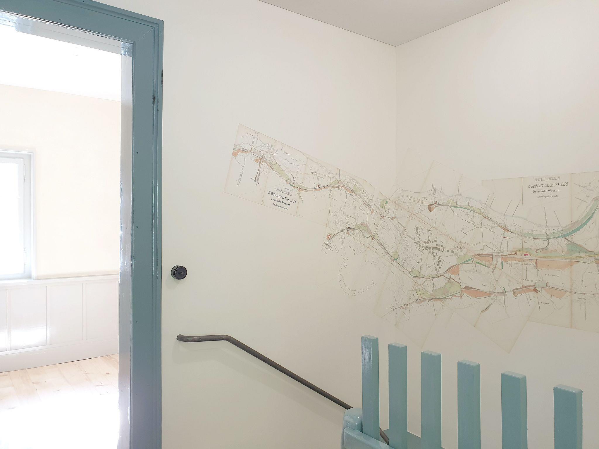 In the larger bedroom on the upper floor, guests sleep in a huge reclaimed wood bed (three 90cm mattresses). An antique farmer's wardrobe provides space for the wardrobe, a desk with a wooden chair is used for sitting, reading or writing and the very youngest members of the Bahnwärter family sleep in an old cradle in the parents' room.