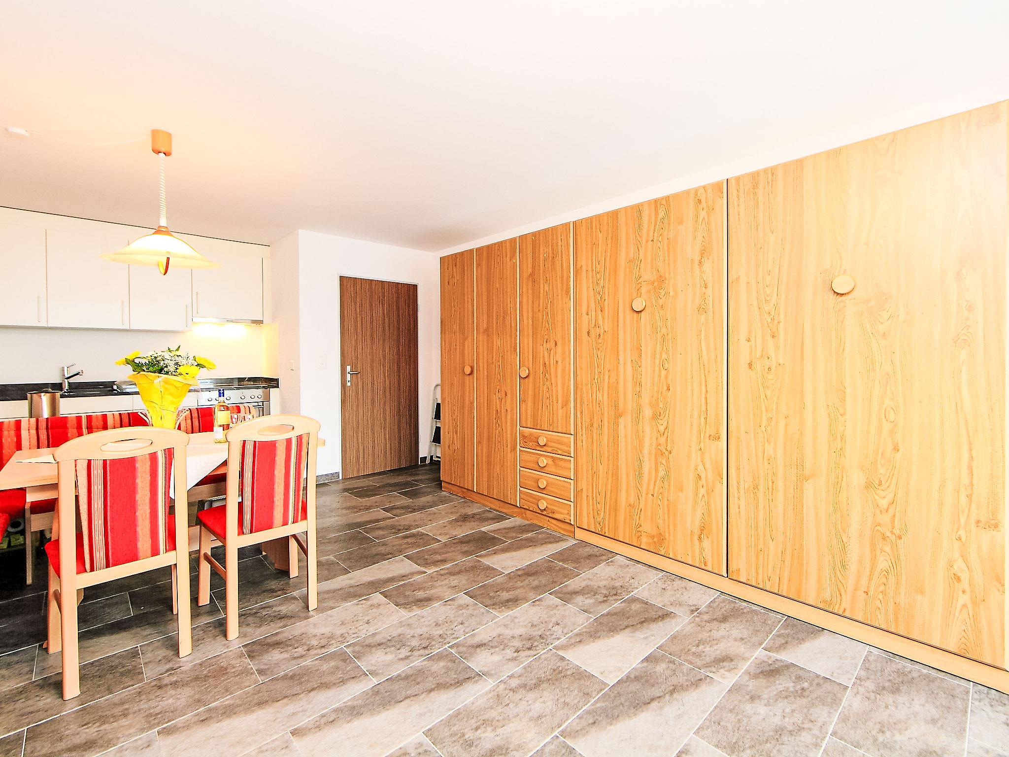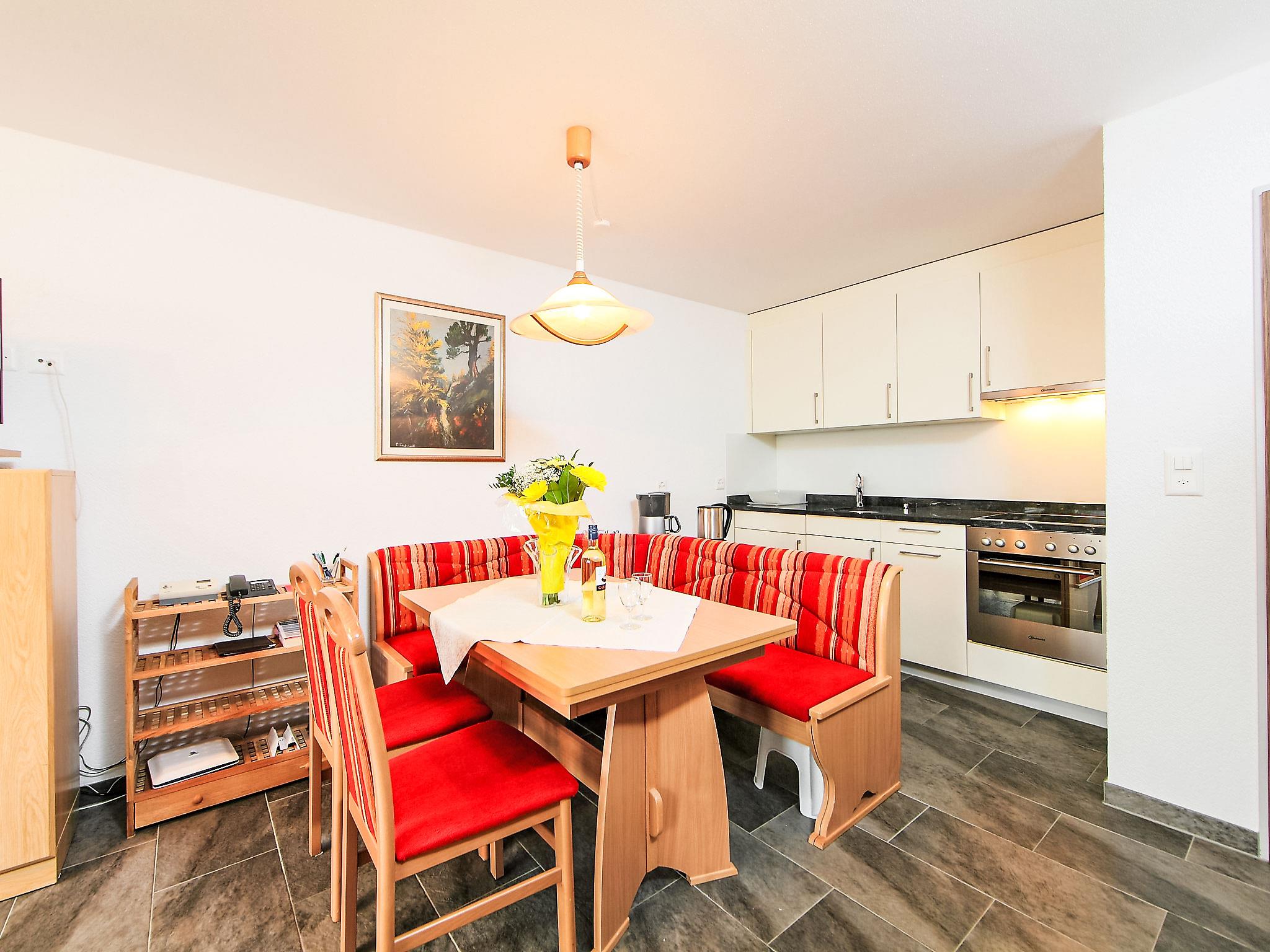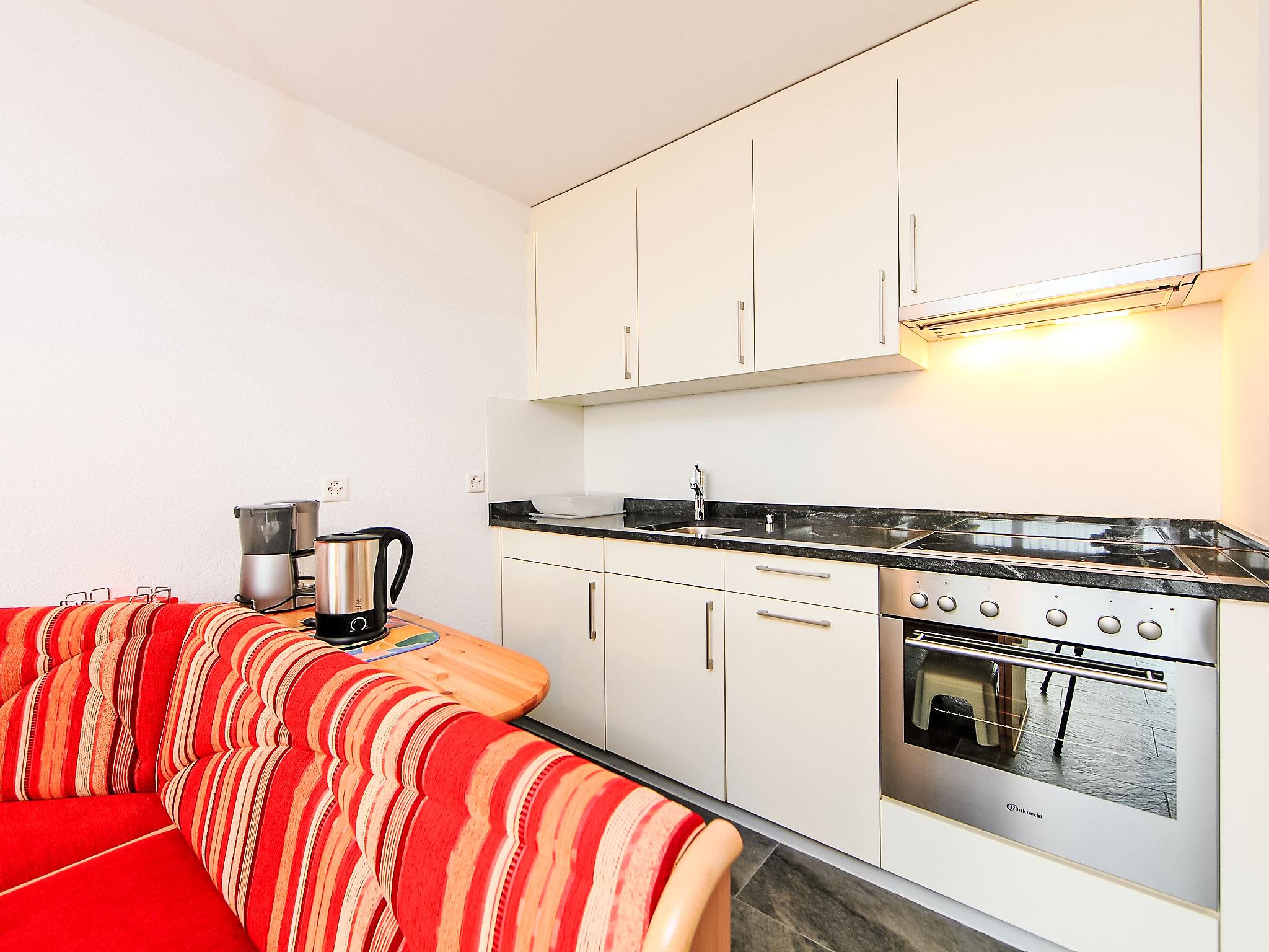 1-room apartment 35 m2 on 3rd floor, south-west facing position. Bright, tasteful and cosy furnishings: living/sleeping room with 2 fold-away beds (90 cm, length 200 cm), TV. Exit to the balcony. Open kitchen (oven, 4 ceramic glass hob hotplates, toaster, kettle, freezer, electric coffee machine, raclette grill, fondue Set (cheese)) with dining nook. Shower/WC. Floor heating. Balcony, south facing position and west facing position. Balcony furniture. Beautiful view of the Matterhorn. Facilities: Internet (WiFi, free). Please note: non-smokers only.