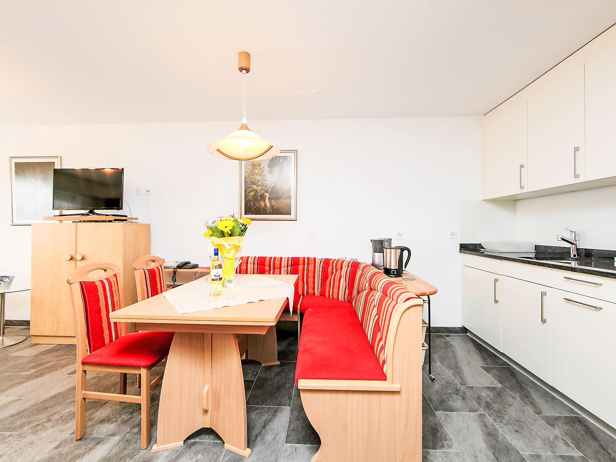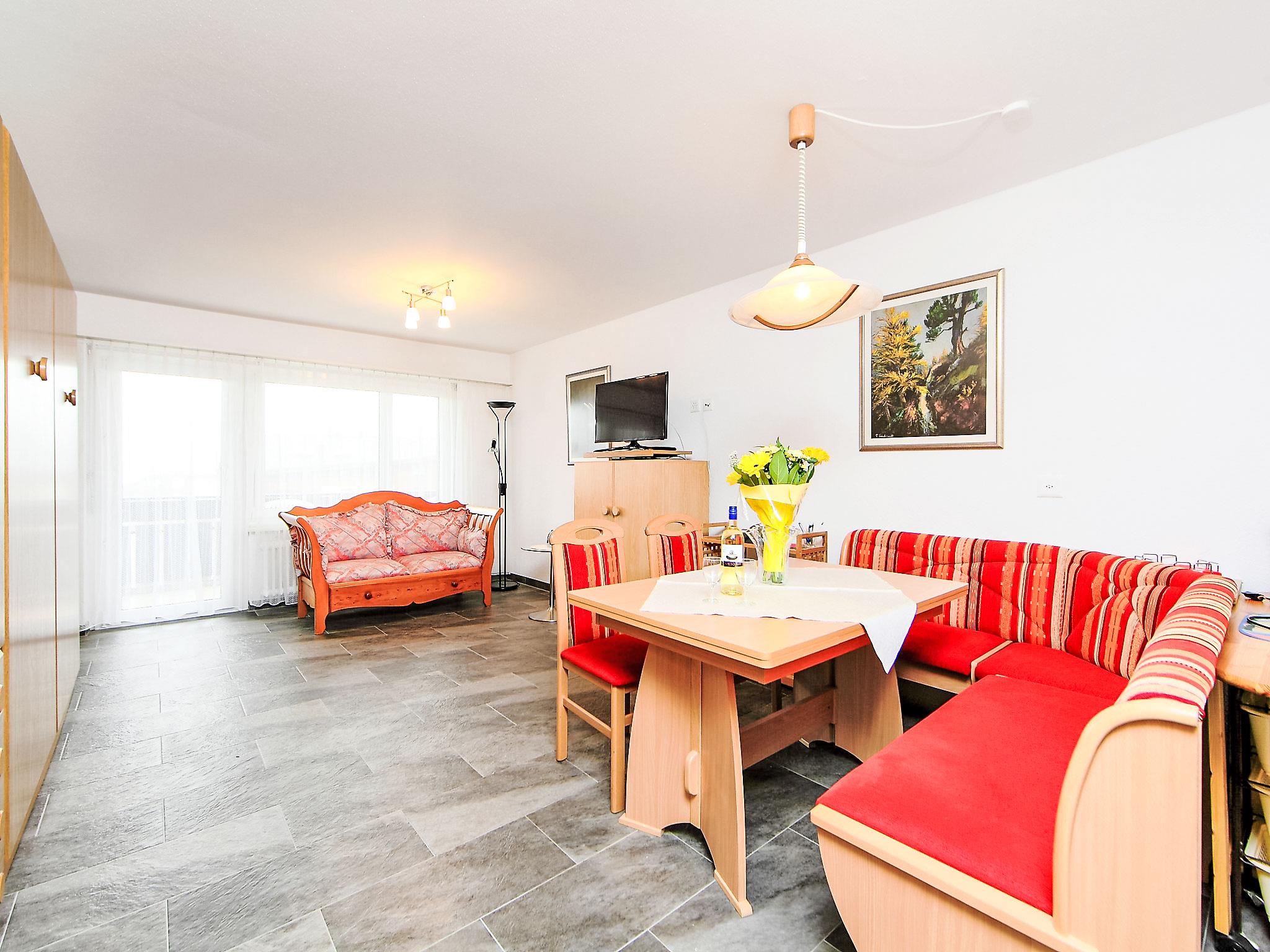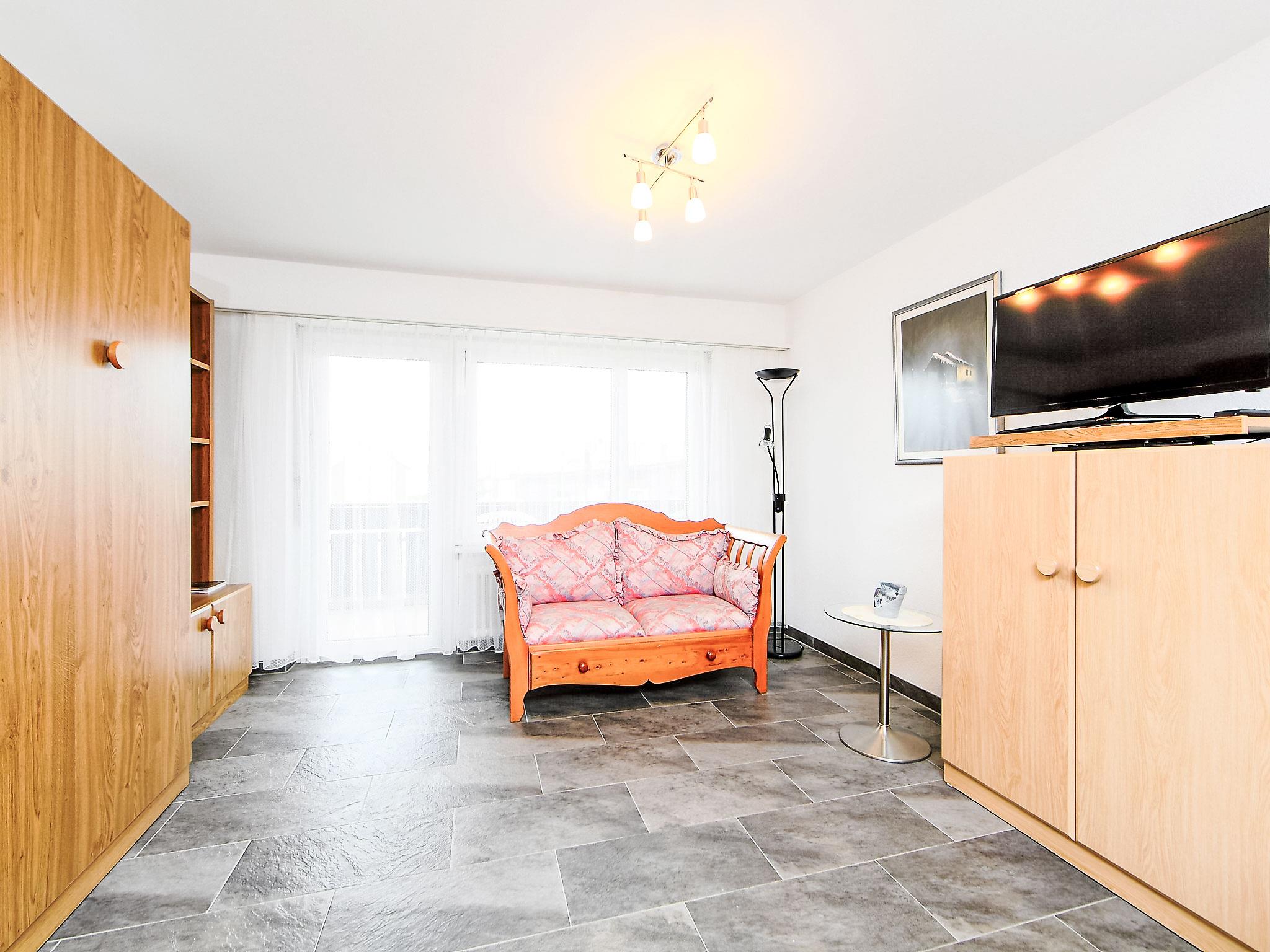 1-room apartment 35 m2 on 3rd floor, south-west facing position. Bright, tasteful and cosy furnishings: living/sleeping room with 2 fold-away beds (90 cm, length 200 cm), TV. Exit to the balcony. Open kitchen (oven, 4 ceramic glass hob hotplates, toaster, kettle, freezer, electric coffee machine, raclette grill, fondue Set (cheese)) with dining nook. Shower/WC. Floor heating. Balcony, south facing position and west facing position. Balcony furniture. Beautiful view of the Matterhorn. Facilities: Internet (WiFi, free). Please note: non-smokers only.