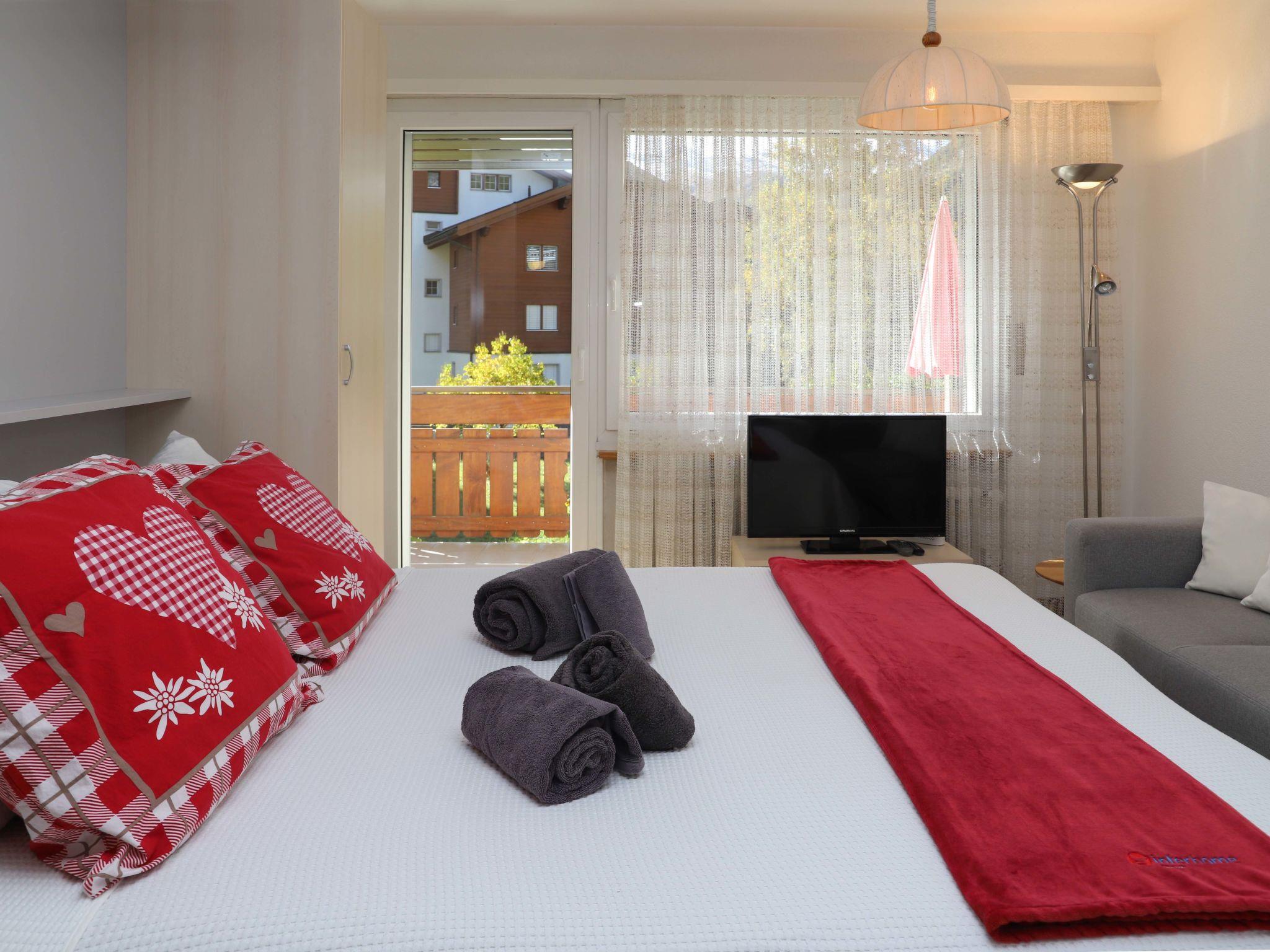 2-room apartment 53 m2 on 1st floor, south facing position. Bright, simple and cosy furnishings: living/sleeping room with 2 fold-away beds (90 cm, length 190 cm), TV, CD-player and DVD. Exit to the balcony, south facing position. 1 room with 2 beds (90 cm, length 190 cm). Exit to the balcony, south facing position. Open kitchen (oven, dishwasher, 3 ceramic glass hob hotplates, microwave, freezer). Bath/WC. Heating. Parquet floors. Balcony, south facing position. Beautiful view of the Matterhorn. Facilities: Internet (WiFi, free). Please note: non-smokers only.