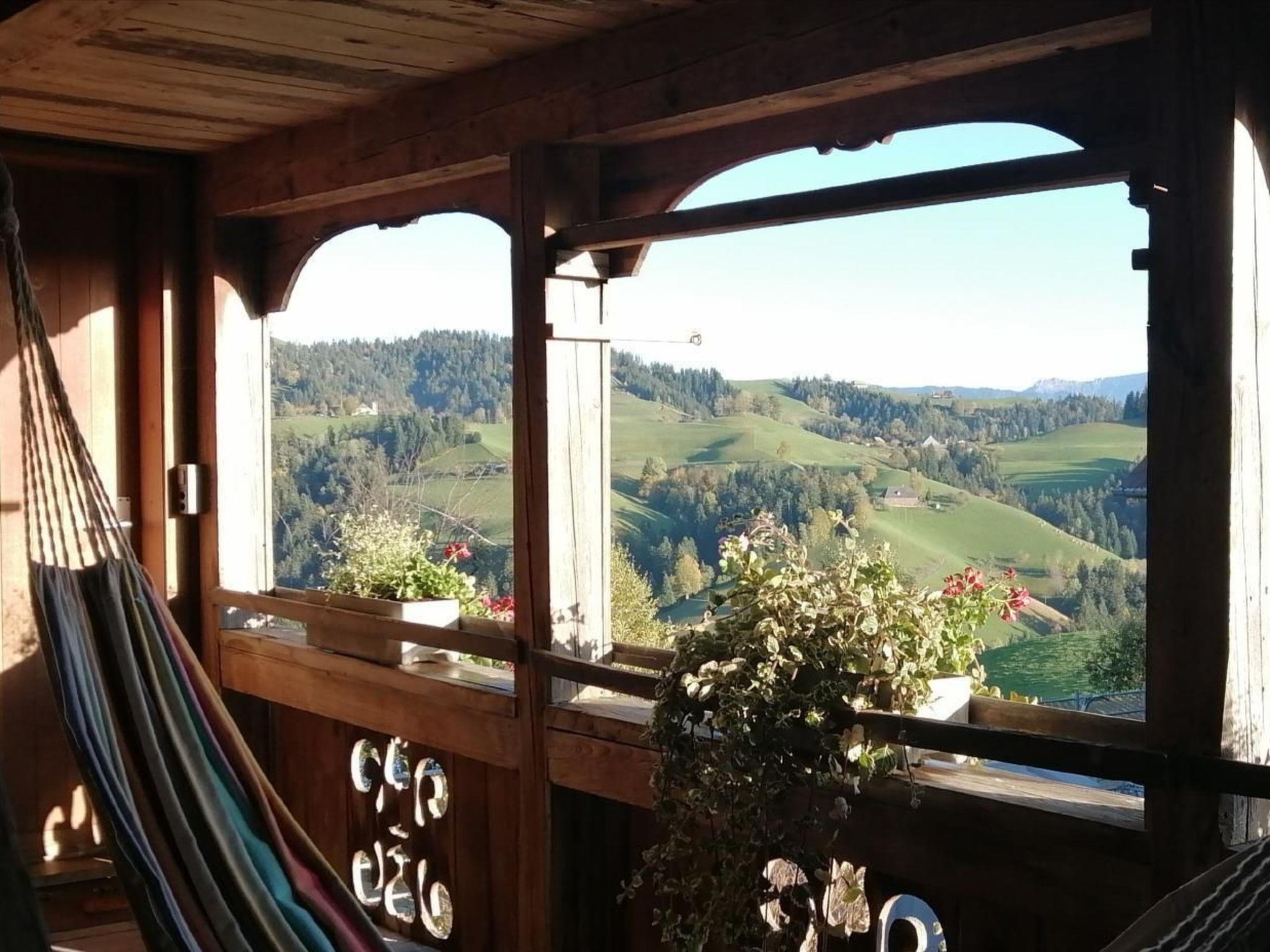 Bauern-Speicher (Spycher) 915 metres above sea level. Sunny and quiet location in the countryside with views of the surrounding Emmental hills and Bernese Alps. Ideal for hikers, families and anyone looking for relaxation away from everyday life. Space for up to 6 people, but also ideal for two. Dogs are welcome! our farm is home to a herd of suckler cows in winter and goats in summer (which are milked outside in the milking parlour in the morning and evening). the tinkling of the cow or goat bells gives your stay a rustic alpine feeling.... The Spycher is an ideal starting point for various panoramic hikes or bike tours. (e.g. Lüdernalp, Napf, Moosegg) A cosy tiled stove in the parlour provides warmth and comfort in winter or on wet and cold rainy days. Weekly price: Fr.665.- (7x Fr.95.-)Additional costs obligatory and to be paid on site in cash in CHF: Final cleaning Fr. 100.- / bed linen Fr.10.- per person. Pets are allowed (Fr. 5.- per pet and night) Short stay possible from 2 nights. Prices per night Fr. 105.- (from 3 nights Fr. 95.-) Additional costs obligatory (as described above.) Equipment: The flat consists of 4 rooms. Ground floor: 1 living room with 2 sofas (one can be used as a sofa bed) and TV. 1 dining room with table, corner bench and tiled stove. Kitchen with dishwasher, ceramic hob, oven, fridge with freezer compartment. 1 bathroom with 1 WC, washbasin and shower. 1 bedroom with double bed. (1 baby cot is available free of charge)First floor: 1 bedroom with 1 bunk bed and 2 single beds, which is only accessible from the outside via the pergola and certainly has a special charm for children. Total area approx. 70 m2. Ideal for up to 6 people.heating: bedroom and lounge with electric stove, rest of the flat with wood heating (tiled stove) Other facilities: satellite TV, Internet W-Lan, parking space for the car, terrace with seating area and covered seating area (arbour), cot for free use, barbecue, swing with slide, large sandpit, hammock in the arbour, 3 deckchairs.