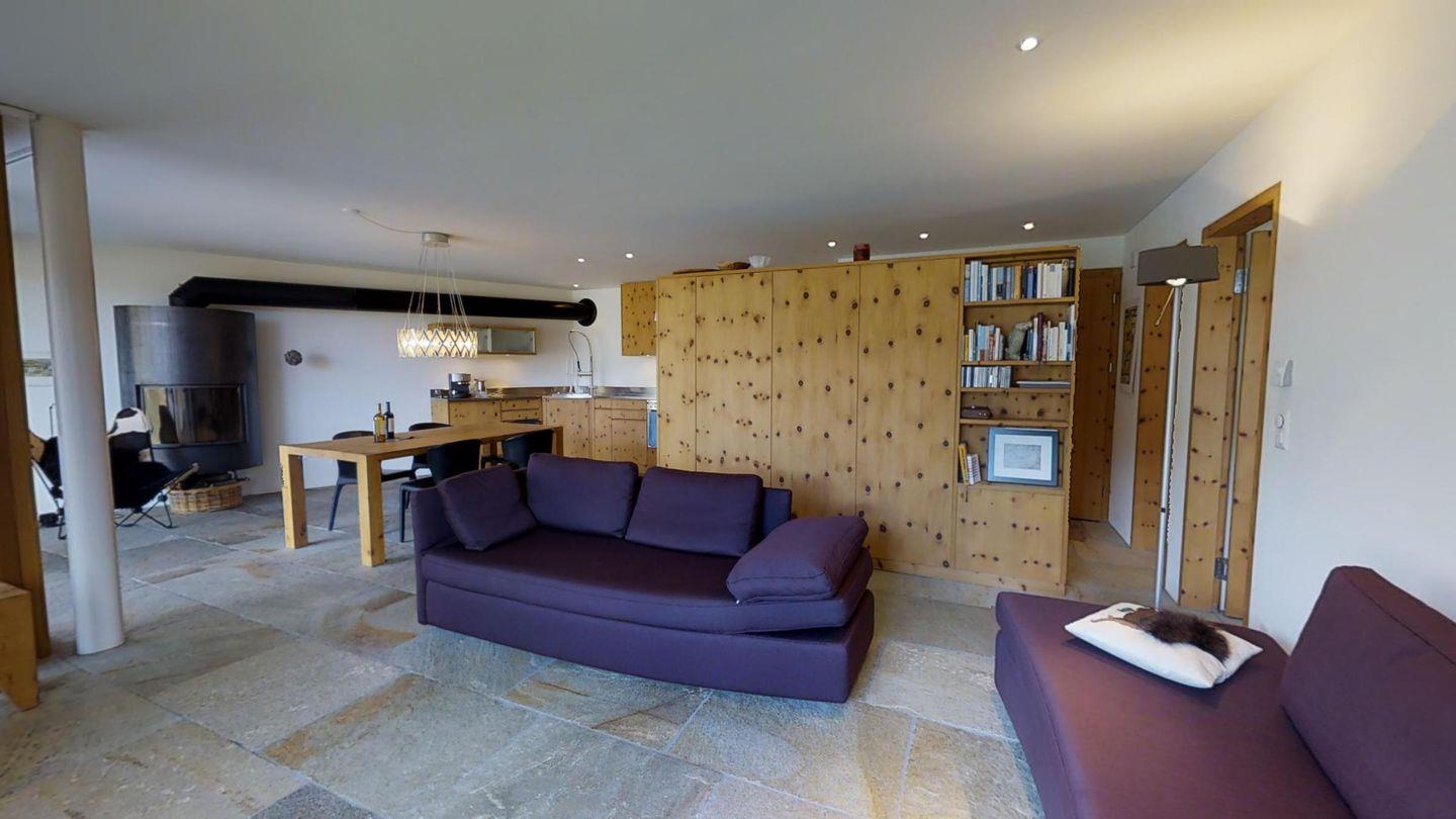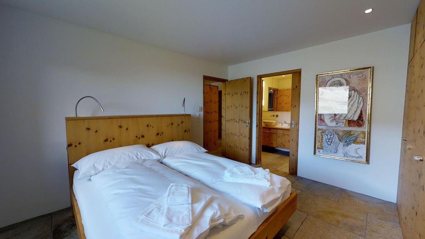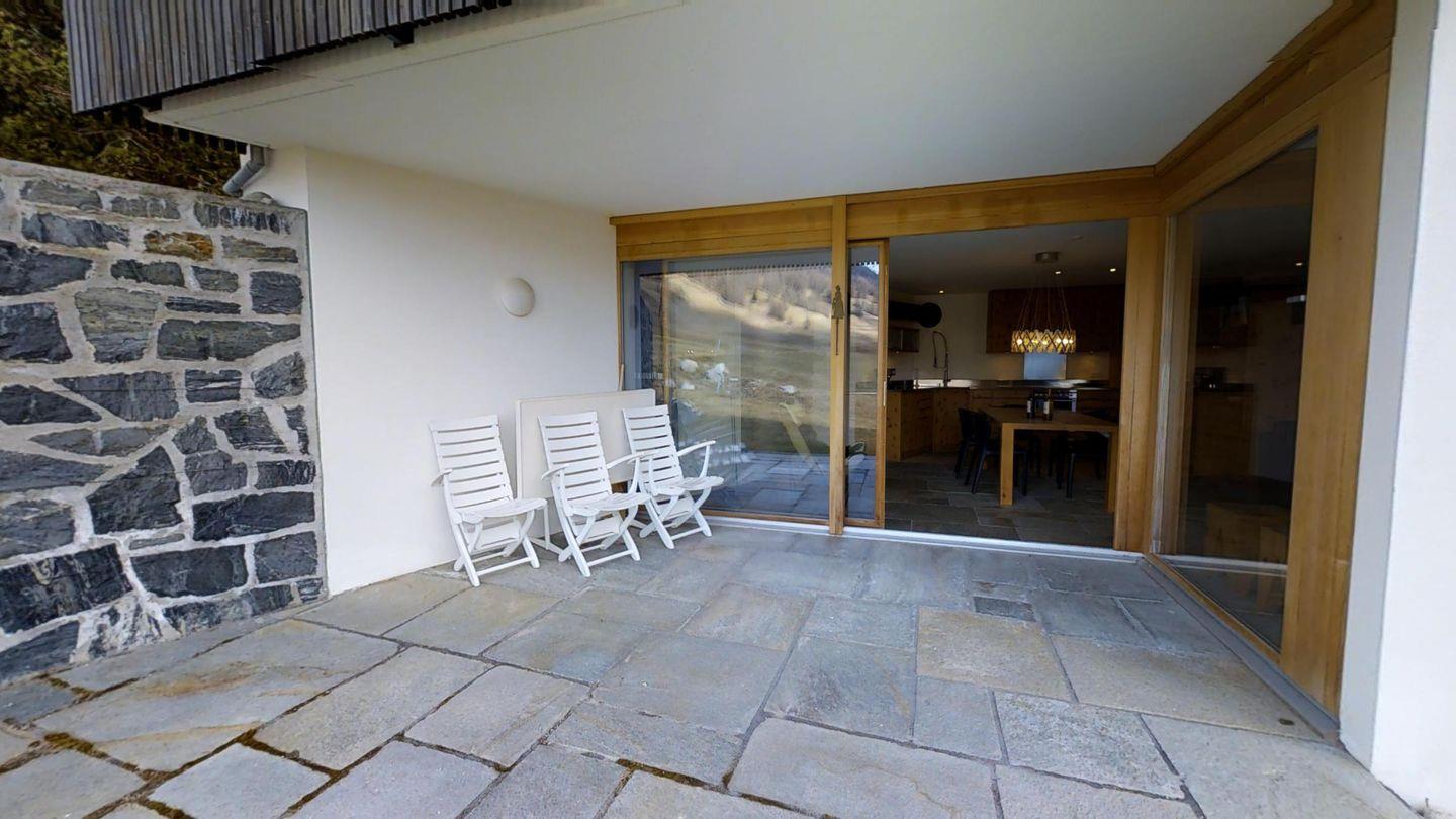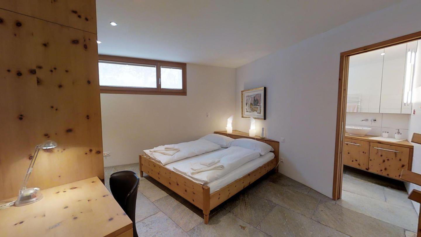 Sehr geschmackvoll eingerichtete 3½ Zimmerwohnung im Erdgeschoss ca. 110m2. Eingang mit Garderobe. Doppelschlafzimmer mit eigenem Bad mit Wanne, Lavabo, WC und Fenster. Wohn-/Esszimmer mit Kamin und Gartensitzplatz. Schöne Aussicht. TV, Radio und Internet. Offene Küche mit Kühlschrank/Gefrierfach, Backofen, Chicco d'Oro Kaffeemaschine, Geschirrspülmaschine. Schrank mit Waschmaschine und Tumbler. Doppelschlafzimmer mit Badezimmer mit Dusche, Doppellavabo und WC. Alles Steinböden. Ein Garagenplatz, Haustiere sind erlaubt.