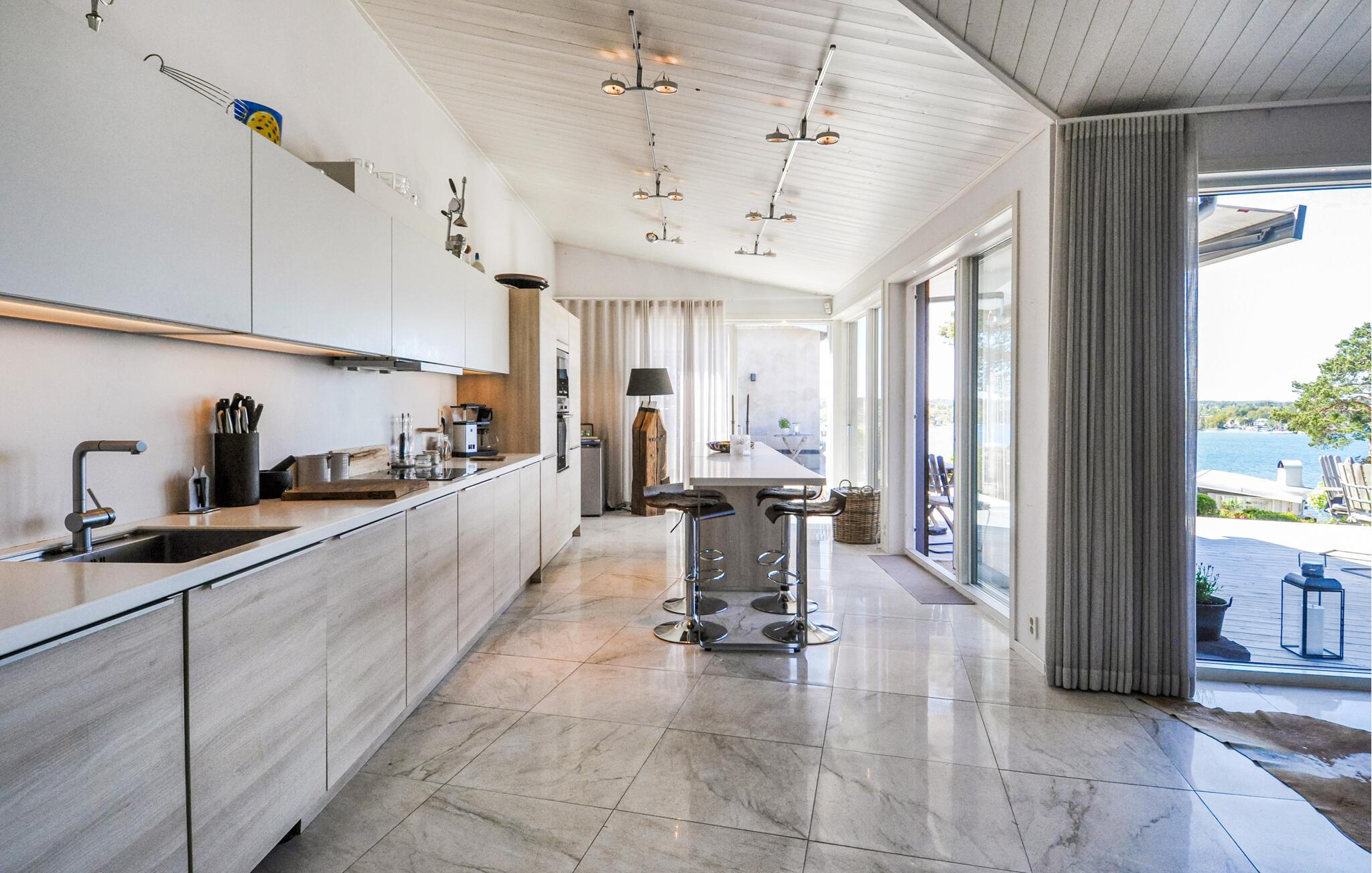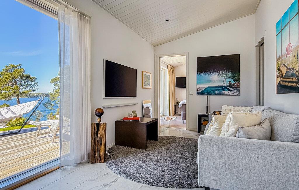 Tilbring en eksklusiv ferie på øya Algö i dette romslige feriehuset med enestående utsikt over vannet. Kombinasjonen av moderne arkitektur, naturskjønne omgivelser og sofistikert komfort i hovedhuset skaper de ideelle forholdene for uforglemmelige dager ved sjøen. La deg bli ønsket velkommen av lyse rom, store glassfronter og en åpen planløsning. Slapp av i komfortable designermøbler med utsikt over bukten, eller nyt samværet i det elegante kjøkkenet med kjøkkenbenk og spisebord. Trekk deg tilbake i sofaen med en bok, eller nyt filmkvelder sammen i den smakfullt møblerte stuen. Alle rommene har utgang til utsiden, noe som gir et flytende samspill mellom inne og ute.