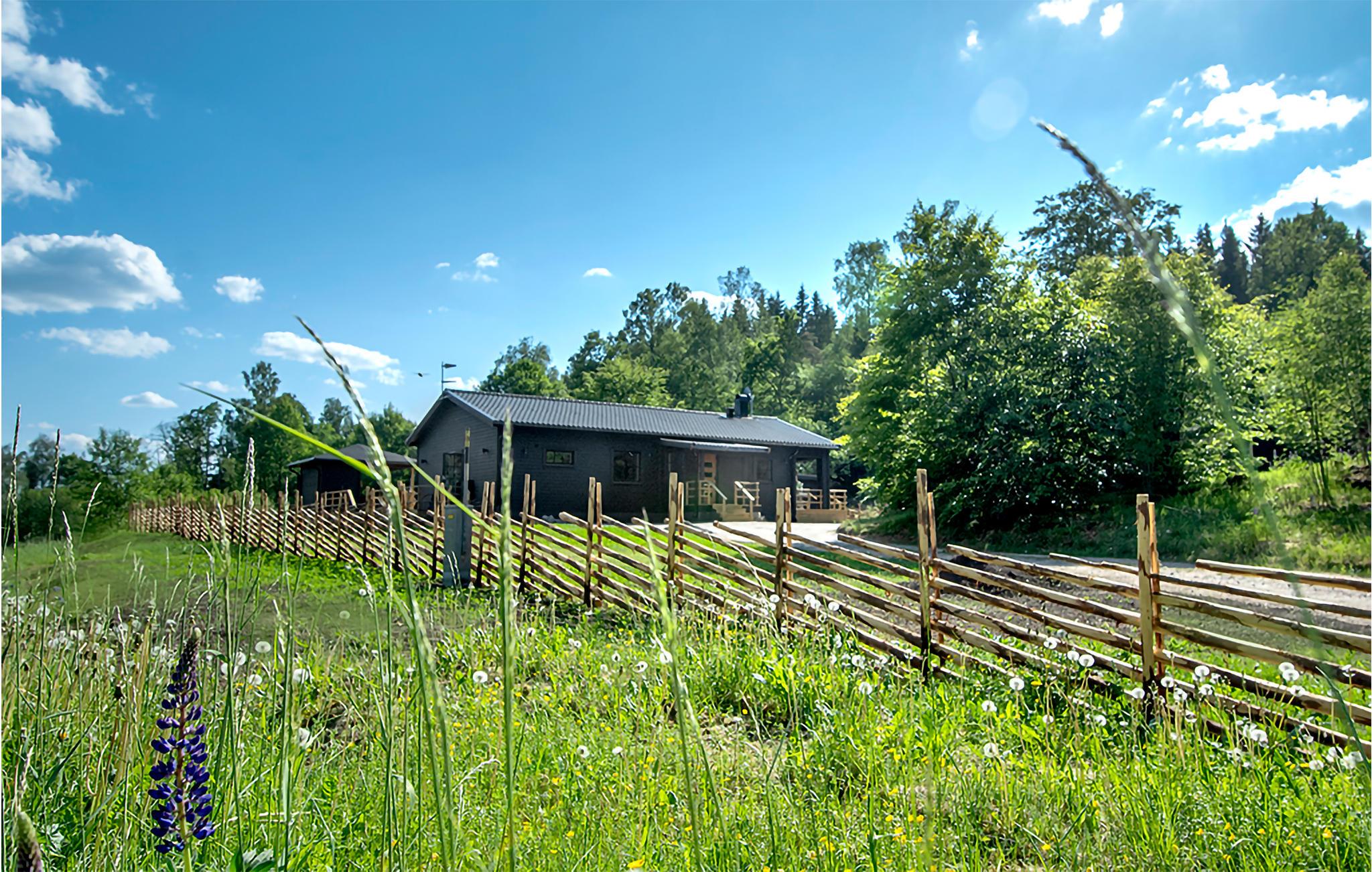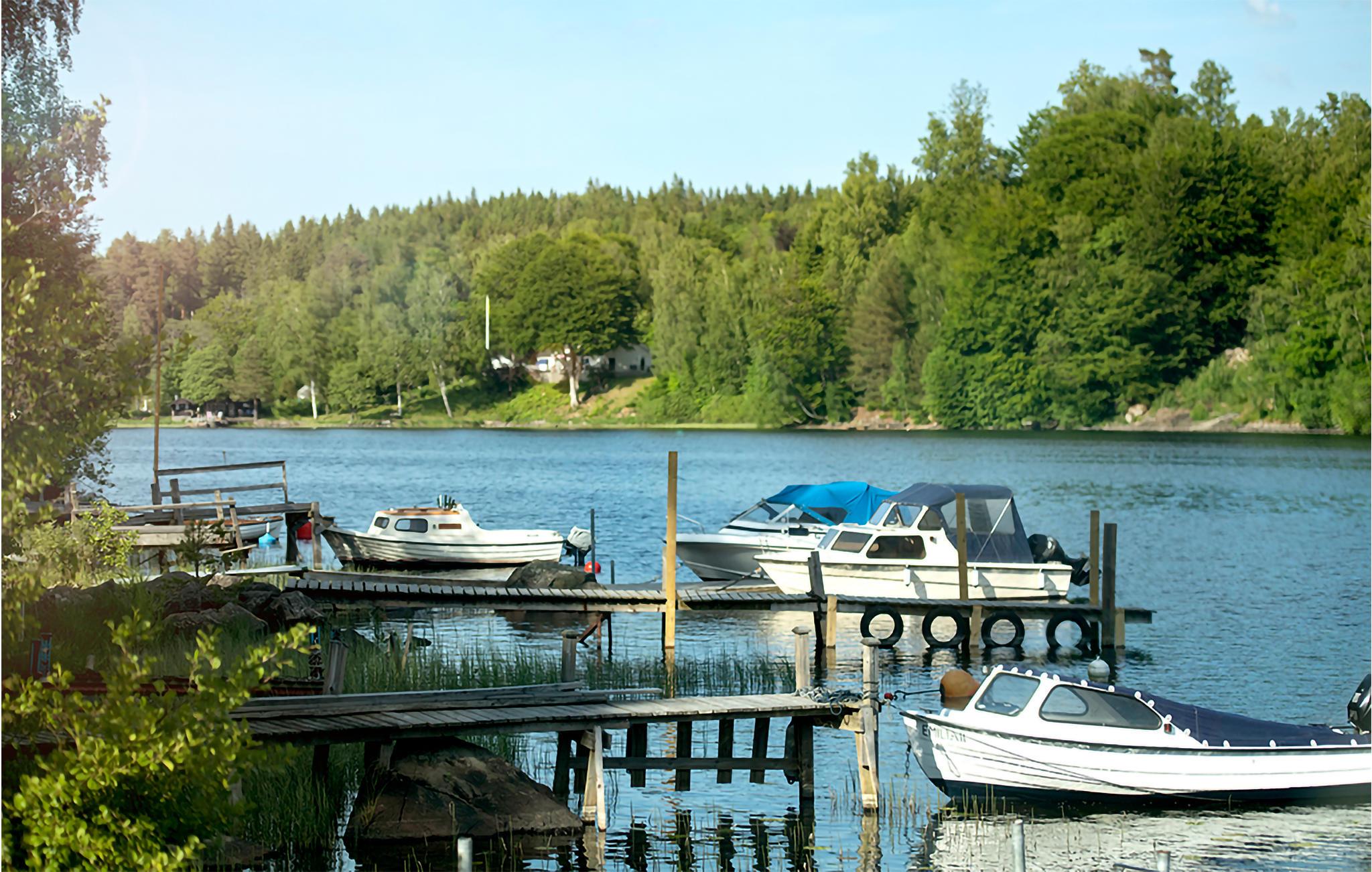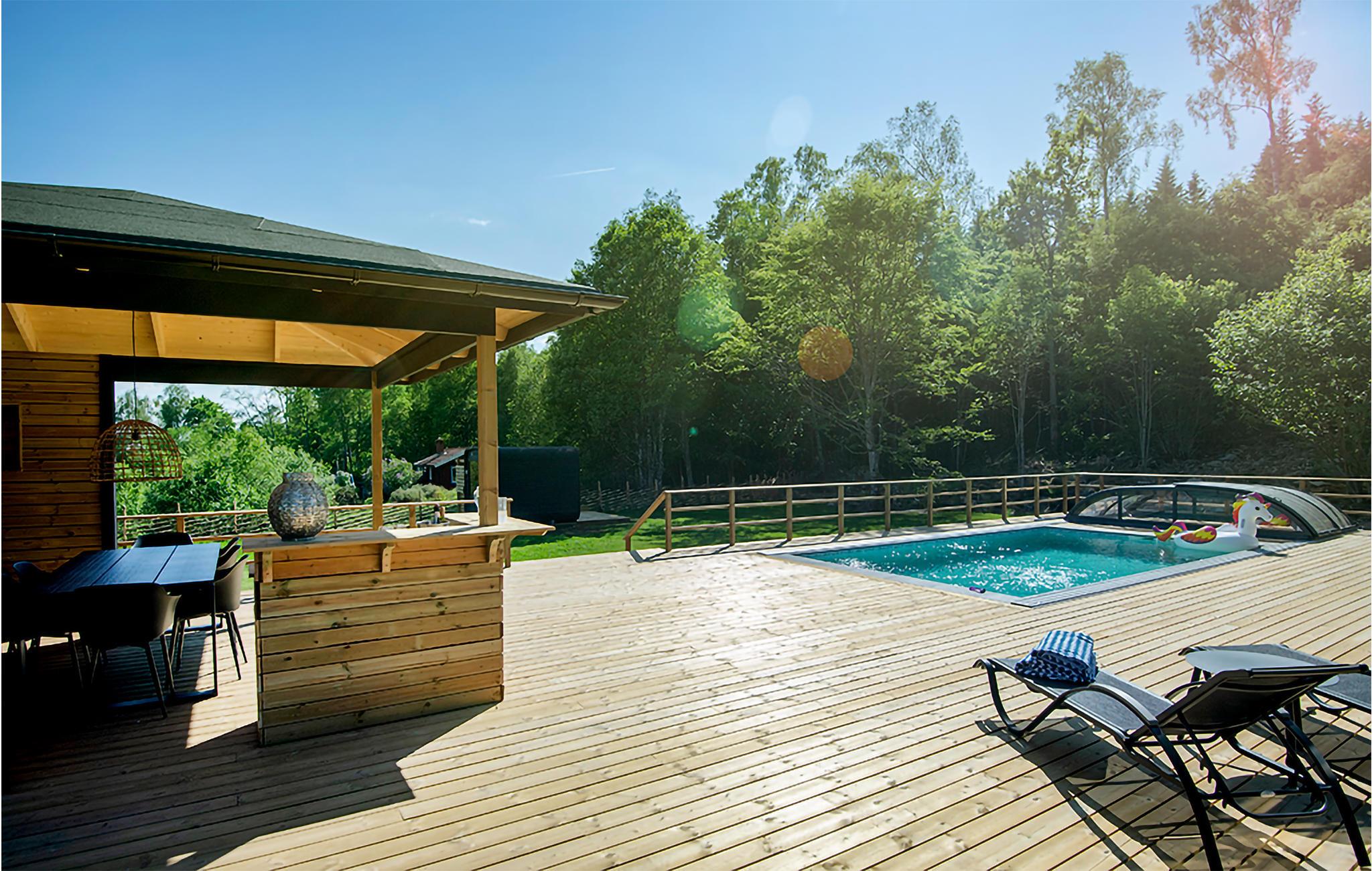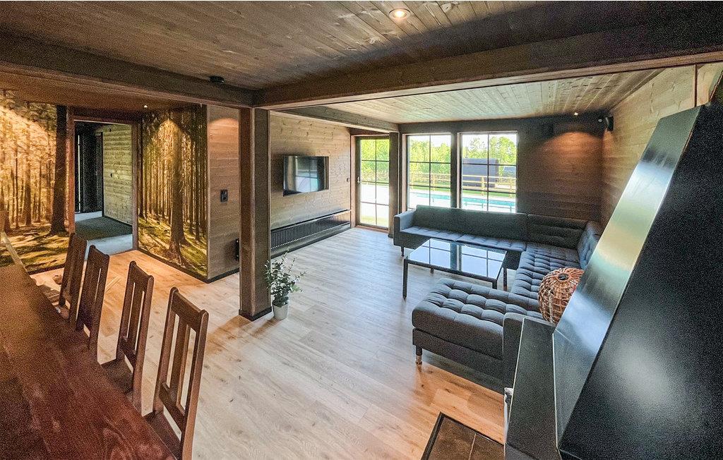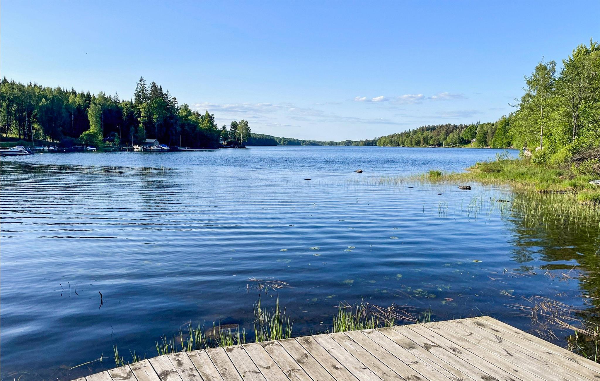 Omgitt av vakker natur og med gangavstand til innsjøen Tolken ligger dette luksuriøse feriehuset med basseng, badstue og egen båt. Det er rett og slett det perfekte stedet for sportsfiskere og naturelskere. I huset møter moderne minimalisme tresjarm. Det stemningsfulle tapetet gjenspeiler også nærheten til naturen. På det store kjøkkenet kan små og store kokker trylle sammen og servere maten uten problemer på det vakre bordet i heltre like ved. Barna kan plaske og svømme i det oppvarmede bassenget, som er beskyttet mot innsyn. Senere kan du unne deg litt velvære i badstuen. I kveld kan dere samles på den overbygde terrassen og nyte en deilig grillfest. Ikke glem fiskegarn og forstørrelsesglass til barna. Kanskje lærer du barna dine å fiske i morgen? Gå de få skrittene ned til innsjøen og prøv fiskelykken. Du kan også ta deg en svømmetur i Tolken.