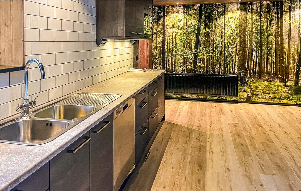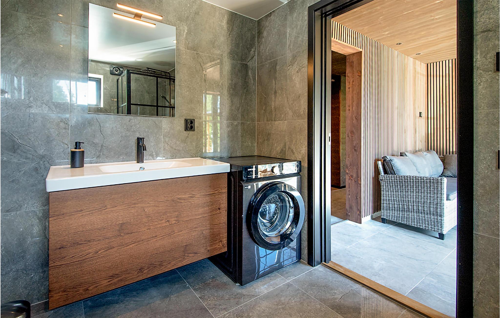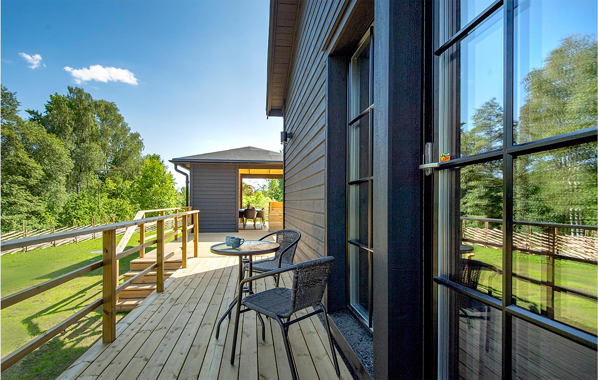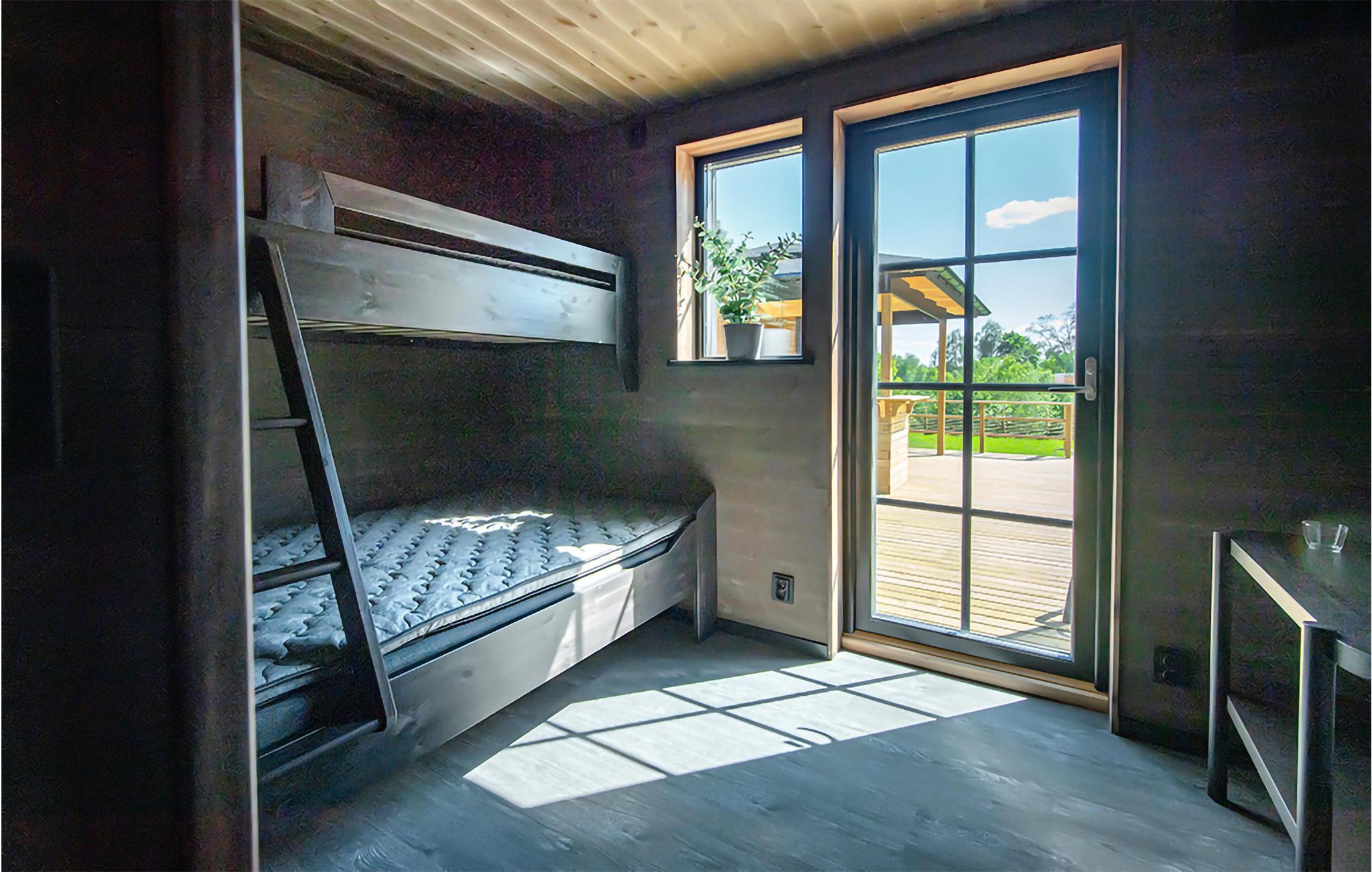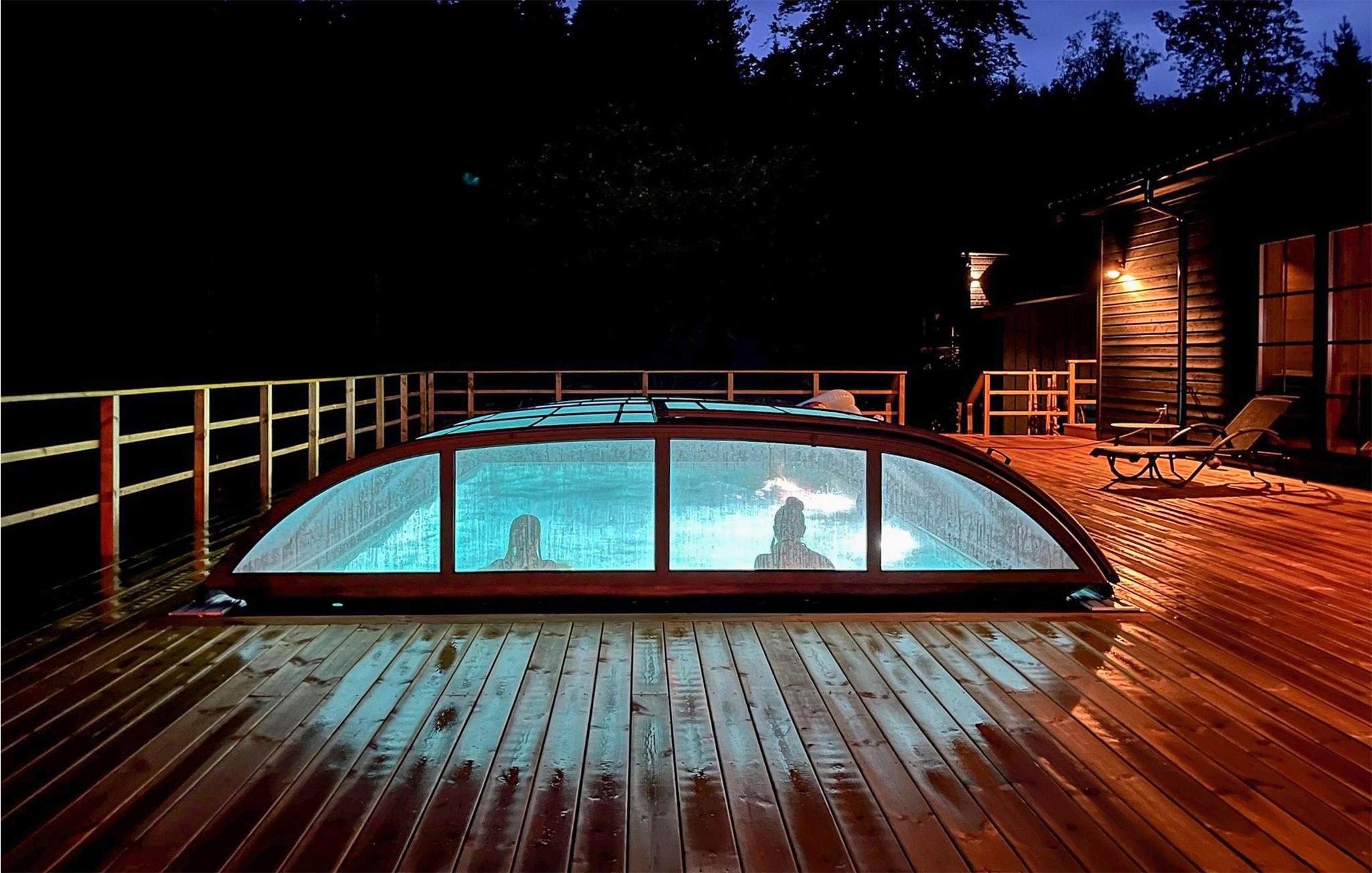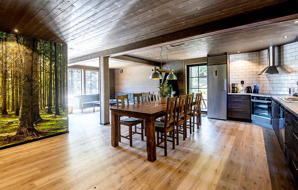 Omgitt av vakker natur og med gangavstand til innsjøen Tolken ligger dette luksuriøse feriehuset med basseng, badstue og egen båt. Det er rett og slett det perfekte stedet for sportsfiskere og naturelskere. I huset møter moderne minimalisme tresjarm. Det stemningsfulle tapetet gjenspeiler også nærheten til naturen. På det store kjøkkenet kan små og store kokker trylle sammen og servere maten uten problemer på det vakre bordet i heltre like ved. Barna kan plaske og svømme i det oppvarmede bassenget, som er beskyttet mot innsyn. Senere kan du unne deg litt velvære i badstuen. I kveld kan dere samles på den overbygde terrassen og nyte en deilig grillfest. Ikke glem fiskegarn og forstørrelsesglass til barna. Kanskje lærer du barna dine å fiske i morgen? Gå de få skrittene ned til innsjøen og prøv fiskelykken. Du kan også ta deg en svømmetur i Tolken.