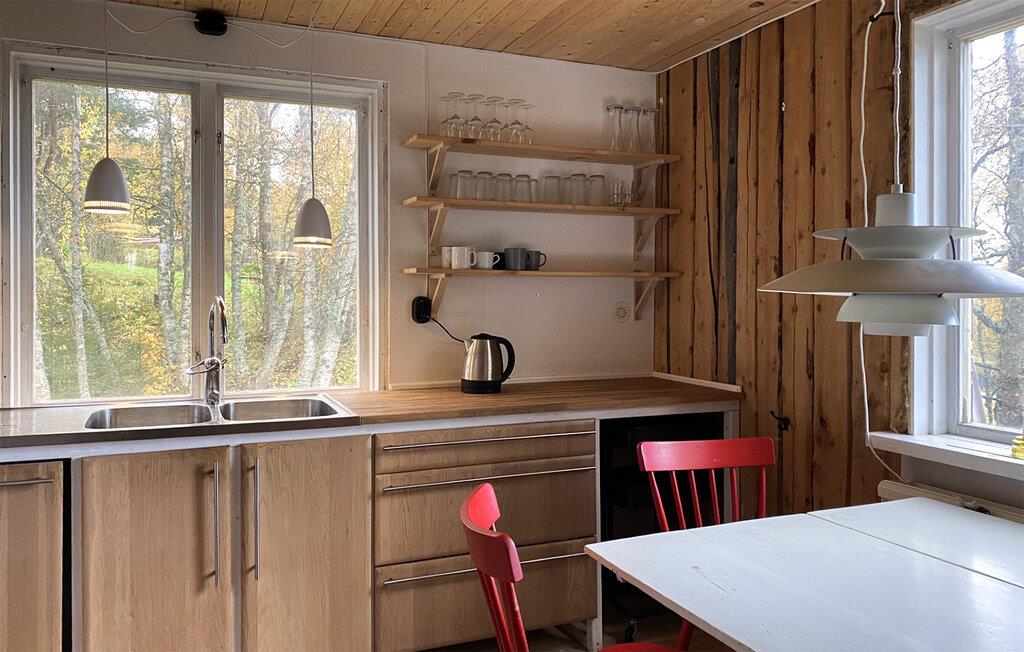 Gå inn i interiøret og opplev en klar, naturlig design med mye treverk og varme farger. Stuen innbyr til avslapping med en komfortabel sofa og en fredelig atmosfære. Slå deg ned, les en bok eller la blikket vandre gjennom de store vinduene. Tilbered måltidene dine i fred og ro og nyt dem ved det lille spisebordet. På kjøligere dager sørger vedovnen for behagelig varme og understreker husets koselige karakter.