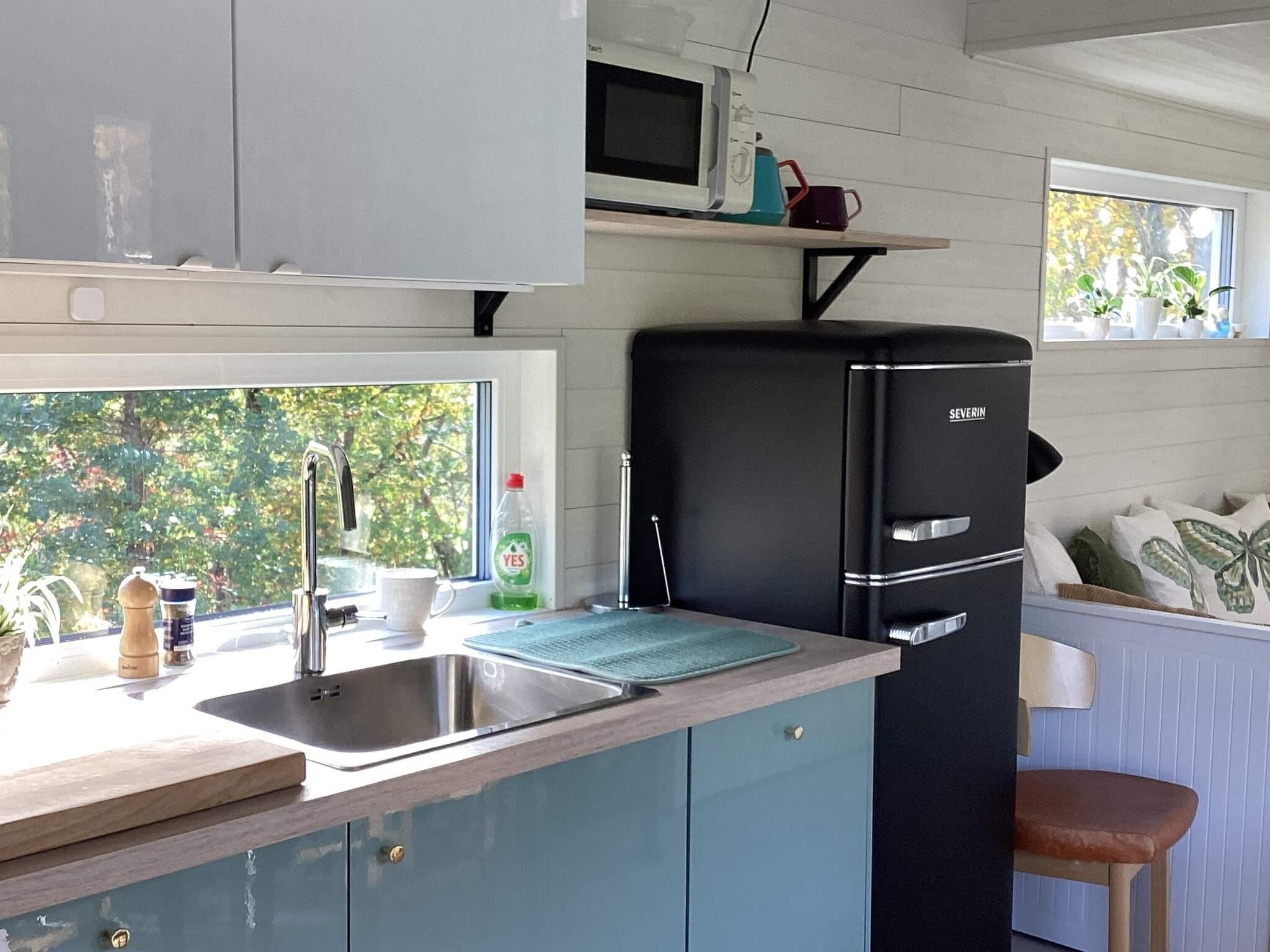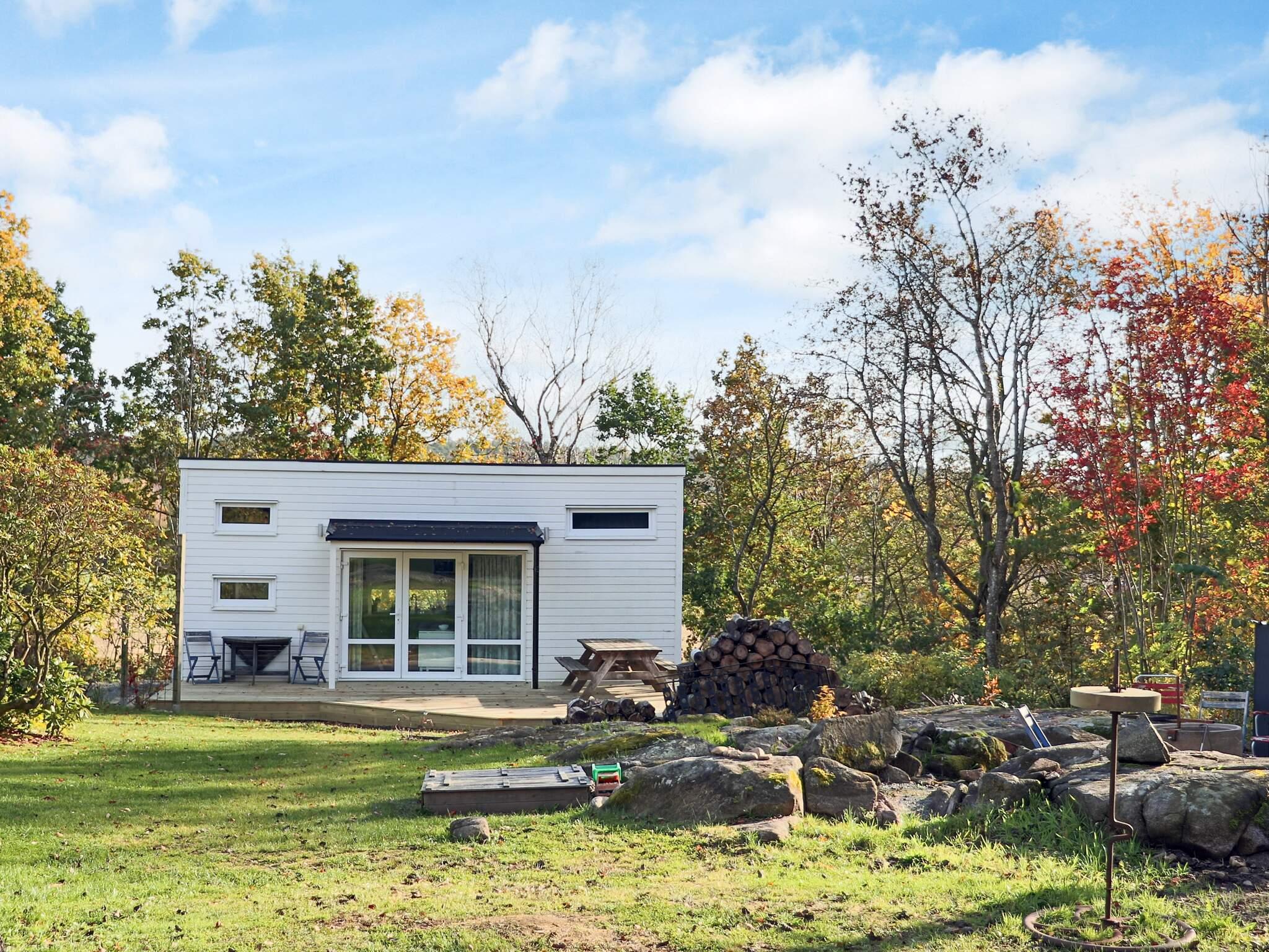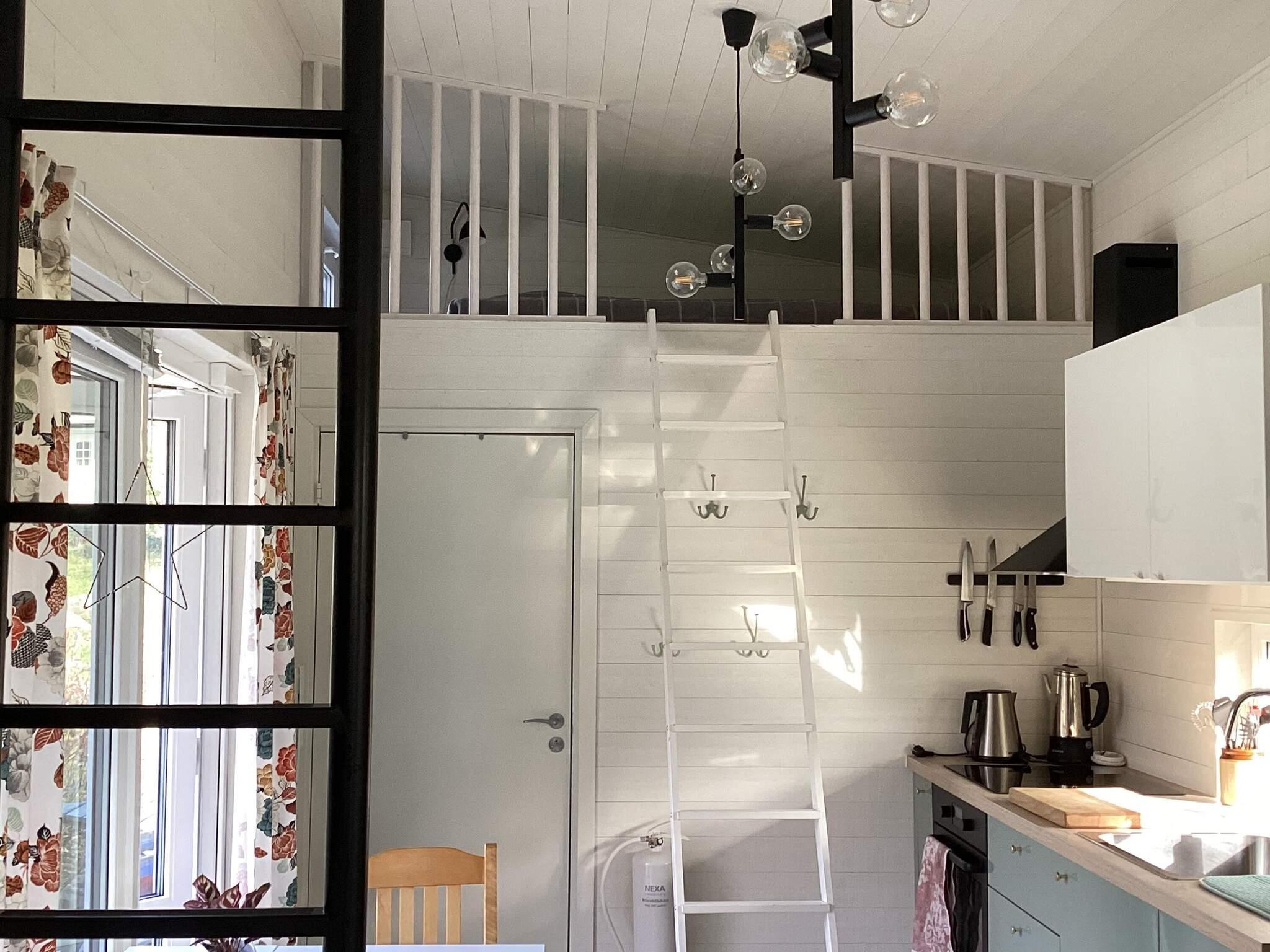I huset finns ett rymligt vardagsrum och öppet, välutrustat kök. Här finns en dagbädd för två personer, ett matbord och en modern TV med chromecast. Det är gratis wifi. Badrummet är ljust och har dusch och tvättmaskin. Det finns två sovloft med stege upp och här finns en enkelsäng 120 cm bred och på andra loftet en säng som är 140 cm bred. På stugans framsida finns en generös terrass med utemöbler. Intill stugan finns en härlig lite grillplats. Ägaren erbjuder laddning av elbil, betalning enligt överenskommelse på plats.