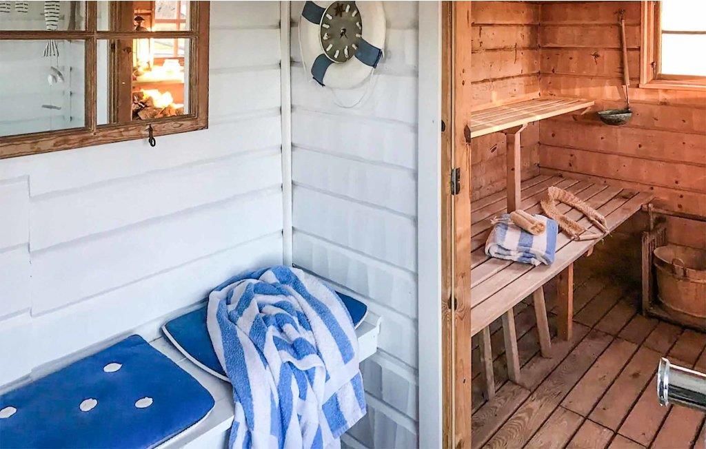 Feriehus med badstue og utendørs boblebad rett ved vannet.