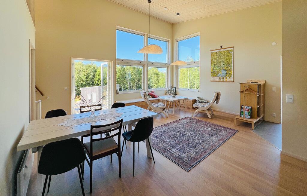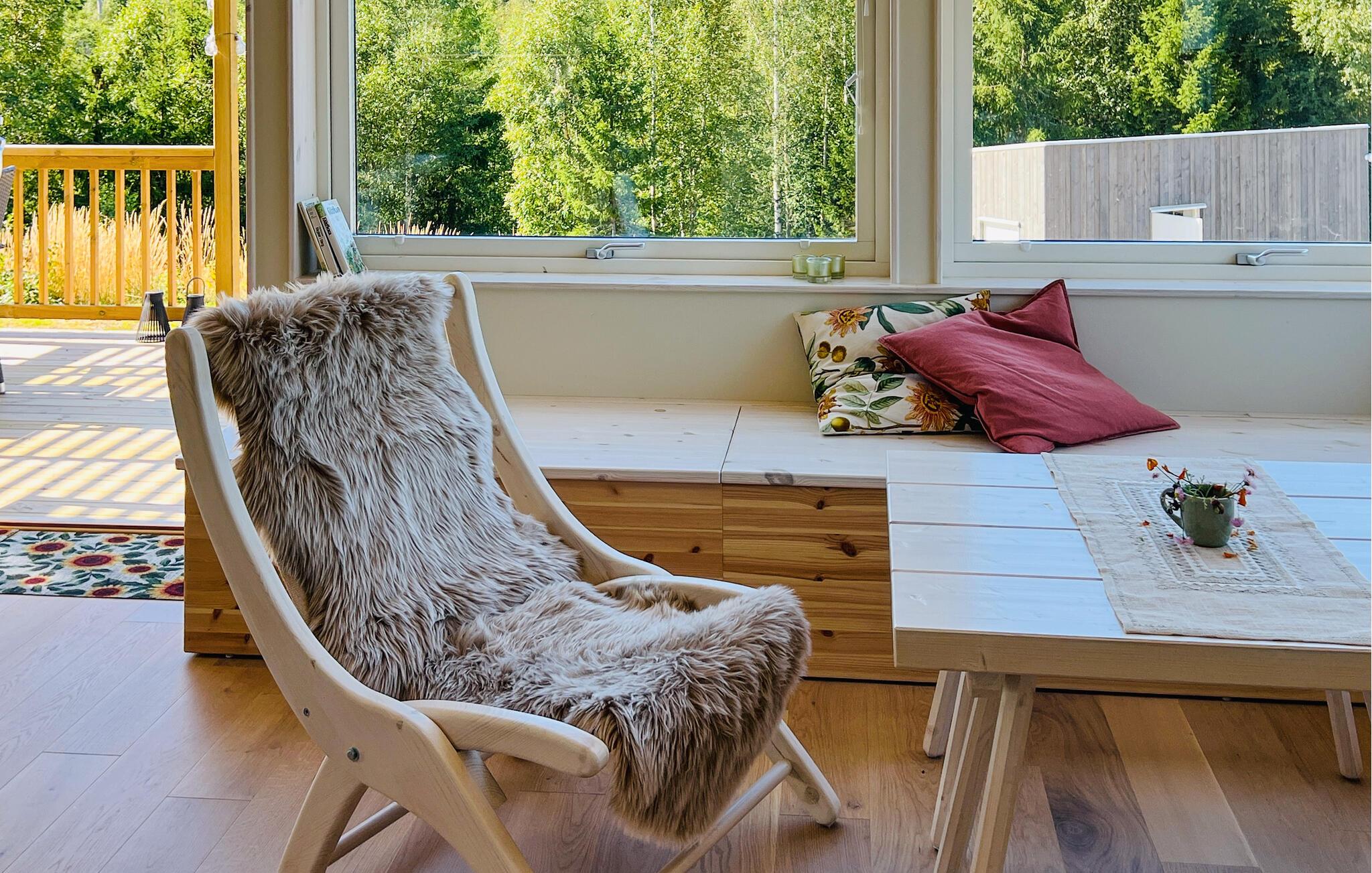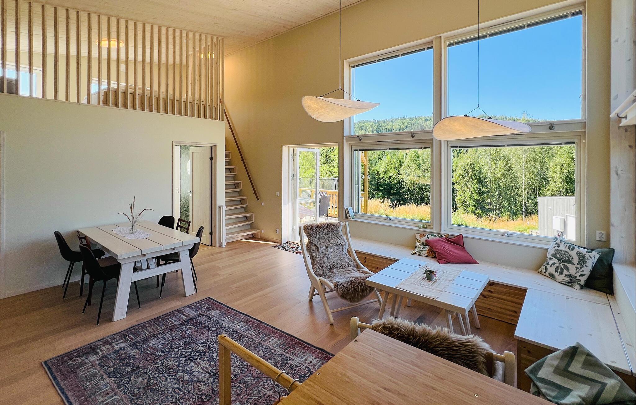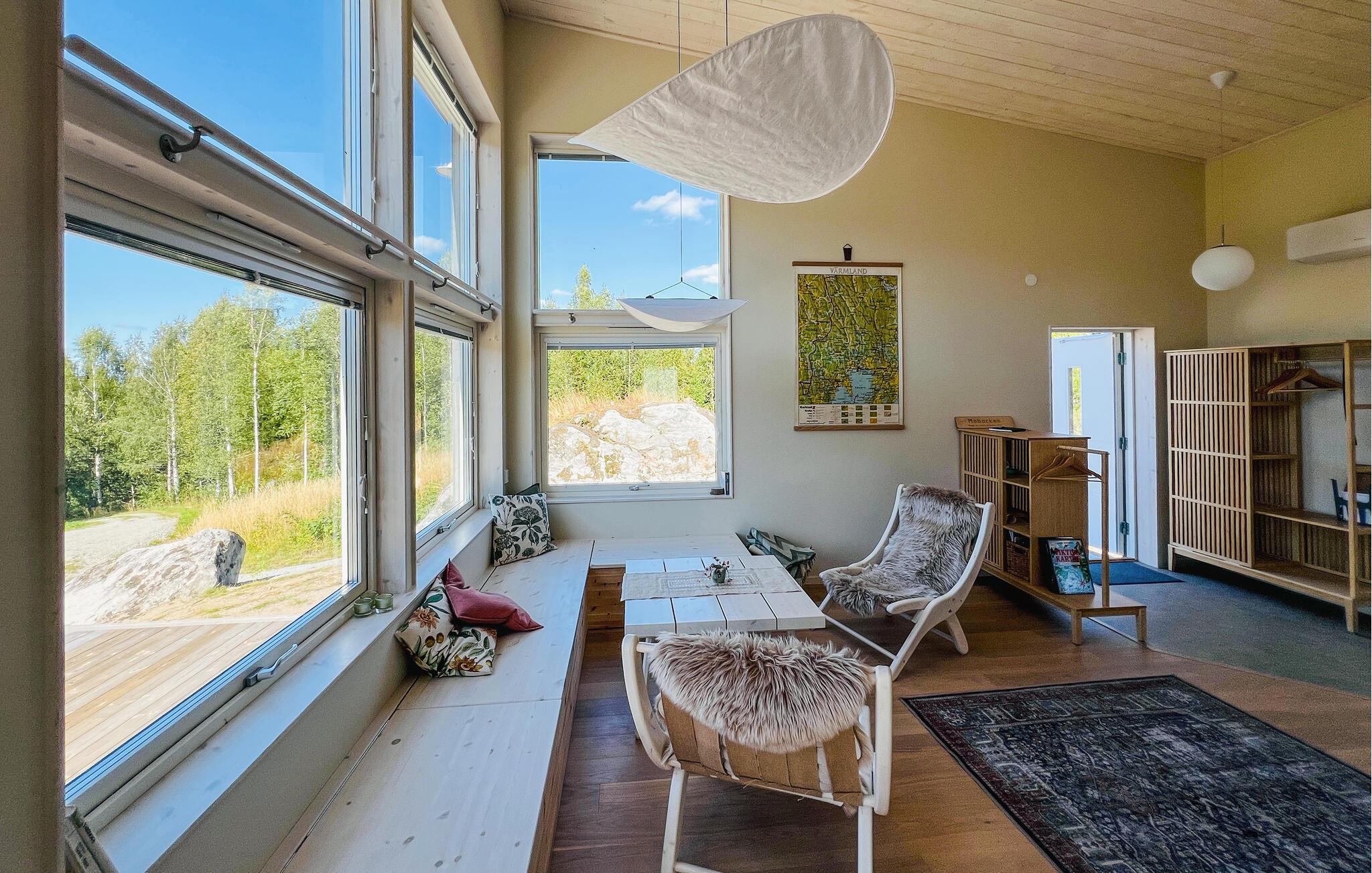Dette sjarmerende feriehuset består av et hovedhus og et gjestehus, og tilbyr god plass til en større familie. Huset ligger på en høyde og er omgitt av tett skog, slik at du kan nyte fred og privatliv her. Store vindusflater gir utsikt over de grønne omgivelsene og sørger for rikelig med naturlig dagslys i det smakfullt innredede interiøret. Lag deilige måltider i det åpne kjøkkenet, og nyt den beroligende atmosfæren under harmoniske måltider. Gled deg til rolige lesestunder og koselige spillkvelder med hele familien.