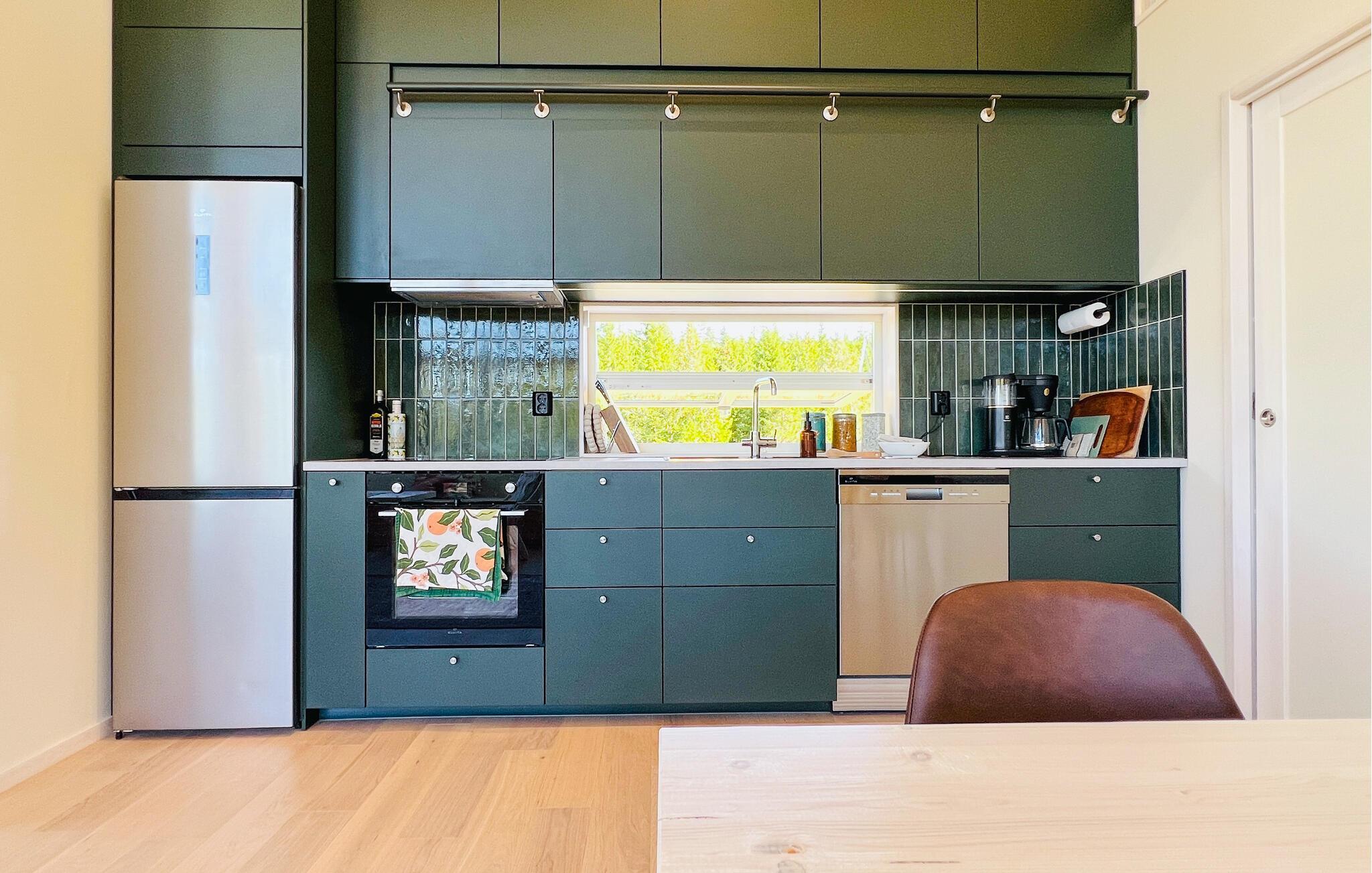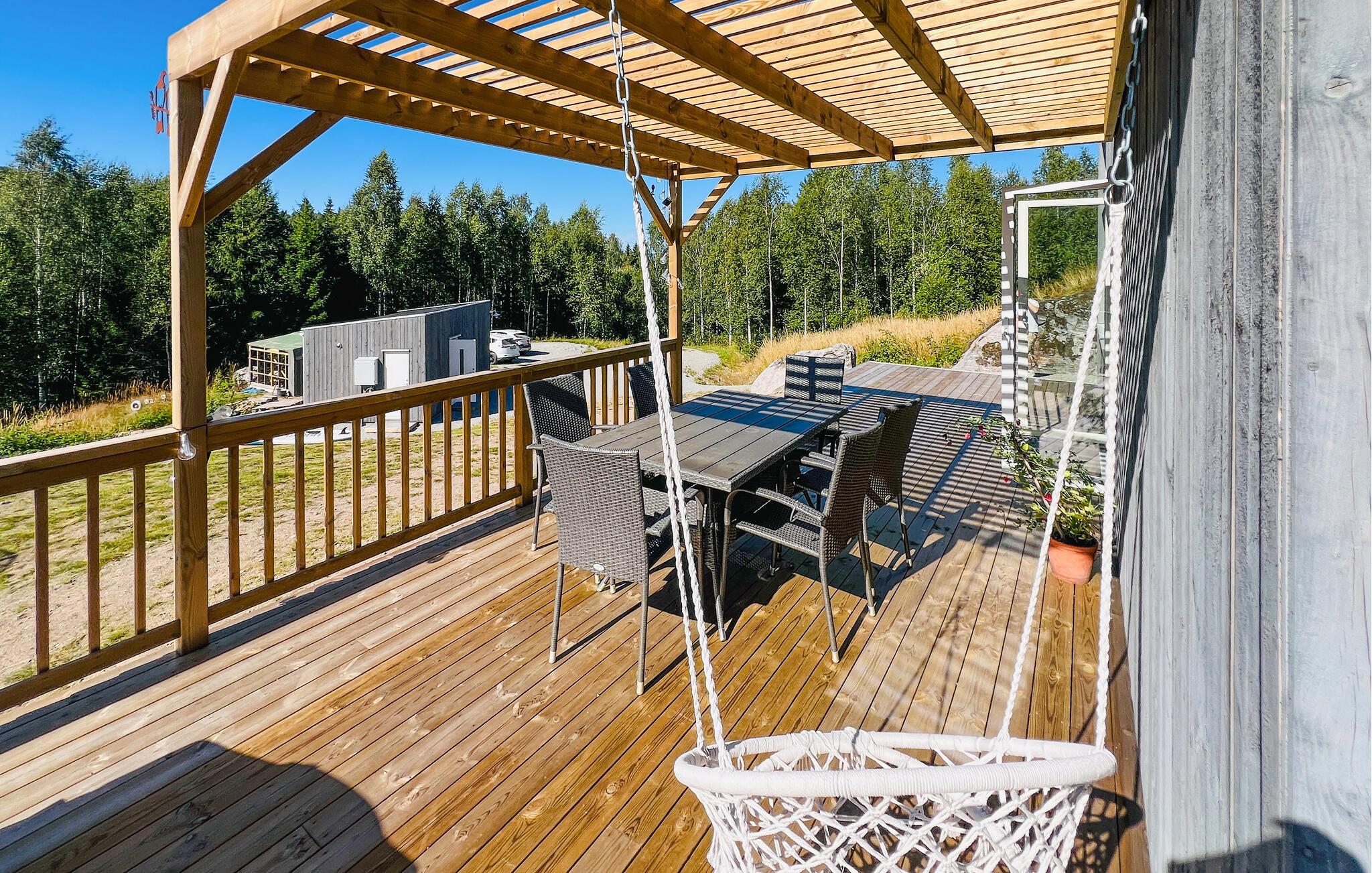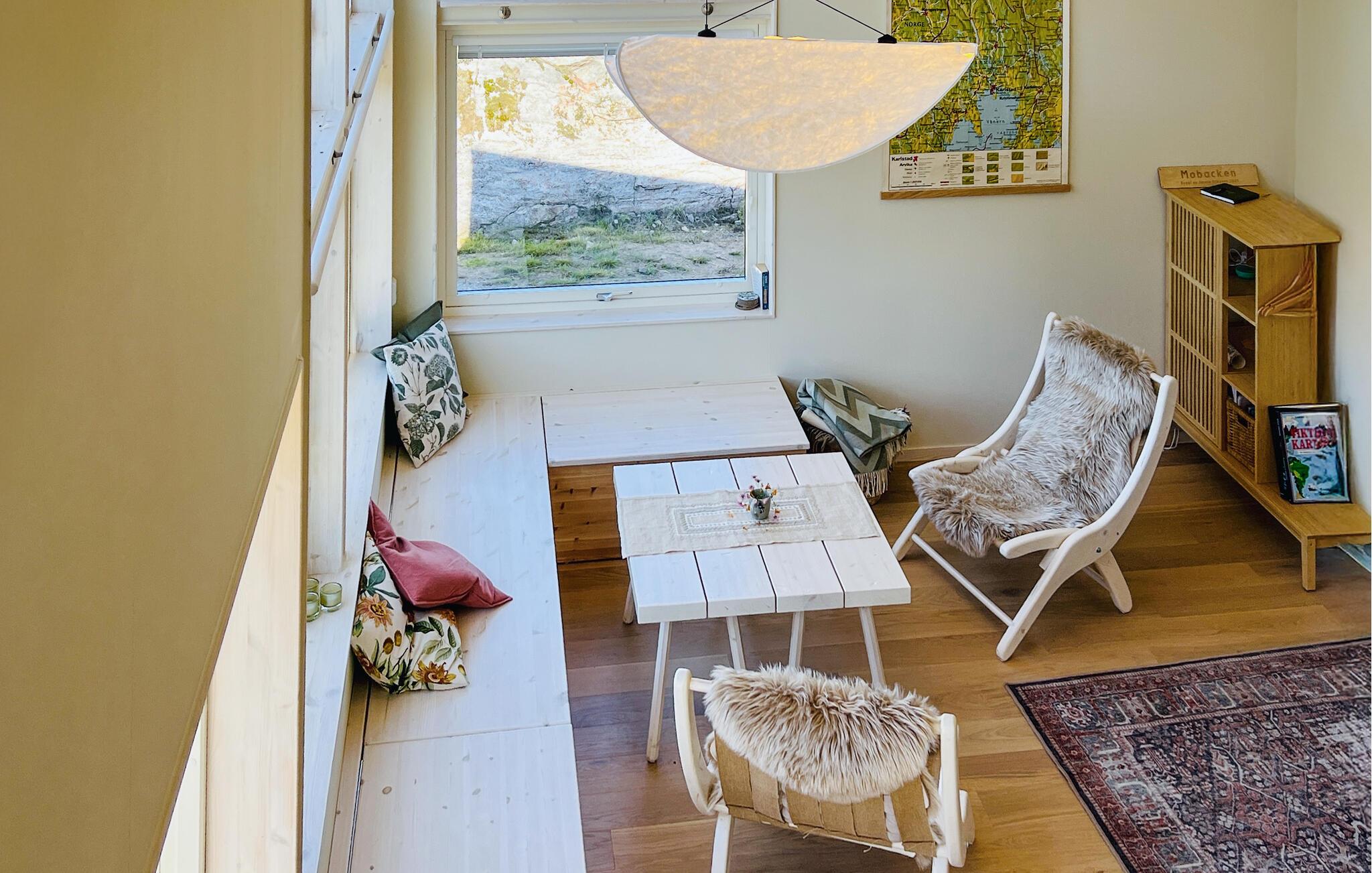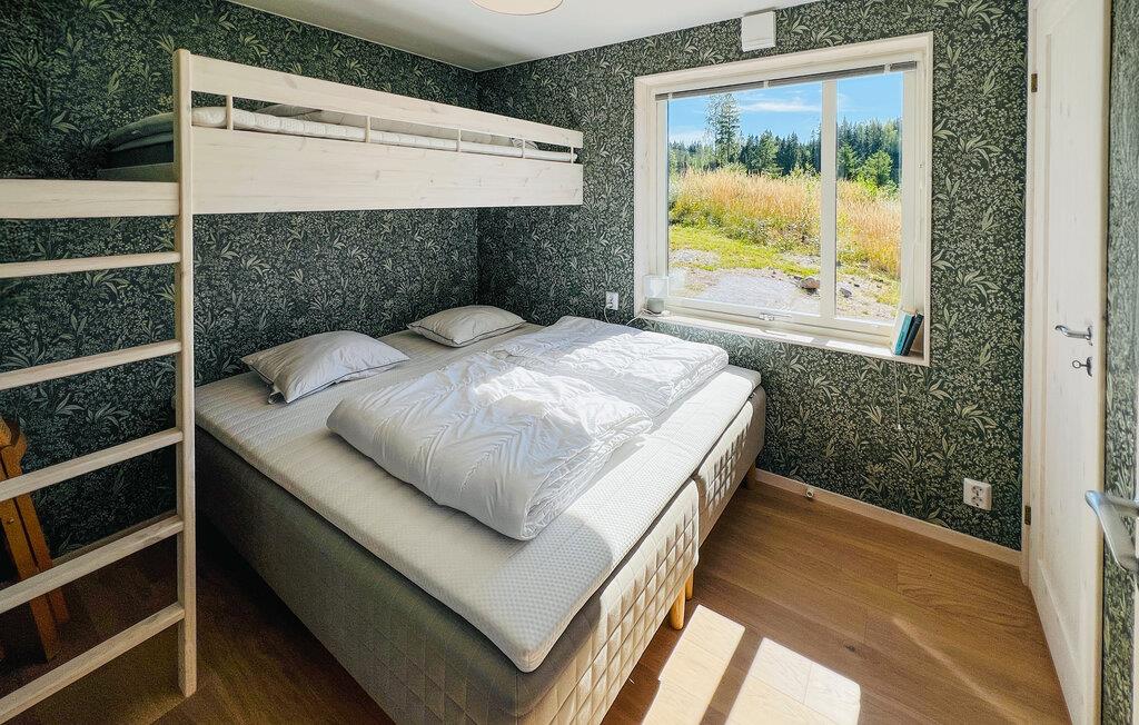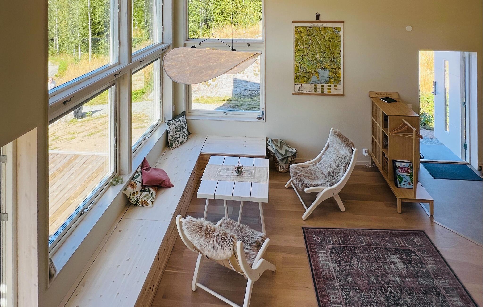 Dette sjarmerende feriehuset består av et hovedhus og et gjestehus, og tilbyr god plass til en større familie. Huset ligger på en høyde og er omgitt av tett skog, slik at du kan nyte fred og privatliv her. Store vindusflater gir utsikt over de grønne omgivelsene og sørger for rikelig med naturlig dagslys i det smakfullt innredede interiøret. Lag deilige måltider i det åpne kjøkkenet, og nyt den beroligende atmosfæren under harmoniske måltider. Gled deg til rolige lesestunder og koselige spillkvelder med hele familien.
