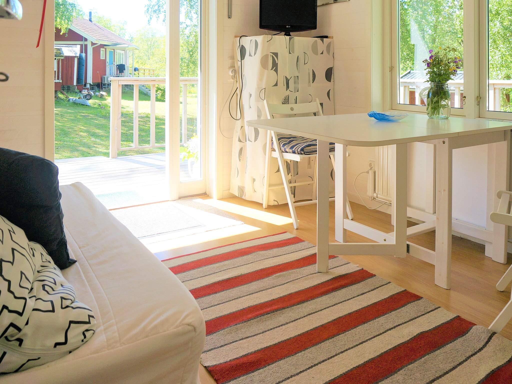 Stugan är byggd 2012 och är mycket välplanerad. Ni möts av en stor inbjudande altan med utemöbler där man kan sitta efter behag och efter solens gång. I stugan finns en liten köksvrå och här finns det nödvändigaste i husgeråd. Fler tillbehör finns i hyllorna under TV:n, med bl a bestick och mikrovågsugn. Köket är kombinerat vardagsrum med en bäddsoffa 140 cm bred. Till höger finner ni badrummet med toalett och dusch. Till vänster om köksvrån finner ni sovrummet med en våningssäng 90 cm bred och garderob.