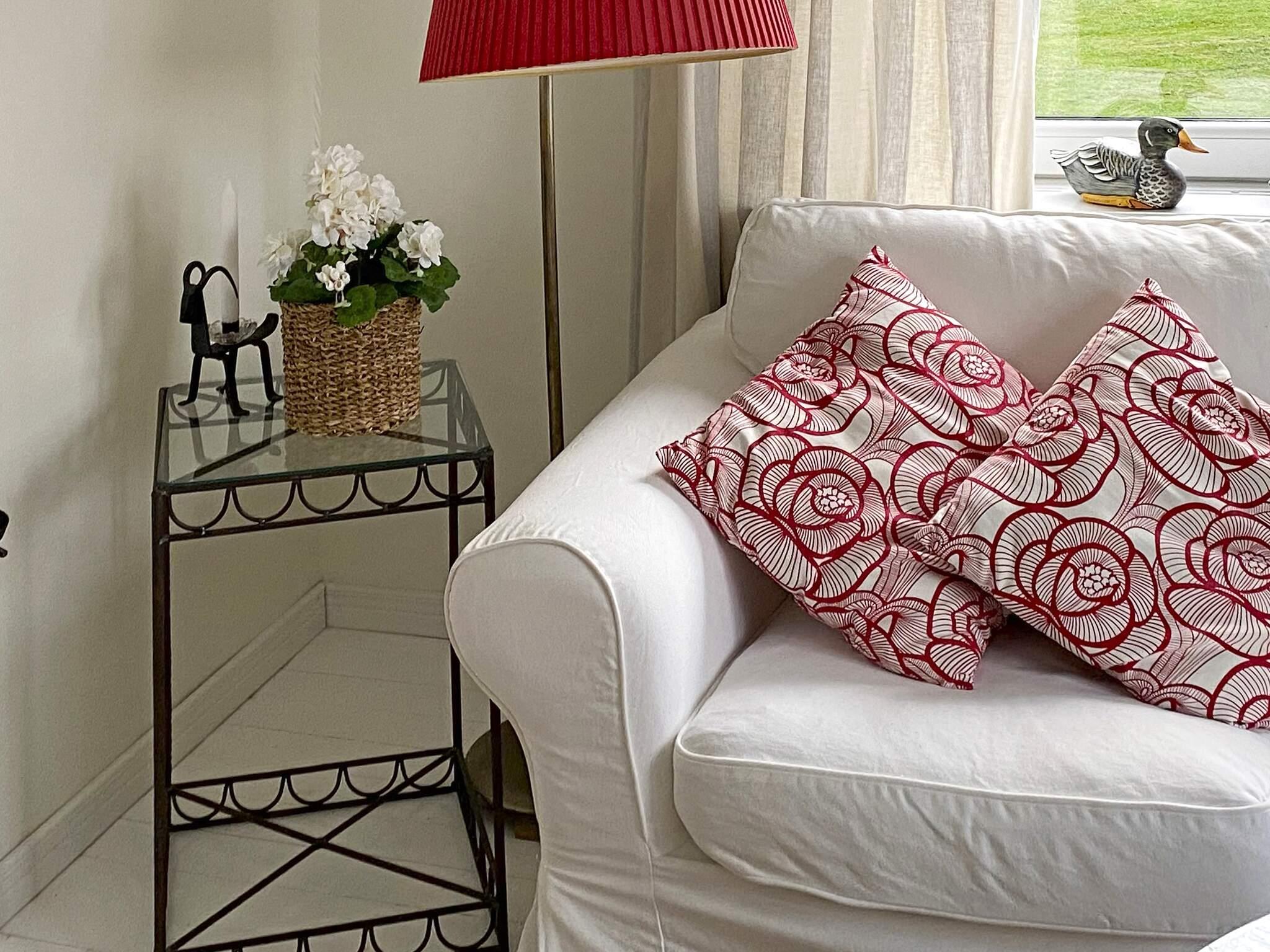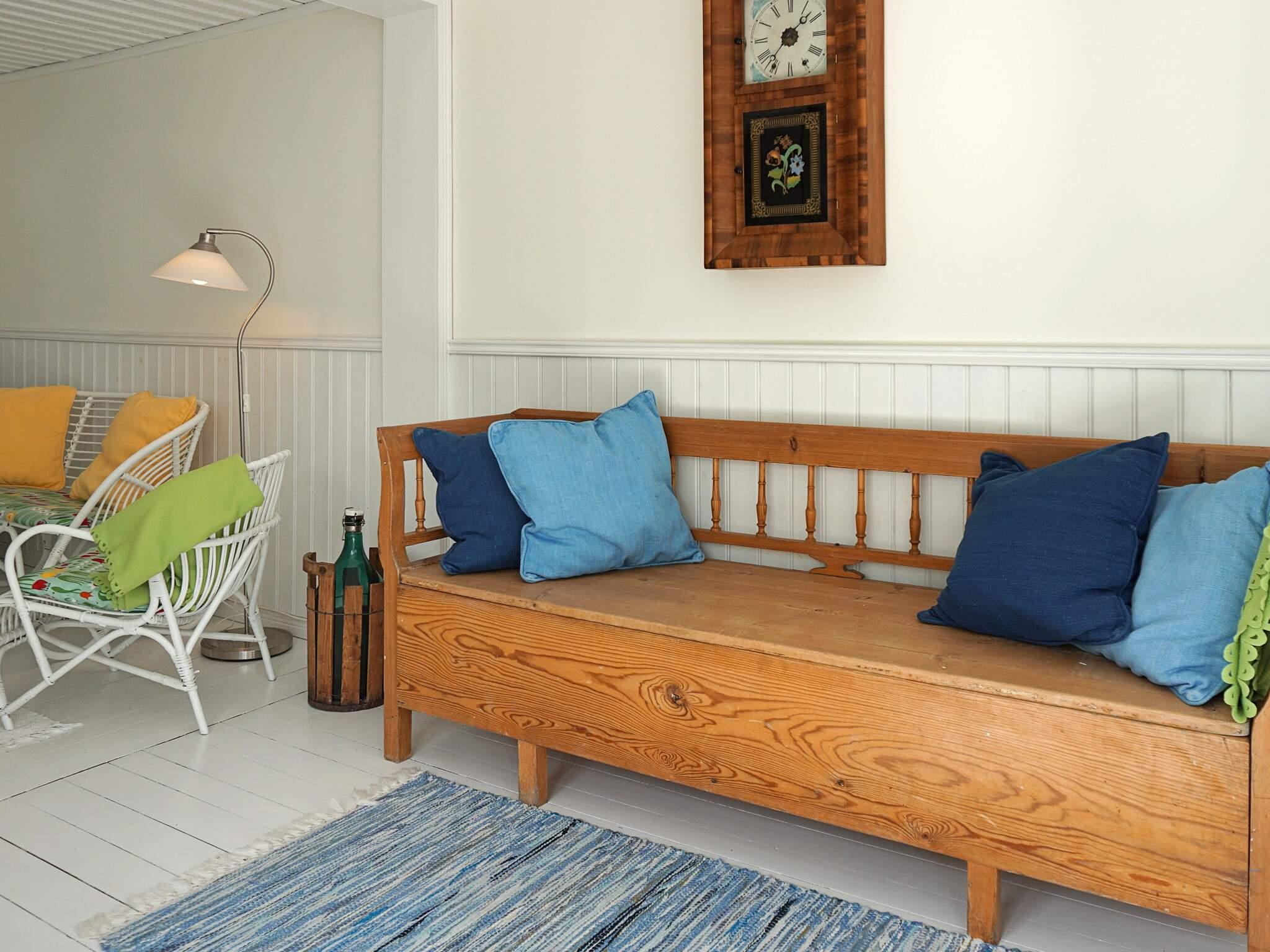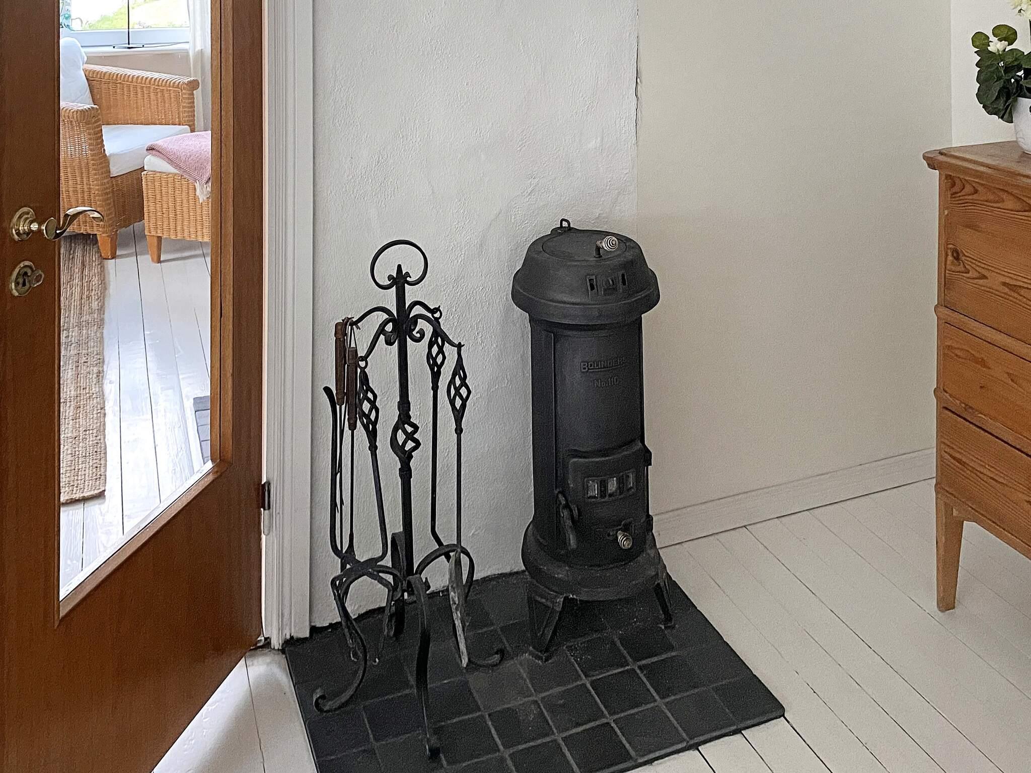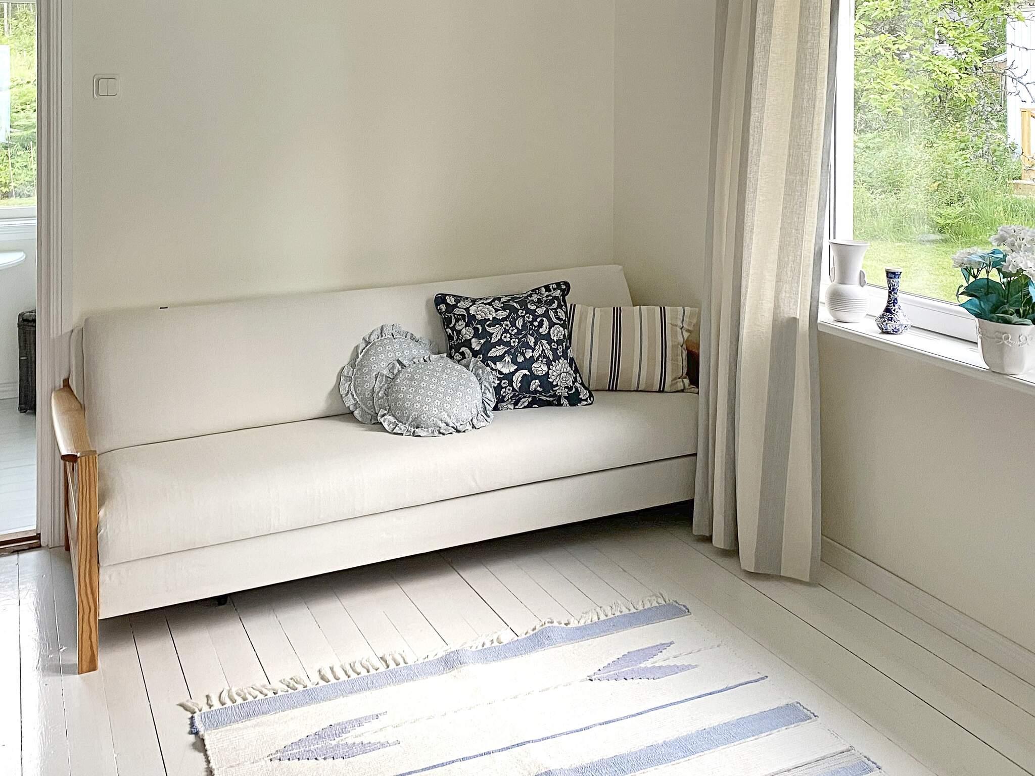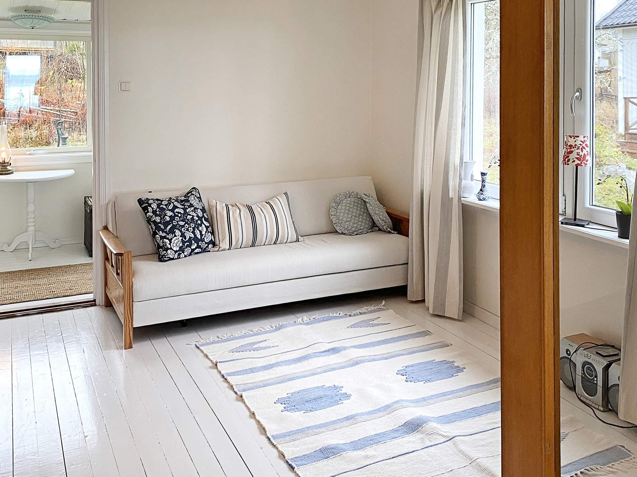 Det finns ett vardagsrum med bekväma sittmöbler och en kamin som kan höja mysfaktorn en kylig kväll när något tv-program lockar. Ett av sovrummen ligger i anslutning till vardagsrummet och har en skön dubbelsäng samt en bäddsoffa. Det andra sovrummet som ligger i andra delen på huset har en motsvarande skön dubbelsäng. Badrummet är litet men fräscht och funktionellt.