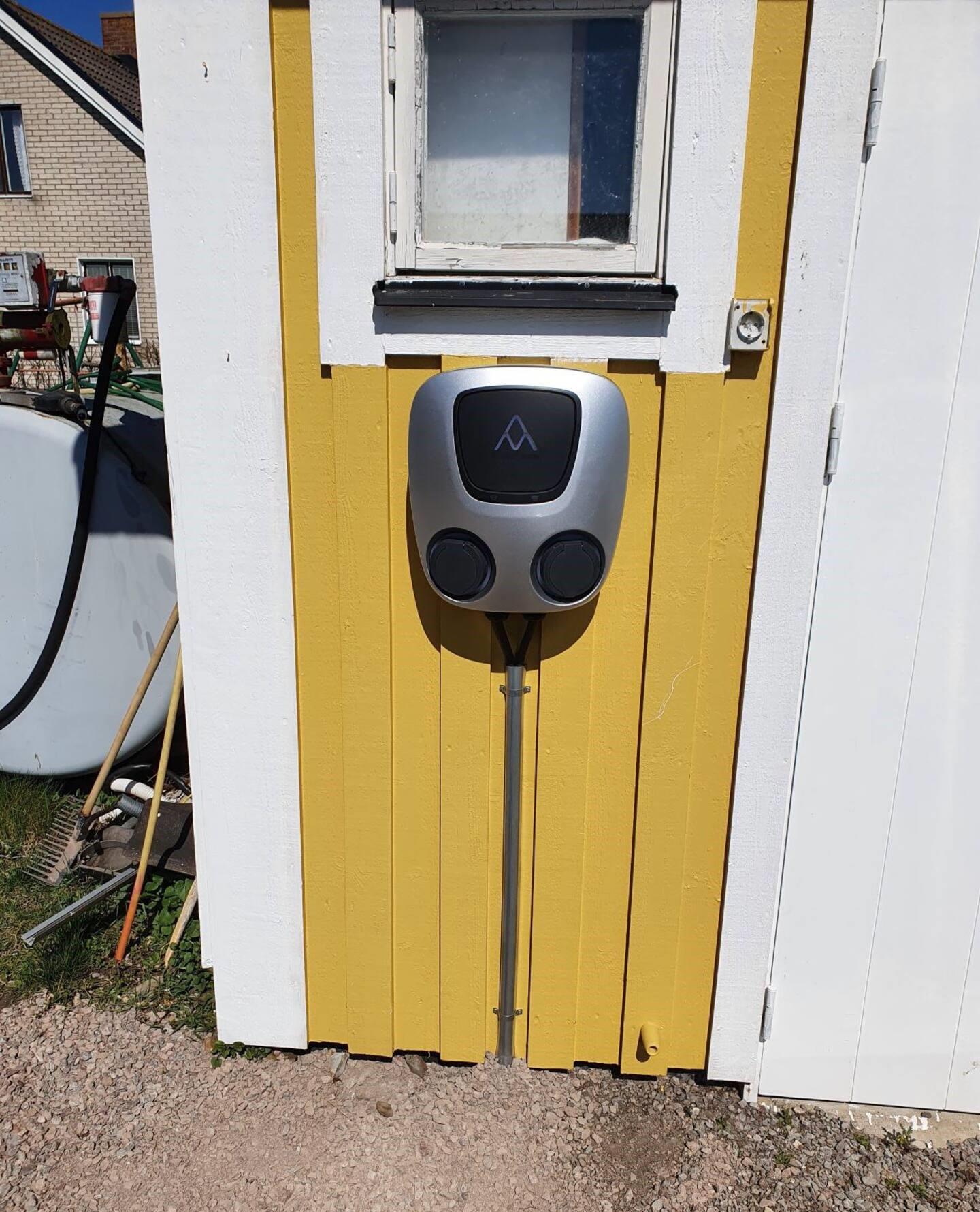 Here are 3 phase chargers for electric cars with two outlets of 17KW each. Price SEK 5 per KwH.