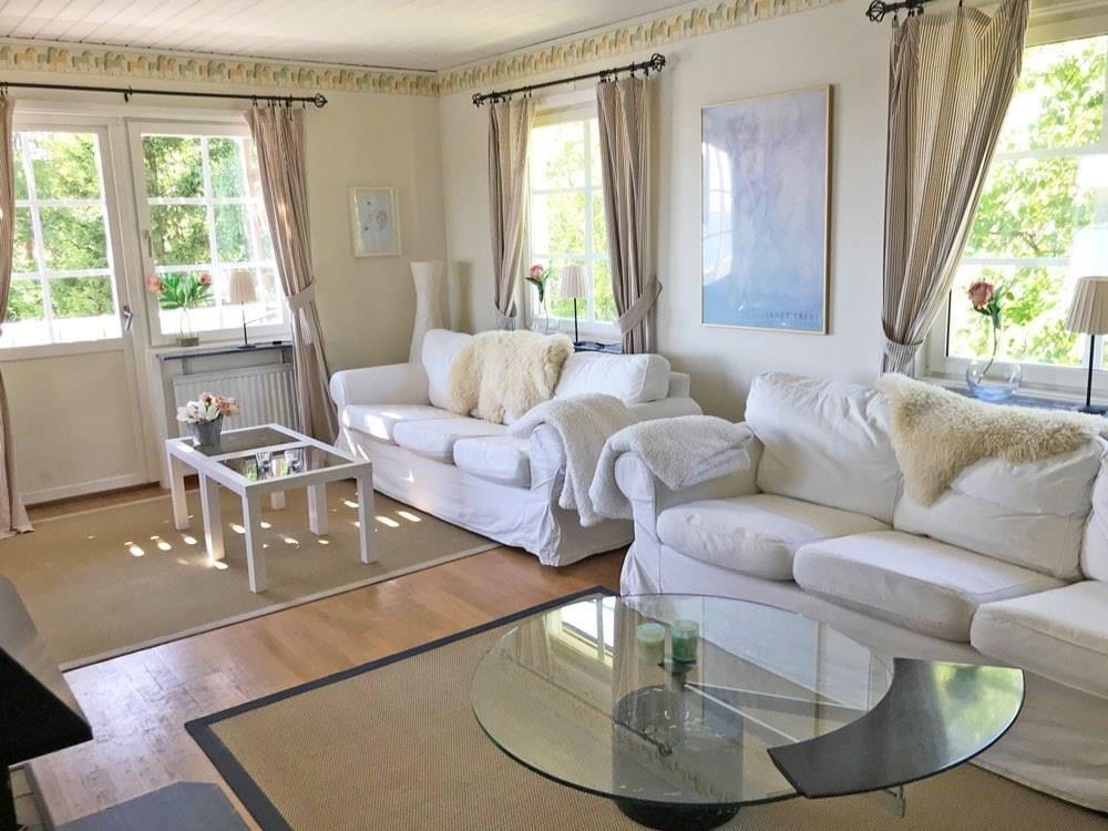 Im weitläufigen Außenbereich findest du eine große Veranda in sonniger Südlage mit herrlichem Blick auf die Ostsee, zwei kleinere überdachte Verandas, Gartenmöbel, verschiedene Sitzplätze und eine große Spiel- und Liegewiese. Ein Gartenpavillon mit Heizung und Esstisch bietet selbst an kühleren Tagen einen gemütlichen Platz mit weitem Meerblick. Zum Haus gehören außerdem zwei Kajaks und ein Ruderboot für maximal vier Personen (Schwimmwestenpflicht). Eine holzbeheizte Sauna direkt am Meer kann gegen eine Gebühr von SEK 500 pro Nutzung genutzt werden.