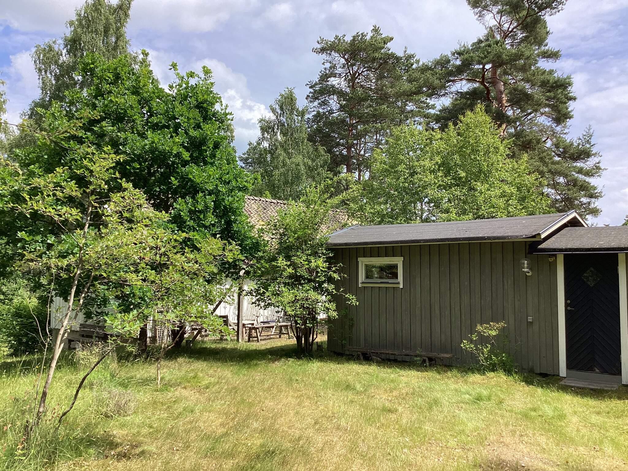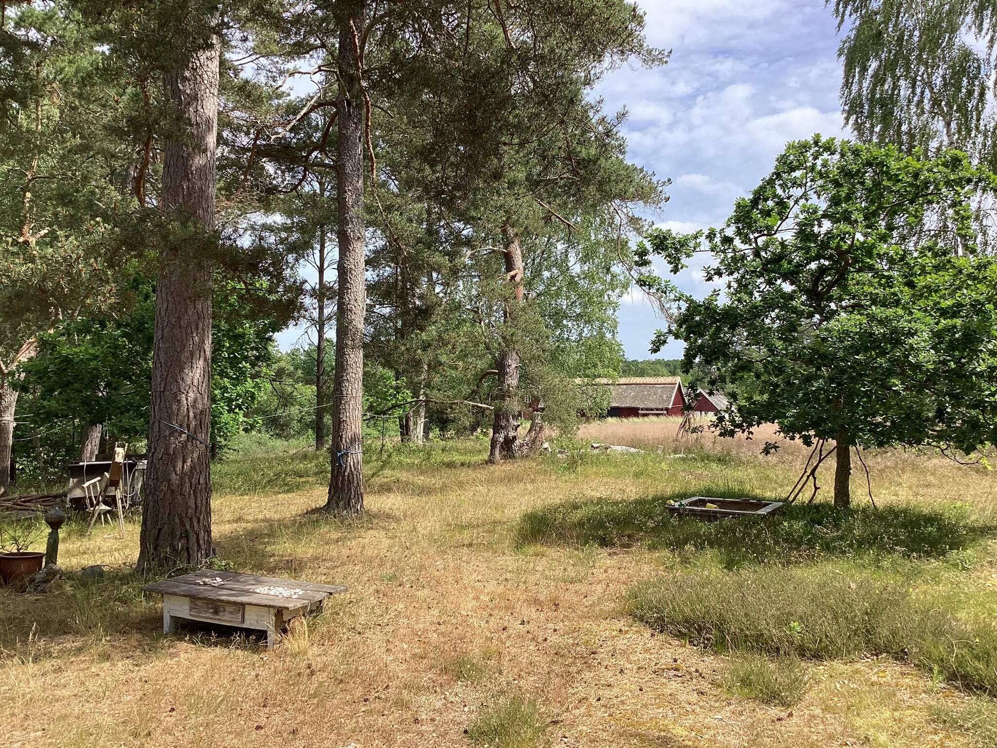 Utomhus väntar generösa gräsytor, flera sittplatser i sol och skugga, en lekstuga och gott om utrymme för barnen att springa och leka – allt omgärdat av vacker natur som inbjuder till avkoppling och upptäcktsfärder.