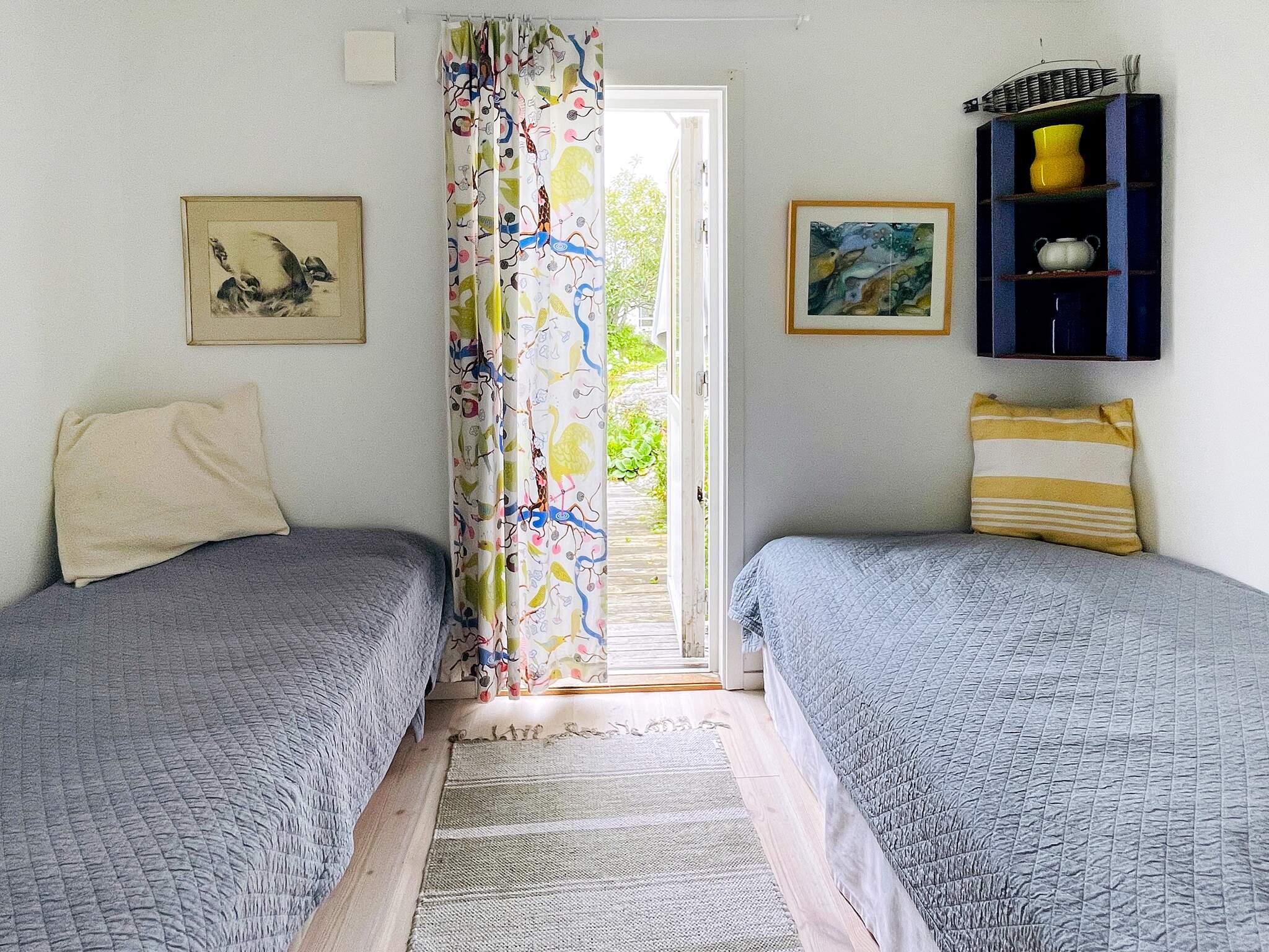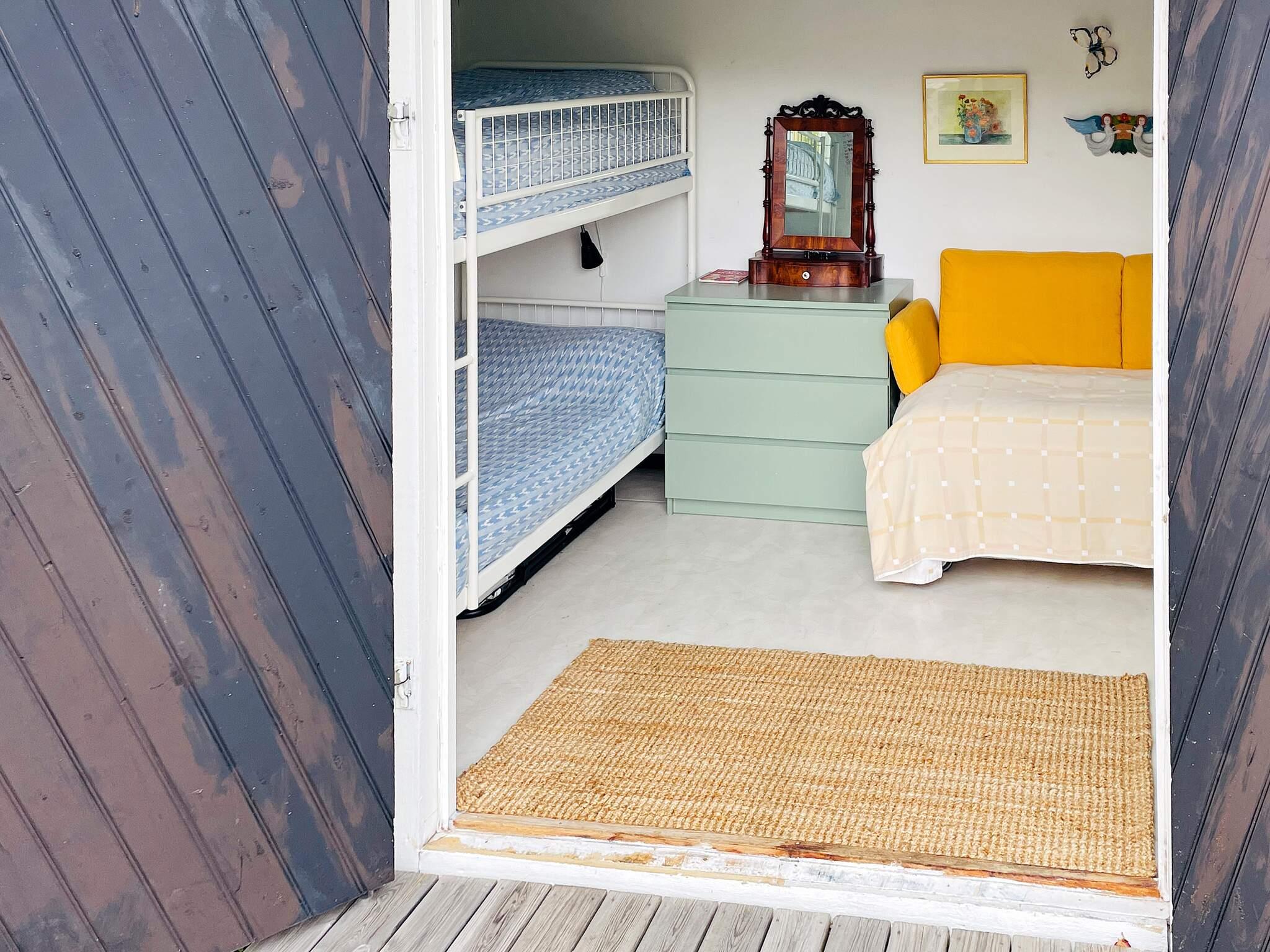 Ett av sovrummen med en dubbelsäng, två enkelsängar och möjlighet till en spjälsäng finns intill. Från köket kan du även nå en härlig altan där du kan njuta av både middagar och underbara solnedgångar. Genom det andra sovrummet, som har två enkelsängar, kan man gå ut på innergården. Här är en lugn och avkopplande plats som oftast är skyddad från vinden och omgiven av grönska. Fantastiskt att äta frukost i morgonsolen här.