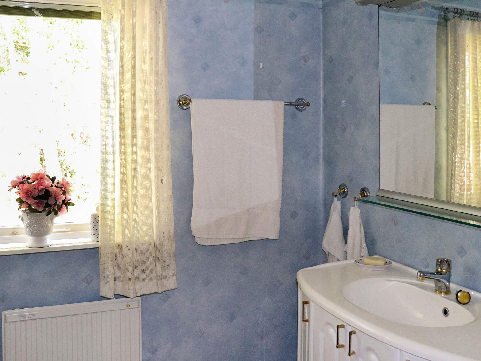 Från entrén på stugans kortsida kommer ni in i hallen. Här finns ett badrum med dusch, ett mindre sovrum med en våningssäng och ett sovrum med en dubbelsäng. Köket är ganska litet men välutrustat med en matplats. Det rymliga vardagsrummet har en hörnsoffa och ett matbord samt TV. Härifrån finns utgång till två terrasser. Den stora terrassen är delvis under tak. Här finns trädgårdsmöbler och grill.